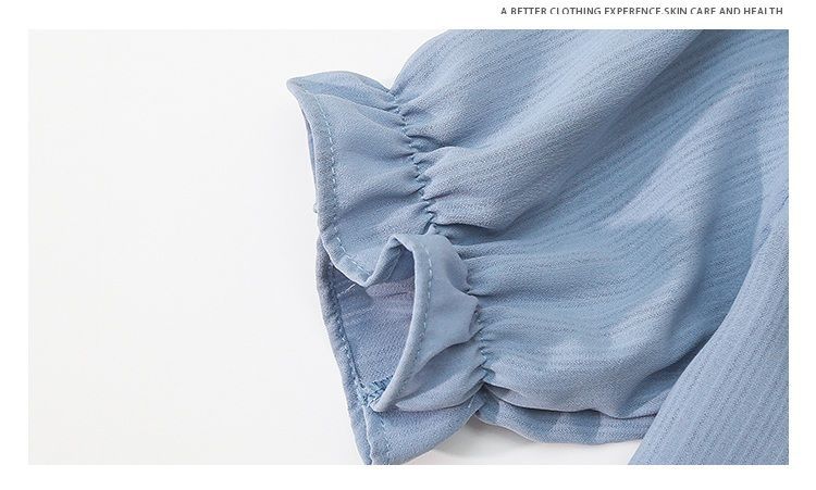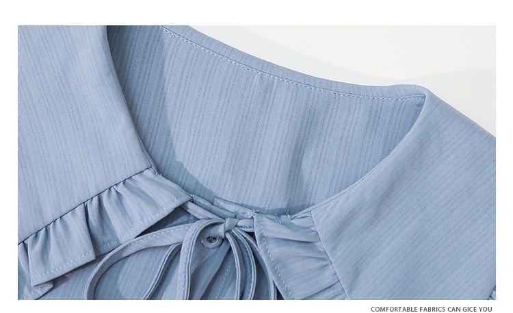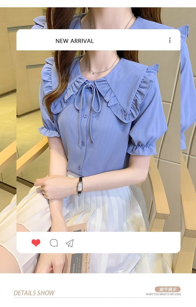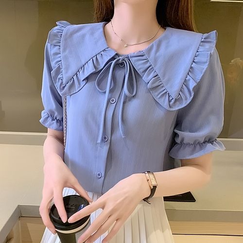 루즈한 러플 인형 칼라 레이스업 쉬폰 반소매 셔츠스토어 가기