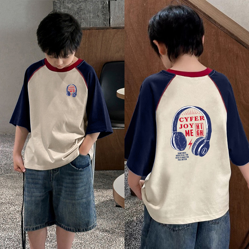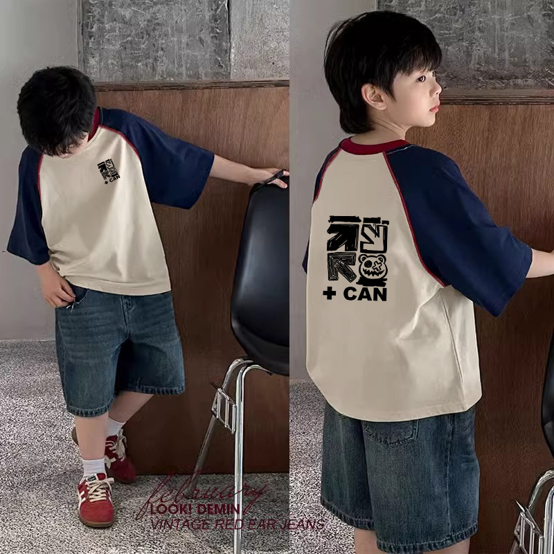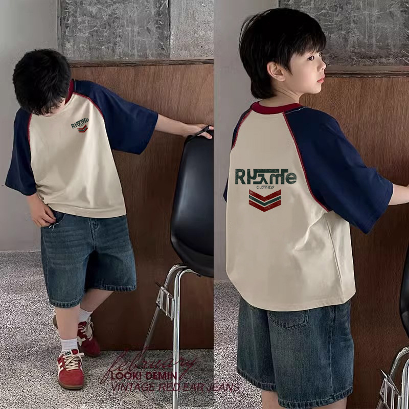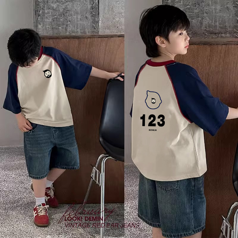 남아용 배색 반팔 티셔츠, 순면 하의 셔츠, 여름옷, 중대형 아동복, 한국판, 멋스럽고 활용도 높은 래글런 탑스토어 가기