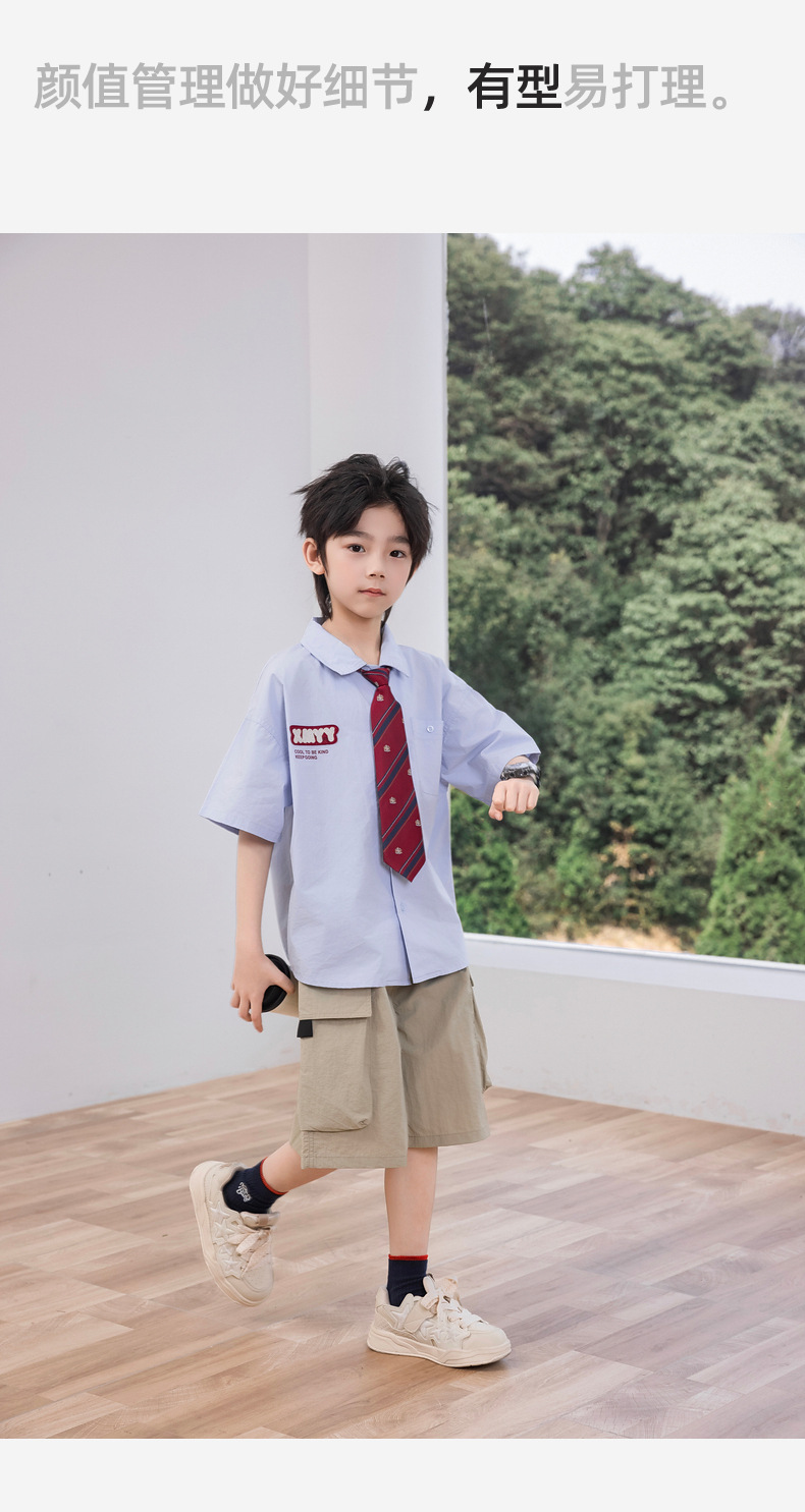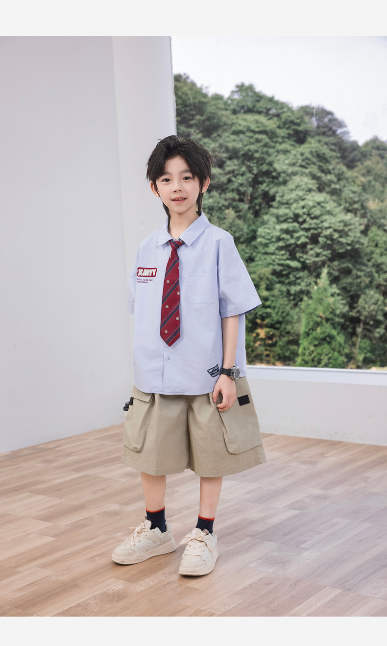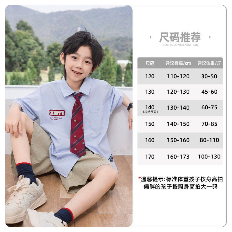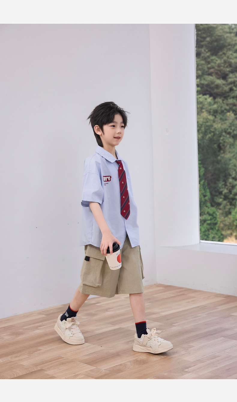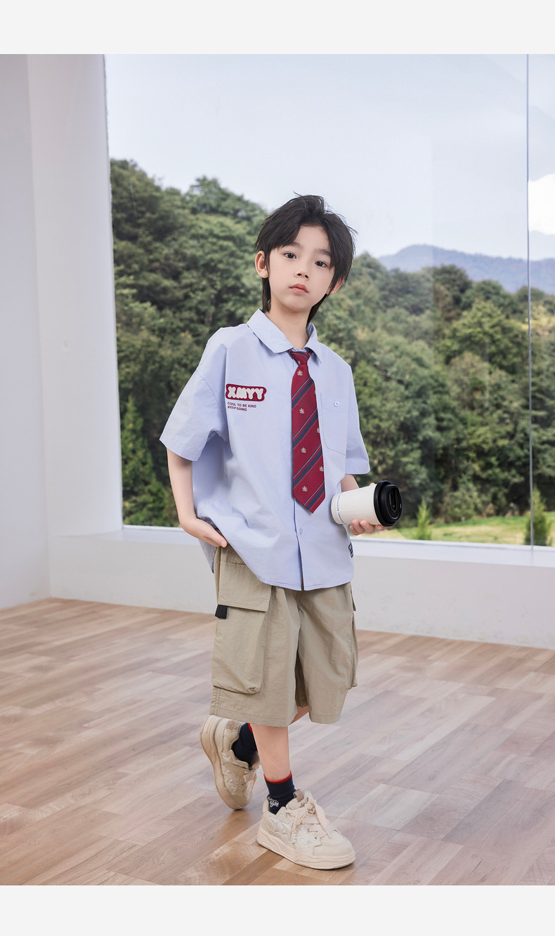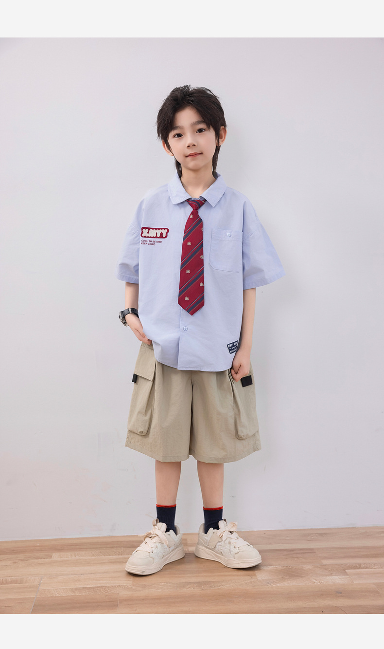 2025 여름 새로운 아동면 셔츠 넥타이 소년 짧은 소매 셔츠 여름 재킷 공장 도매스토어 가기
