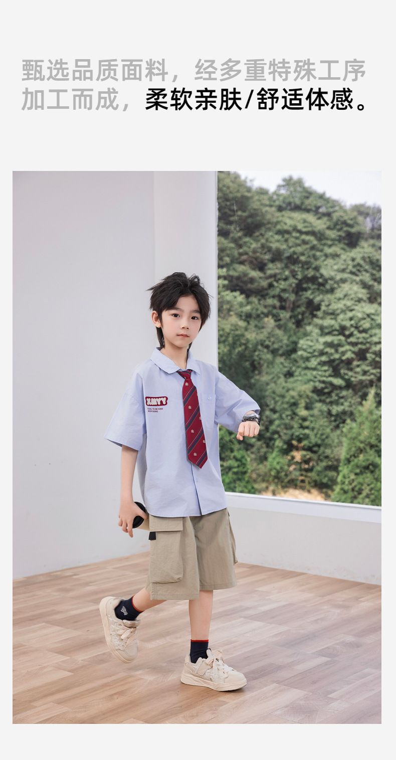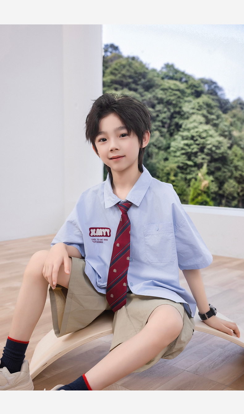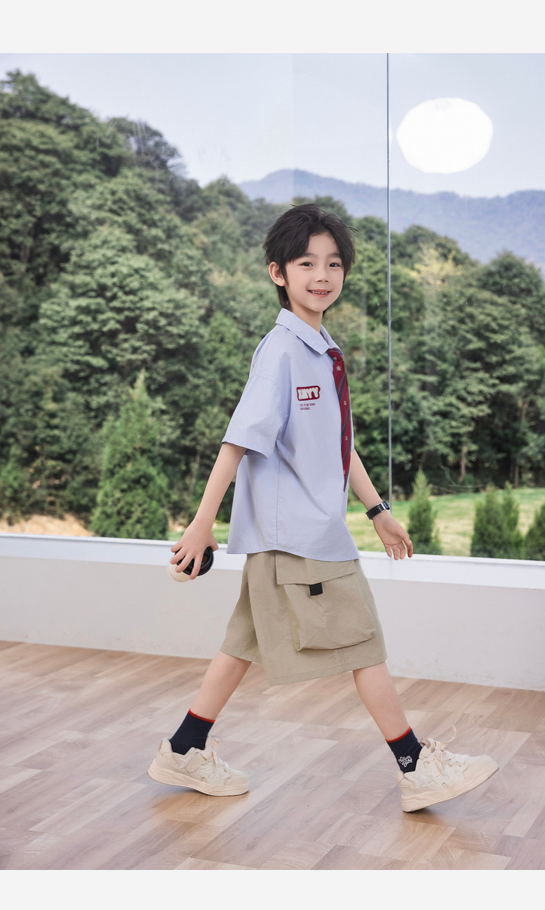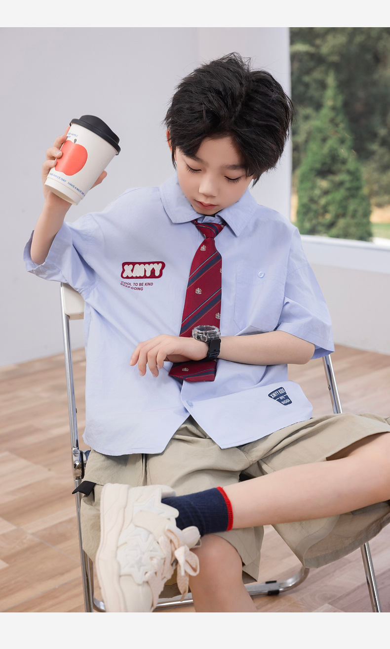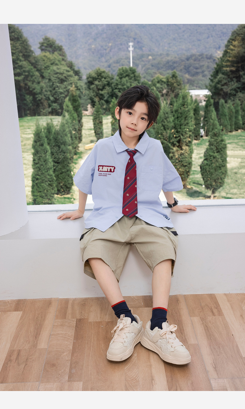 2025 여름 새로운 아동면 셔츠 넥타이 소년 짧은 소매 셔츠 여름 재킷 공장 도매스토어 가기