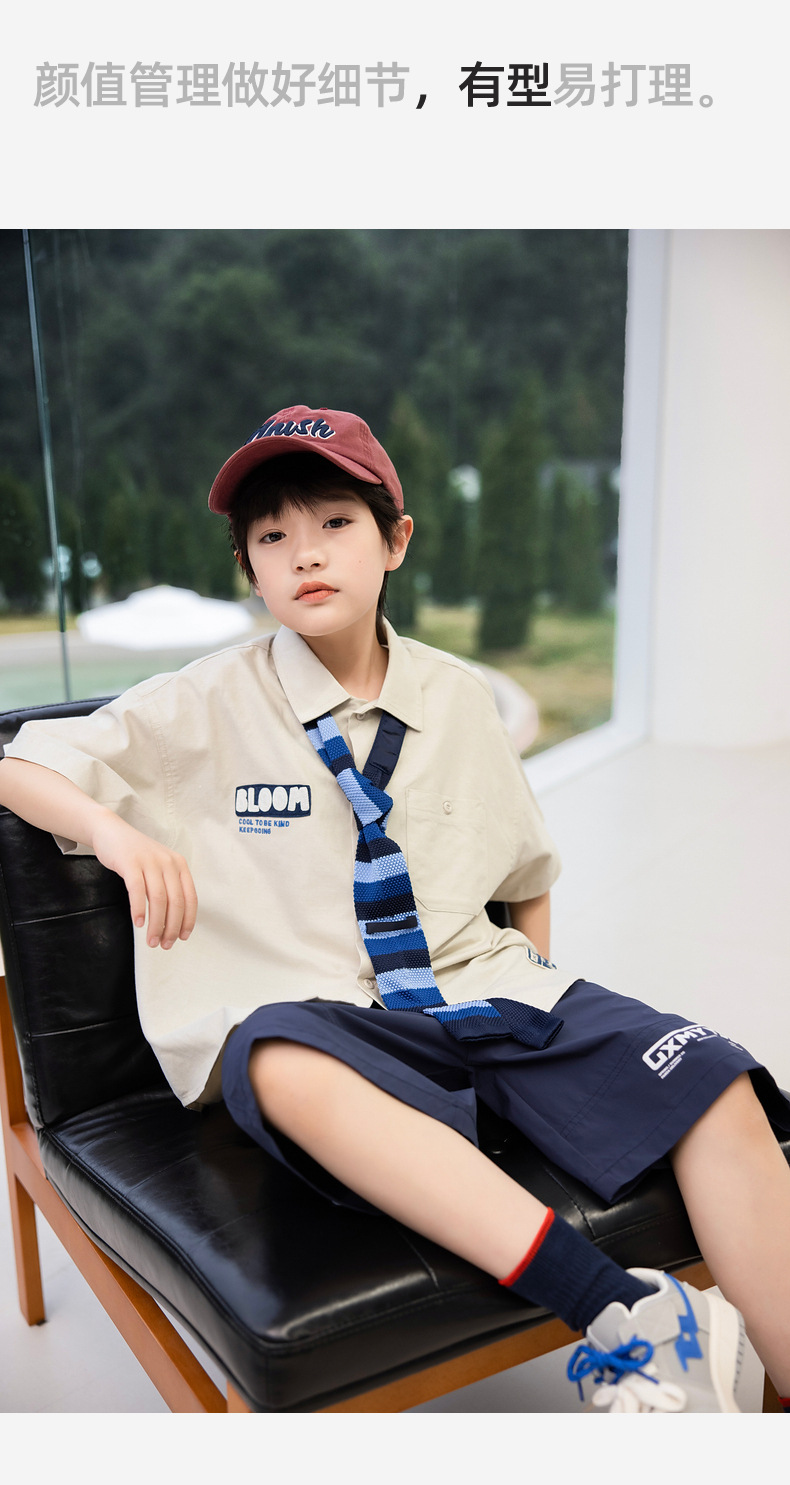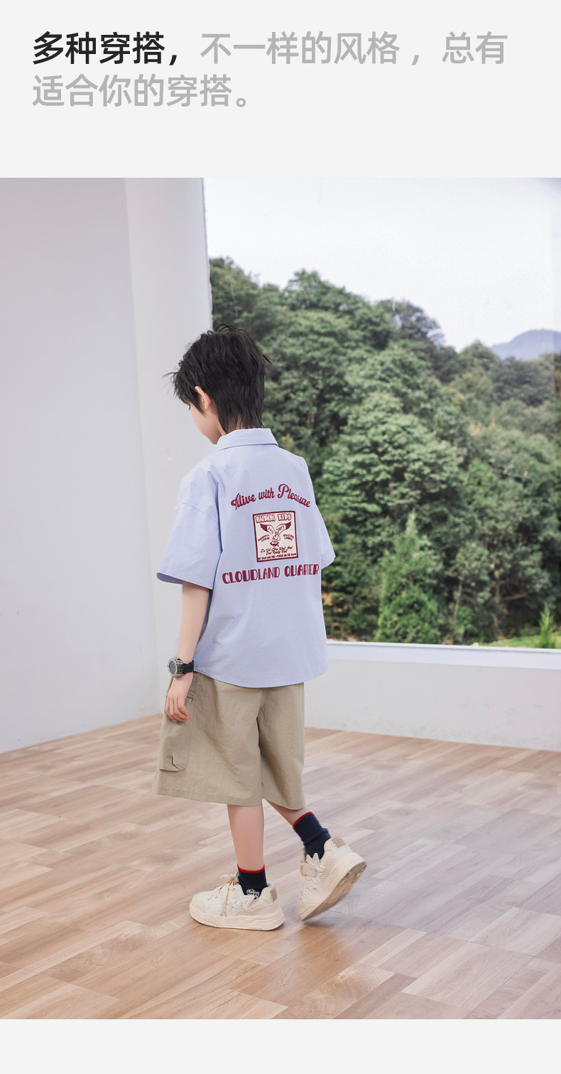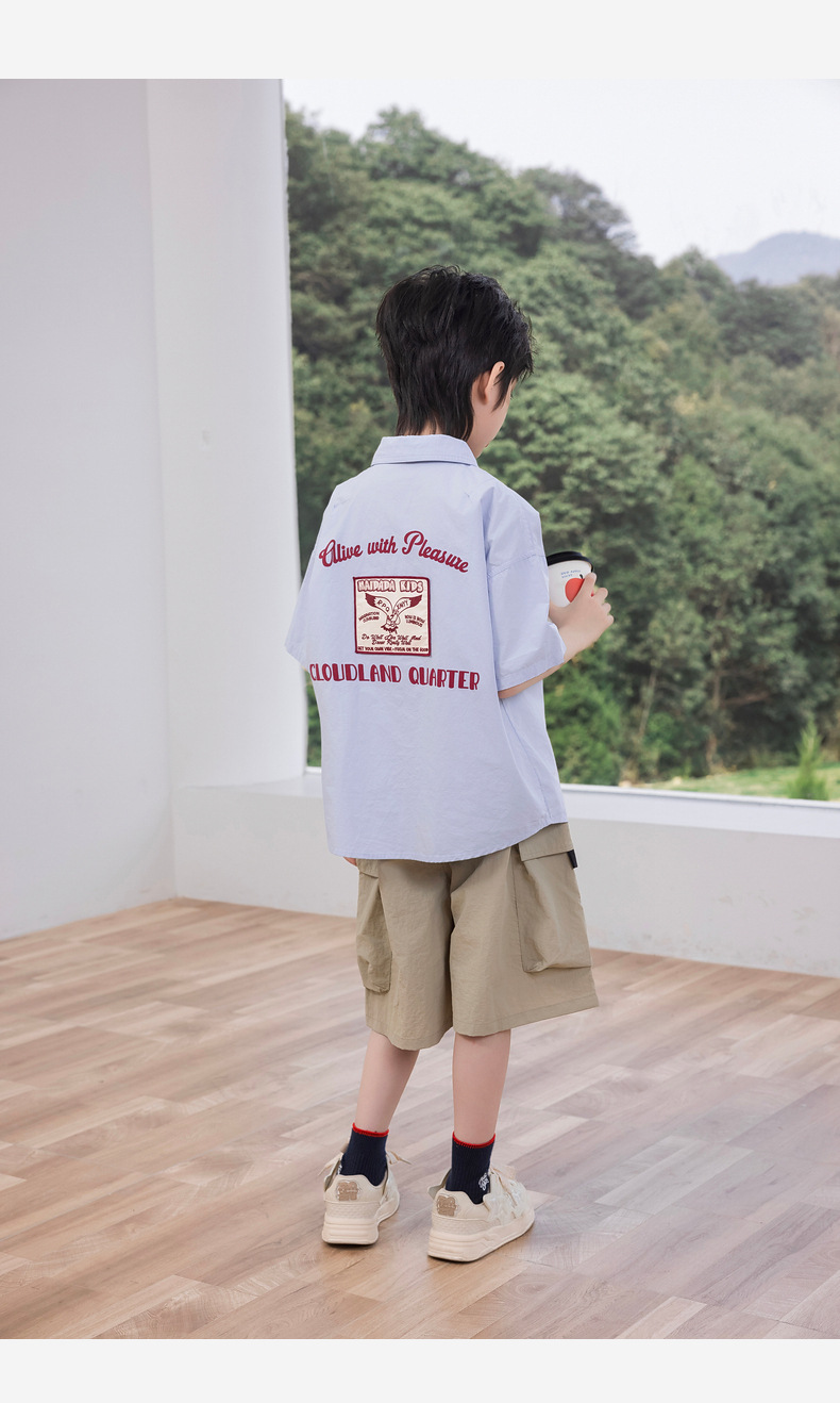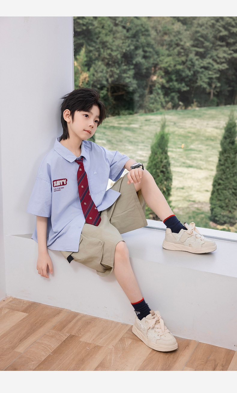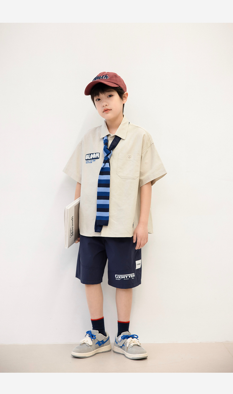 2025 여름 새로운 아동면 셔츠 넥타이 소년 짧은 소매 셔츠 여름 재킷 공장 도매스토어 가기