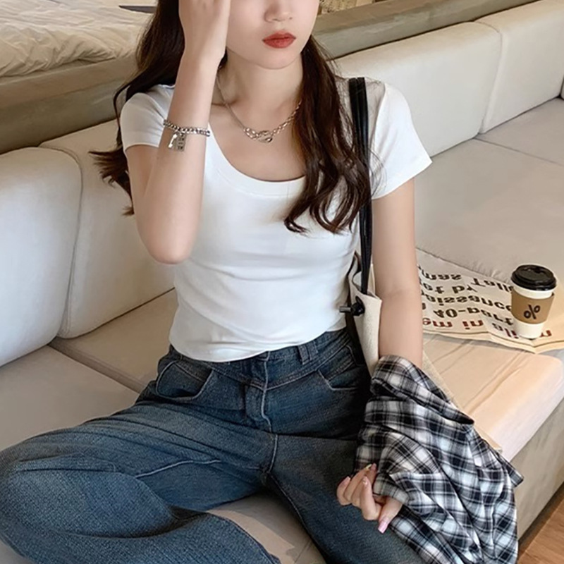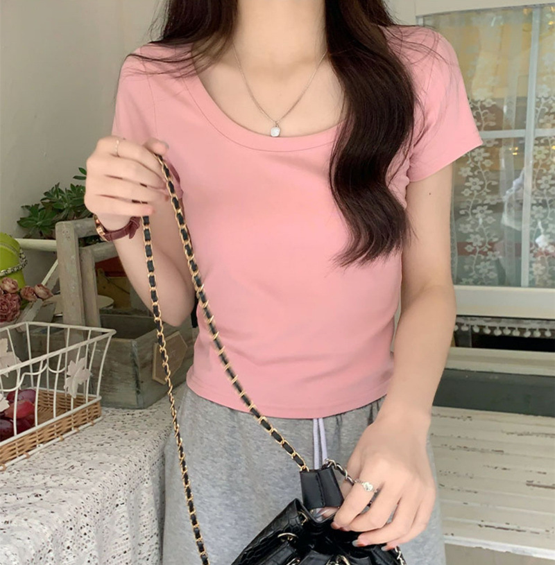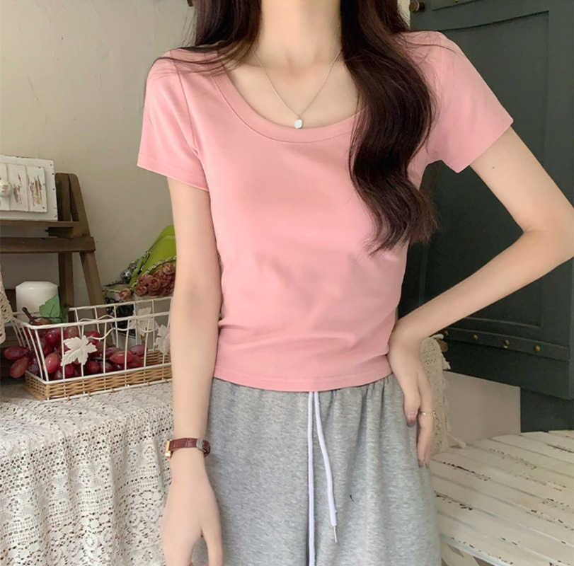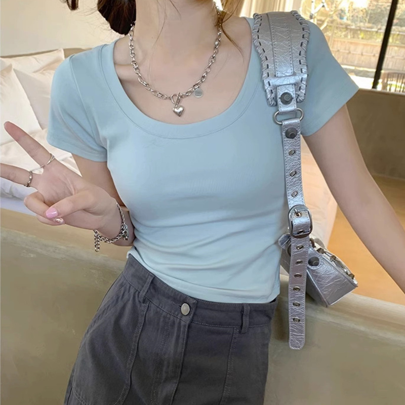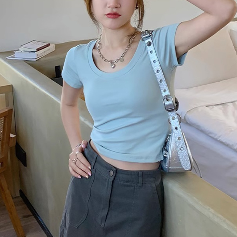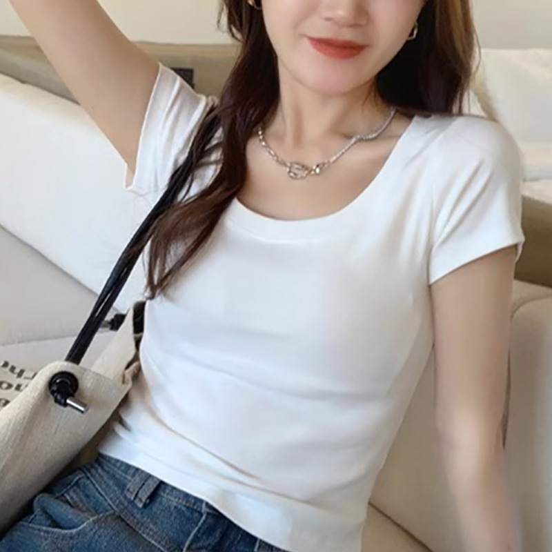 퓨어 코튼 스레드 솔리드 컬러 반팔 티셔츠 여성용 여름 로우 라운드 넥 슬림 핏 숄더 슬림 핏 클랩 탑 뉴 스타일 INS스토어 가기