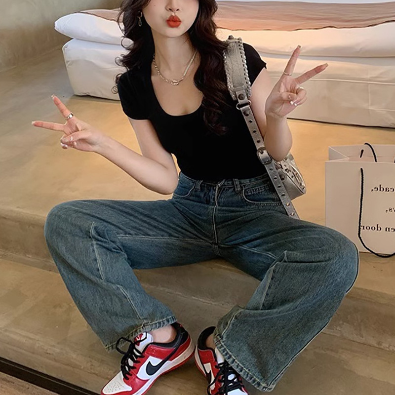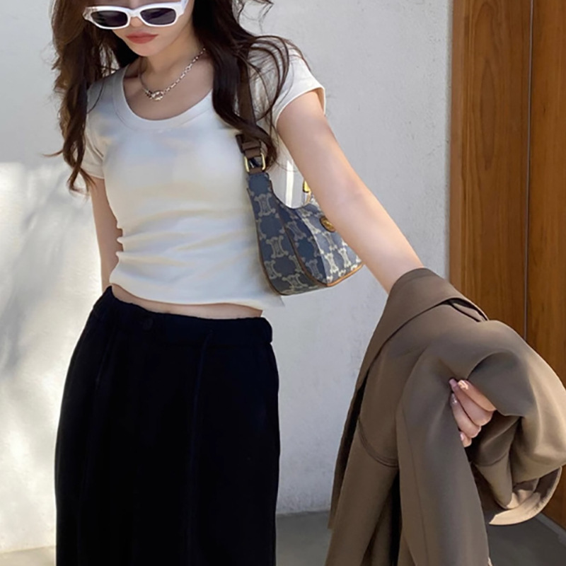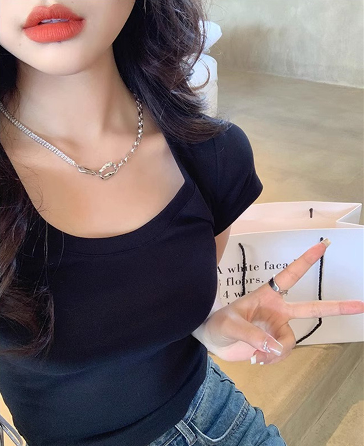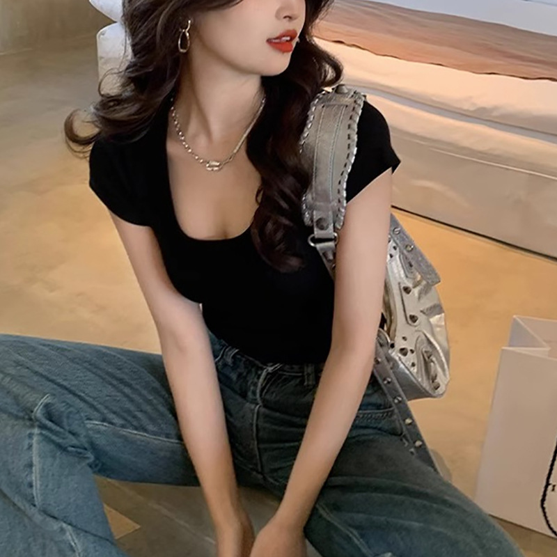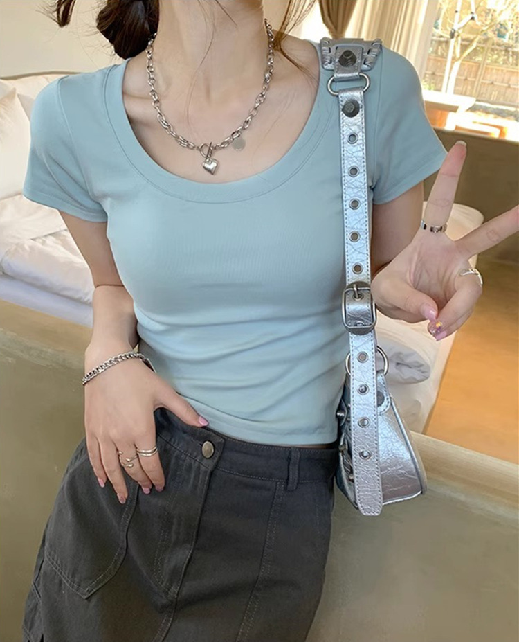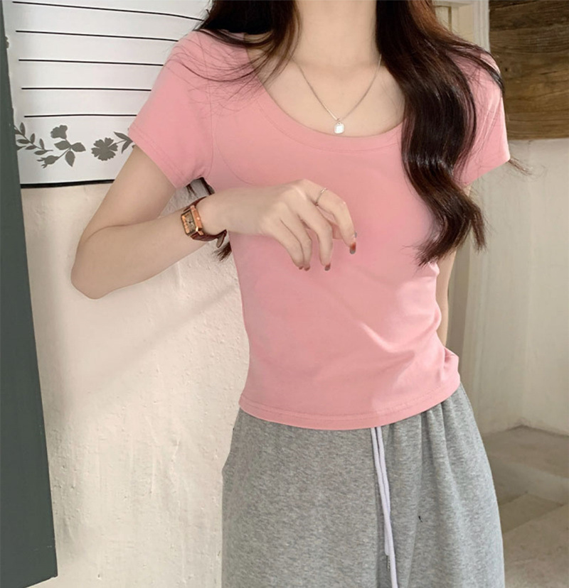 퓨어 코튼 스레드 솔리드 컬러 반팔 티셔츠 여성용 여름 로우 라운드 넥 슬림 핏 숄더 슬림 핏 클랩 탑 뉴 스타일 INS스토어 가기