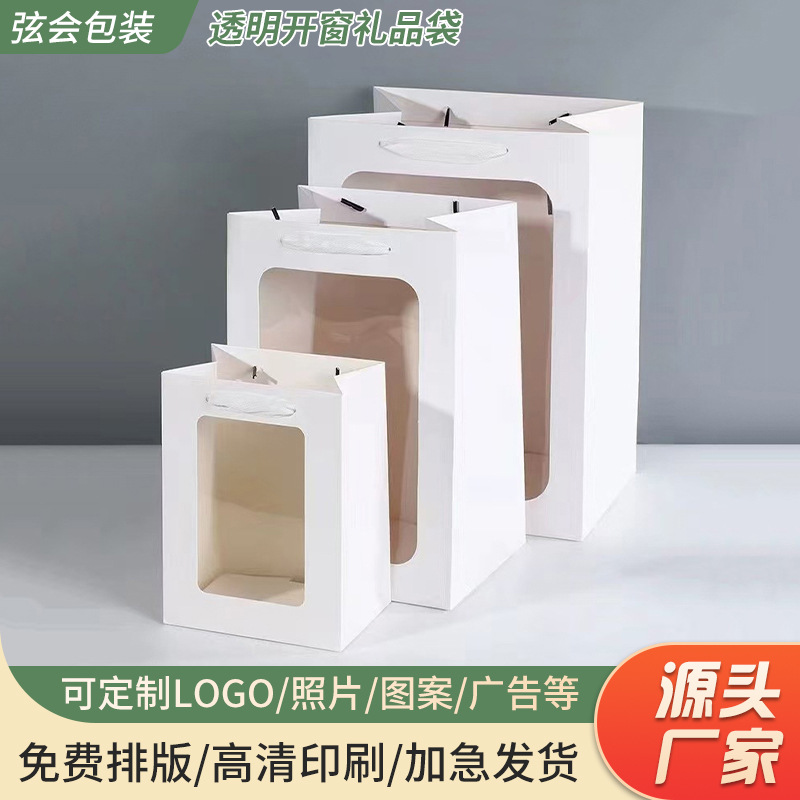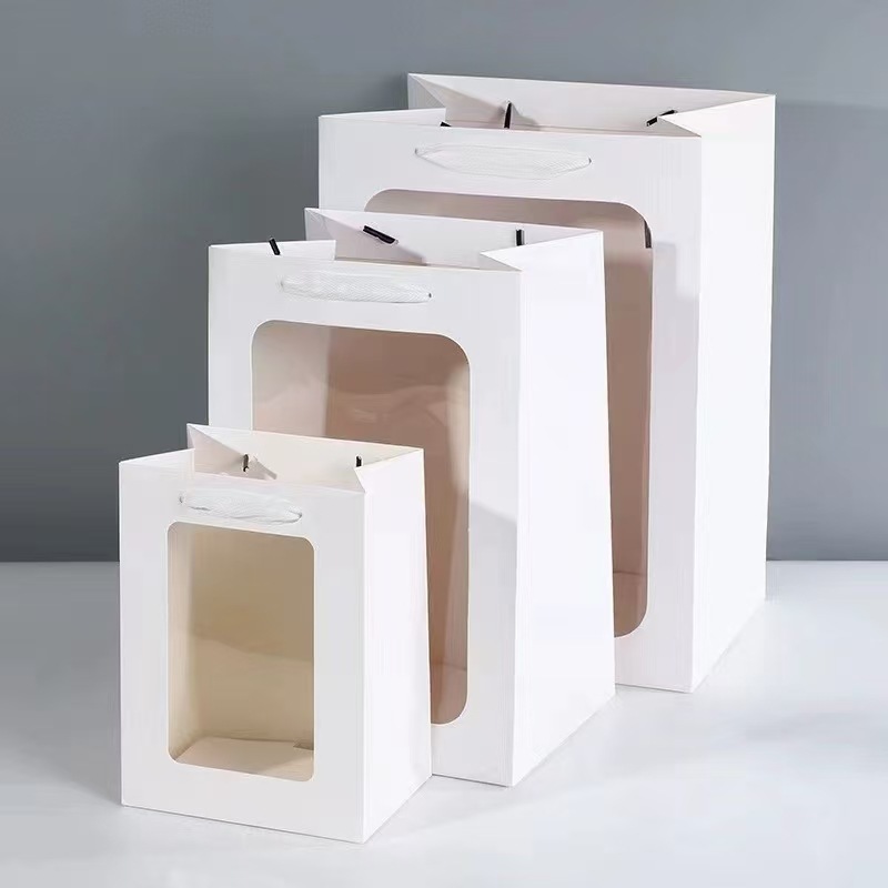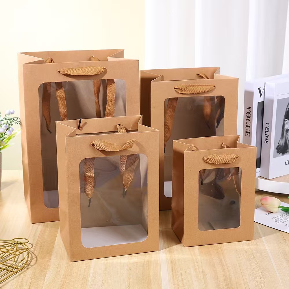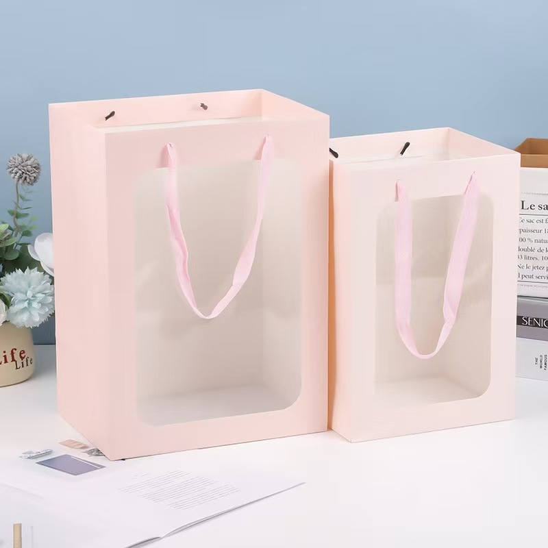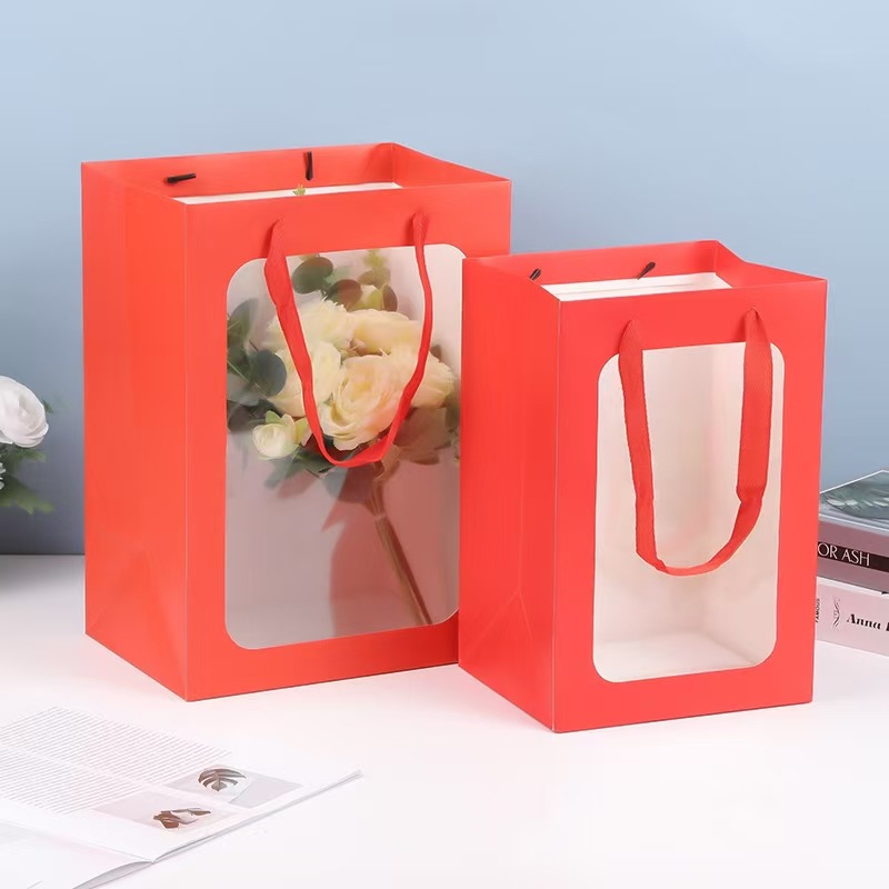 두꺼운 선물 가방, 투명 창 핸드백, 발렌타인 데이 선물 창 종이 봉투, 도매 꽃다발 포장 가방스토어 가기