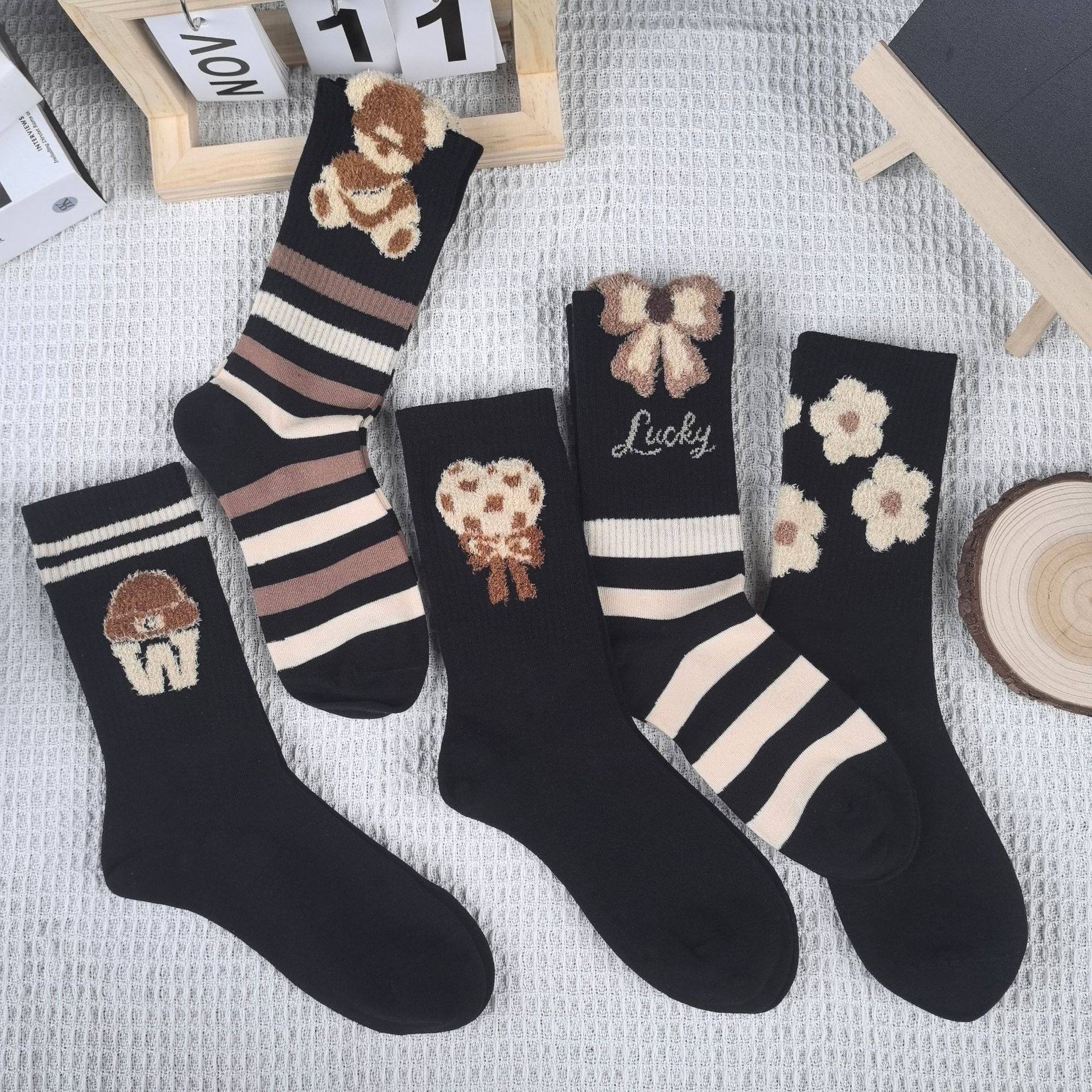 • 0358 여성용 종아리 중간 리본 파일 양말