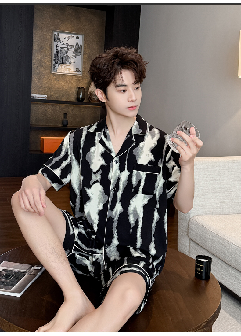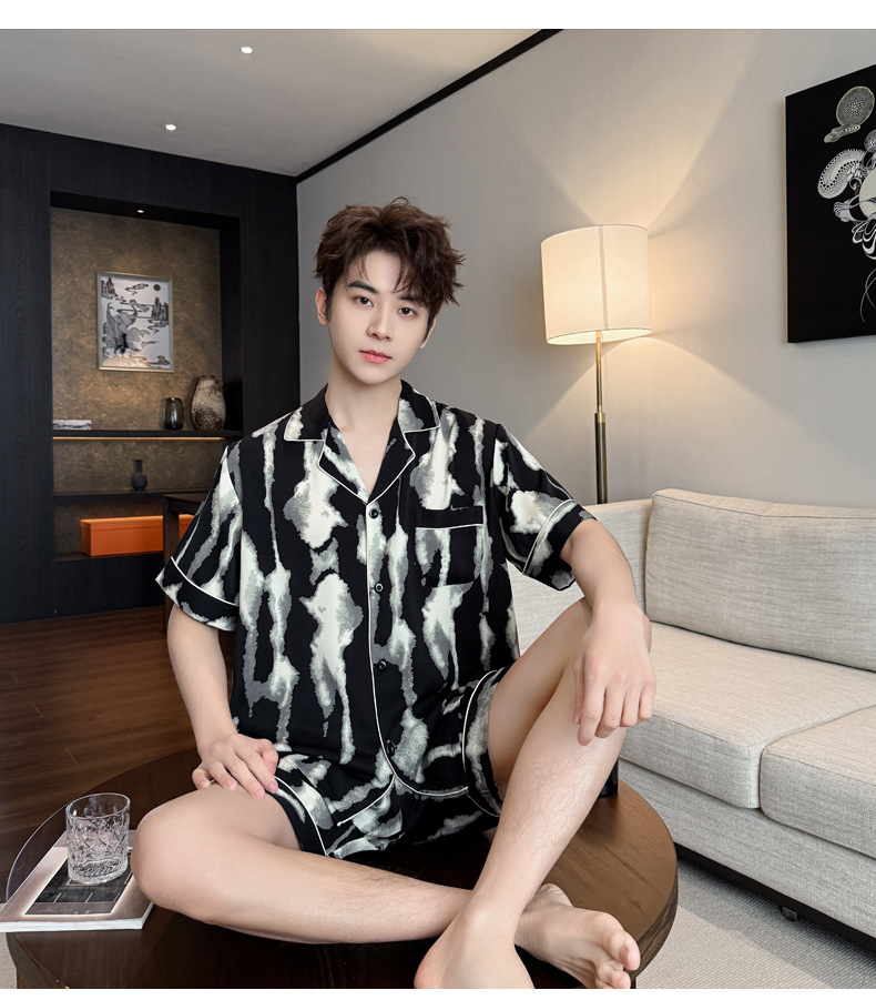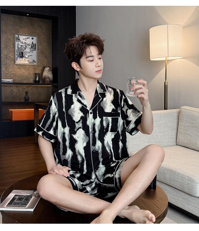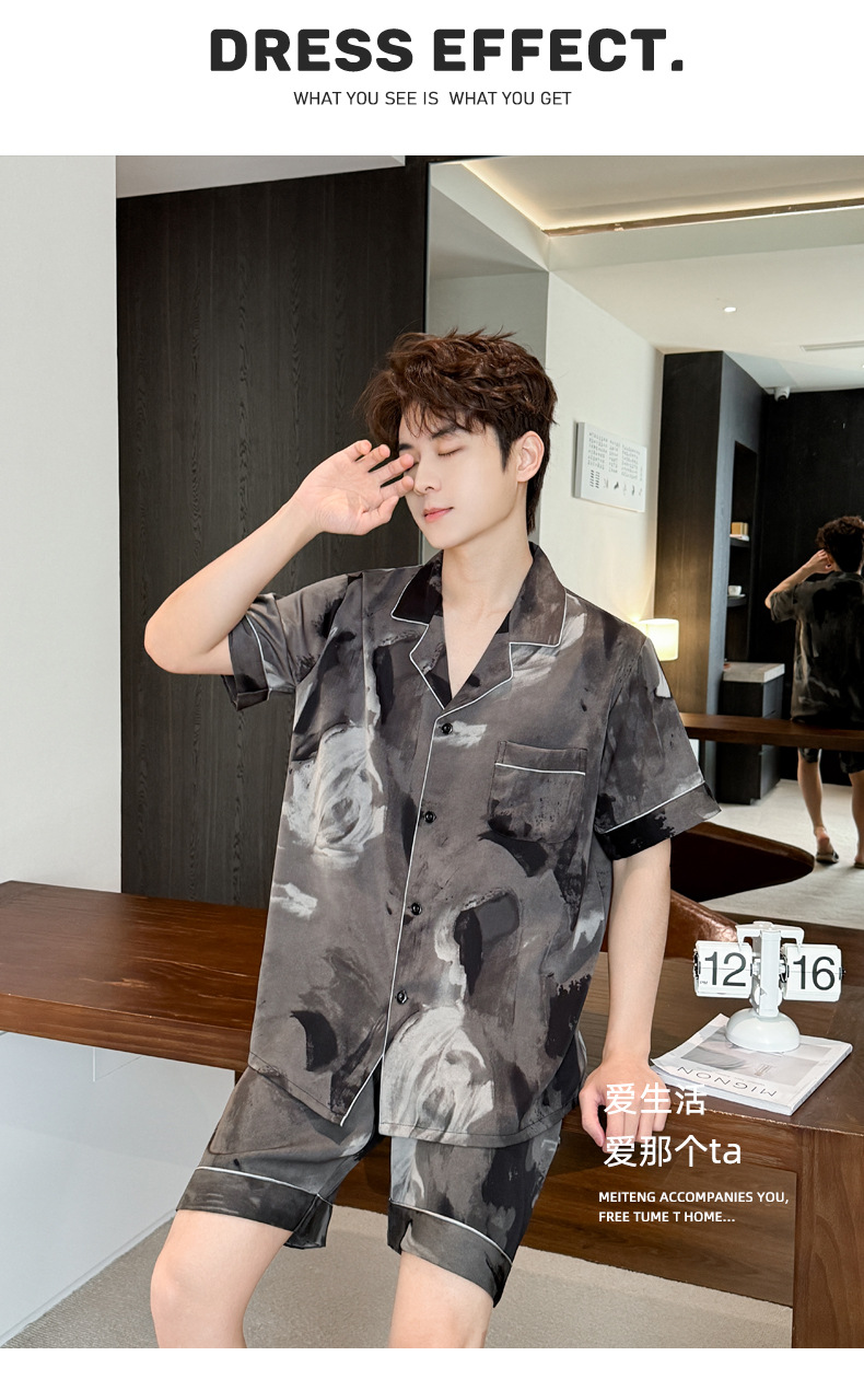 아이스 실크 파자마 남자 여름 간단한 하이 엔드 반팔 반바지 투피스 세트 남성 쿨 느낌 홈웨어 복장스토어 가기