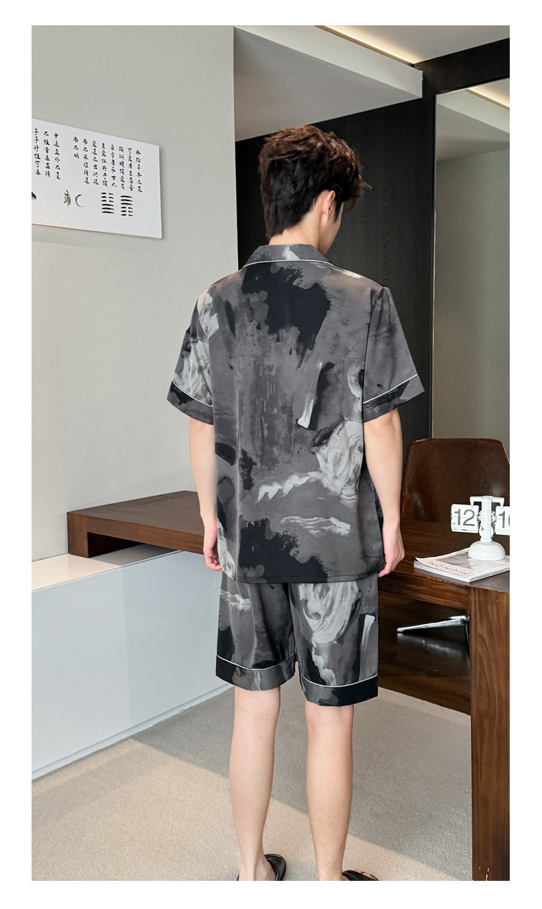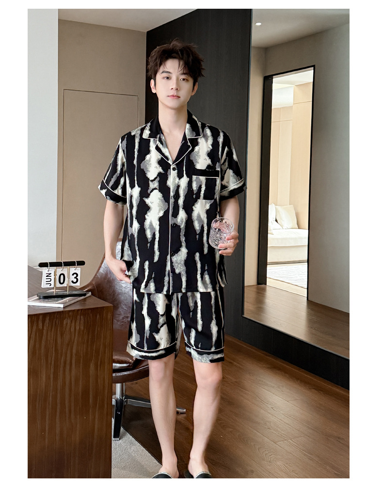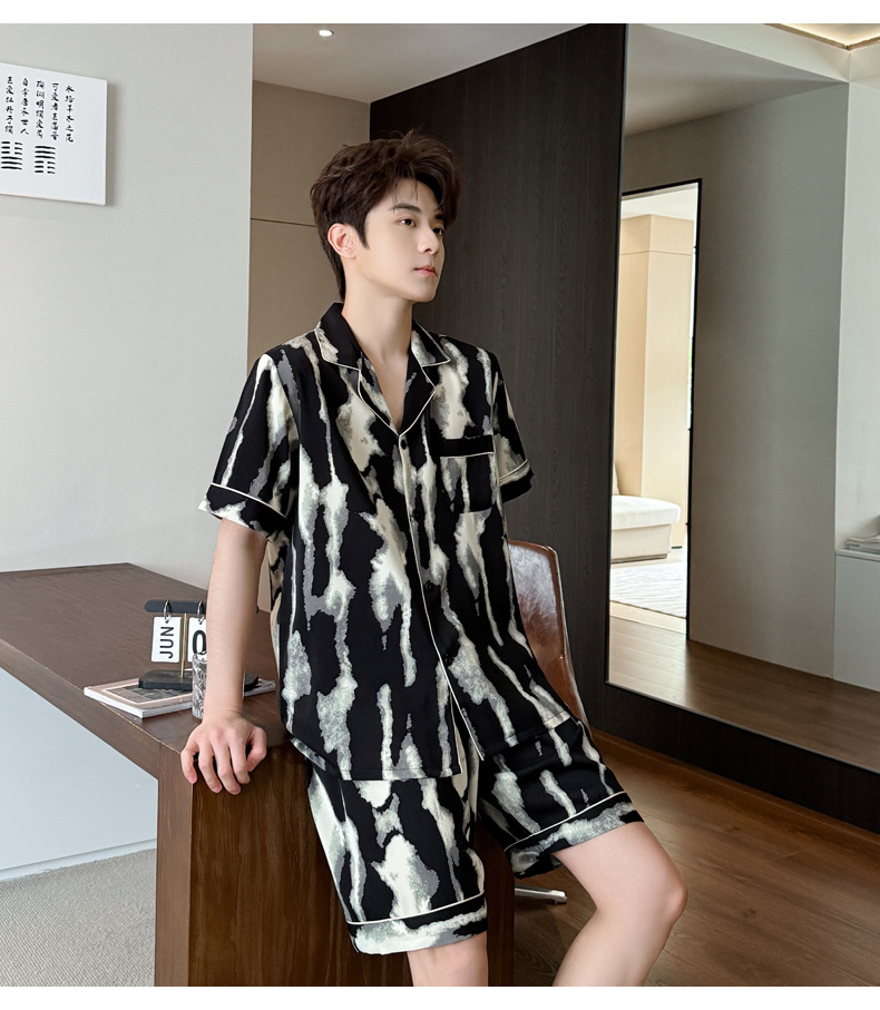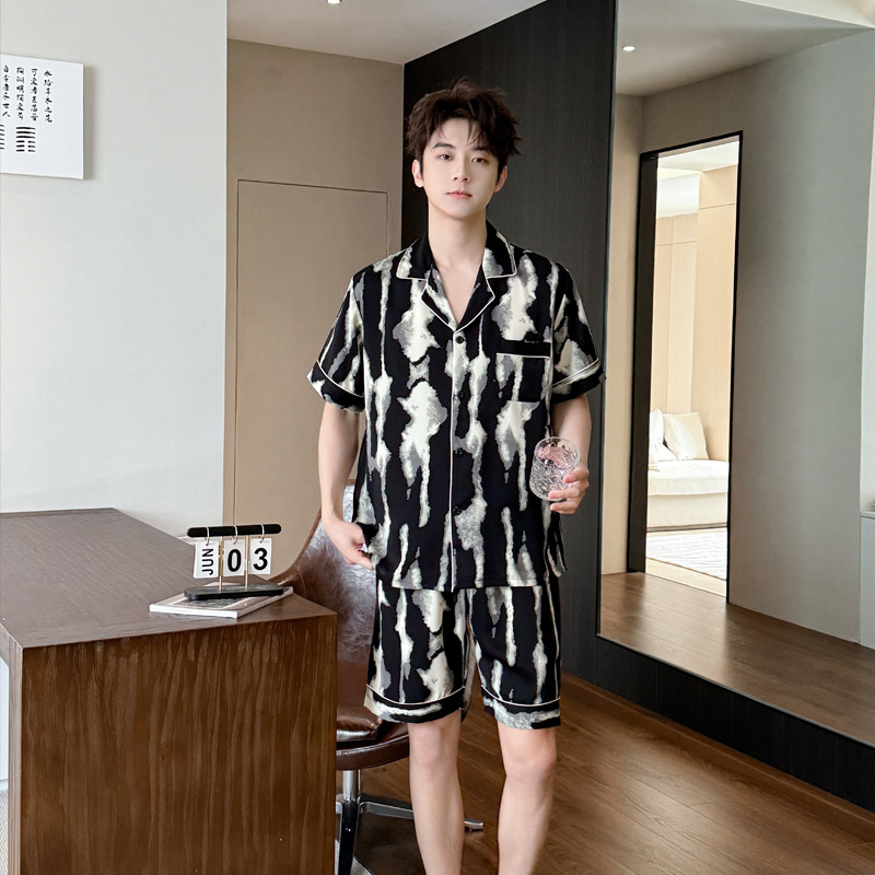 아이스 실크 파자마 남자 여름 간단한 하이 엔드 반팔 반바지 투피스 세트 남성 쿨 느낌 홈웨어 복장스토어 가기