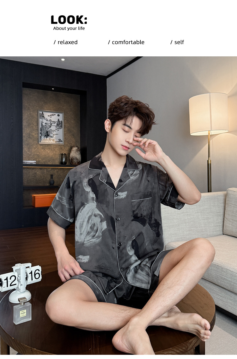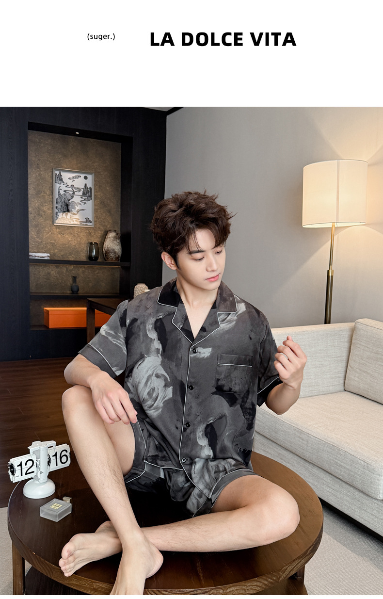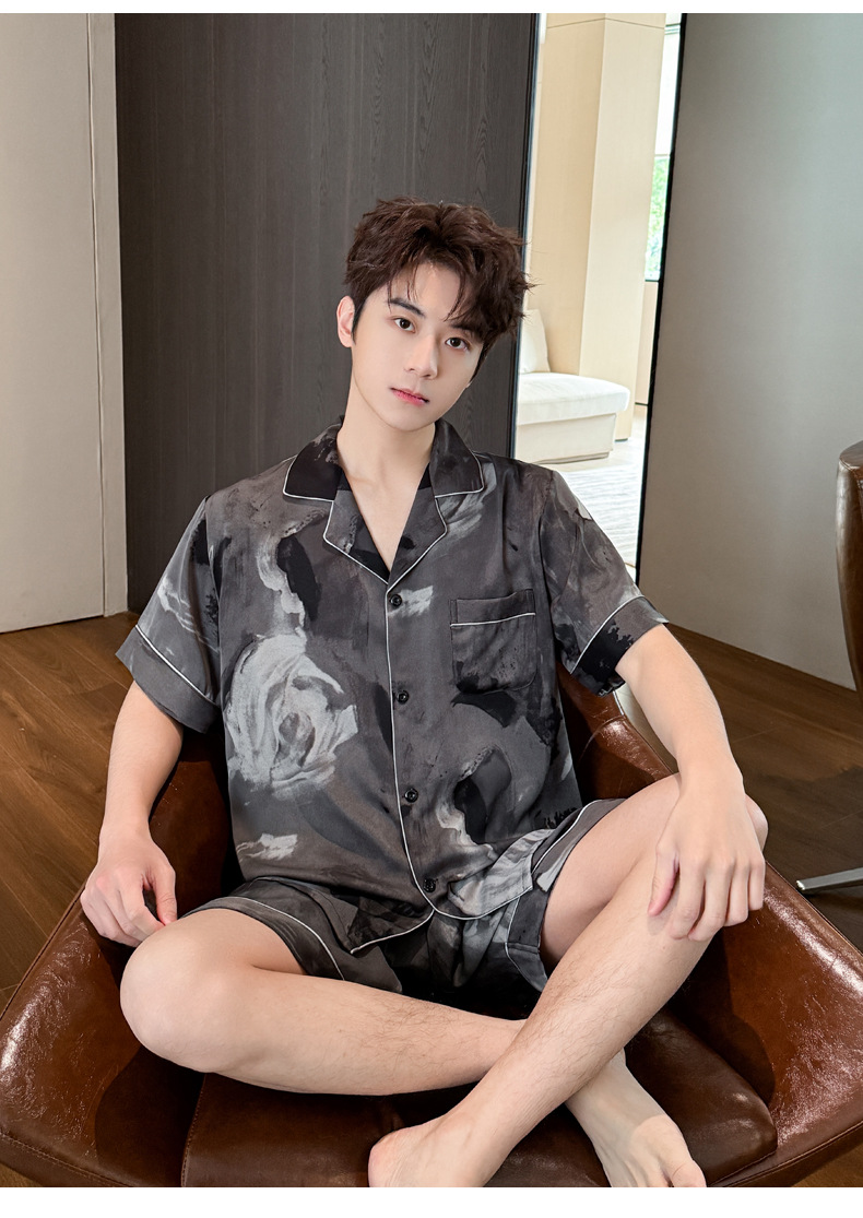 아이스 실크 파자마 남자 여름 간단한 하이 엔드 반팔 반바지 투피스 세트 남성 쿨 느낌 홈웨어 복장