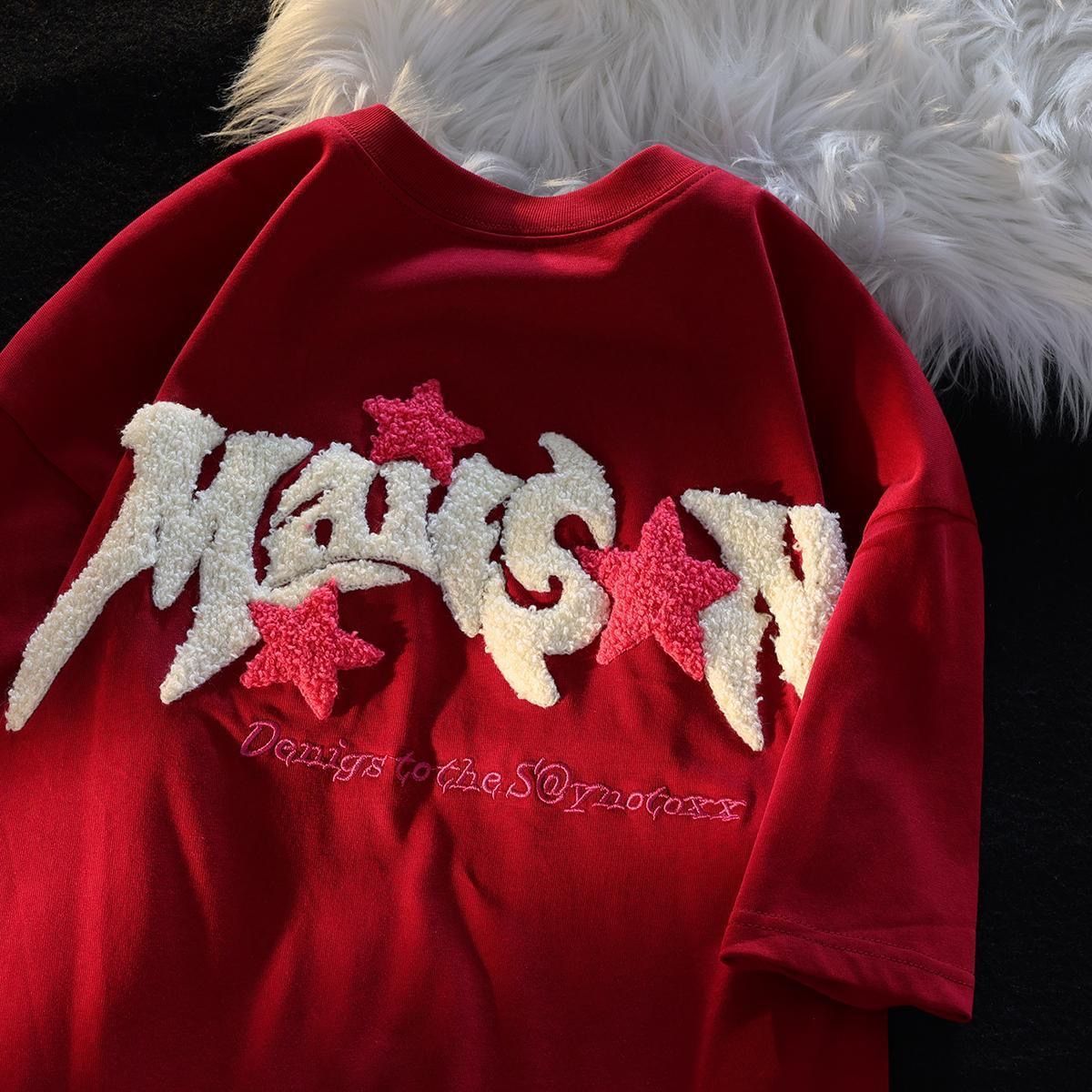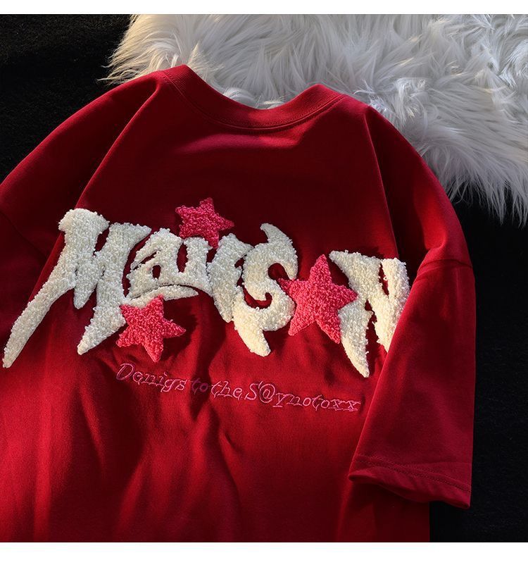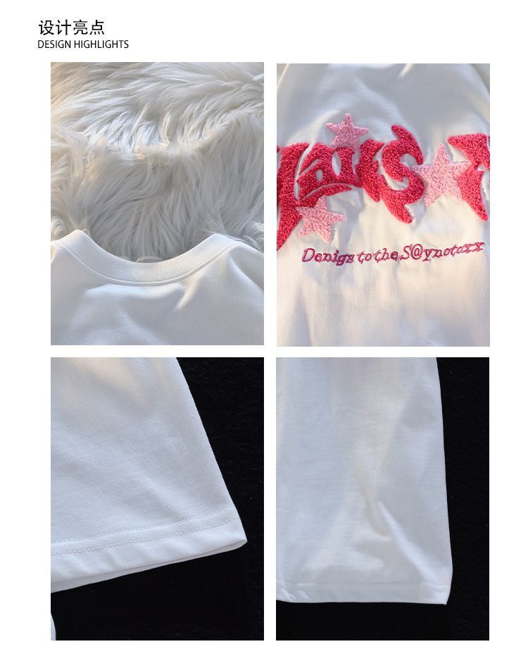 여름 트렌디 브랜드 bestie 착용 루즈 캐주얼 다용도 슬리밍 탑 여성용 일본식 문자 플록 자수 반팔 티셔츠스토어 가기