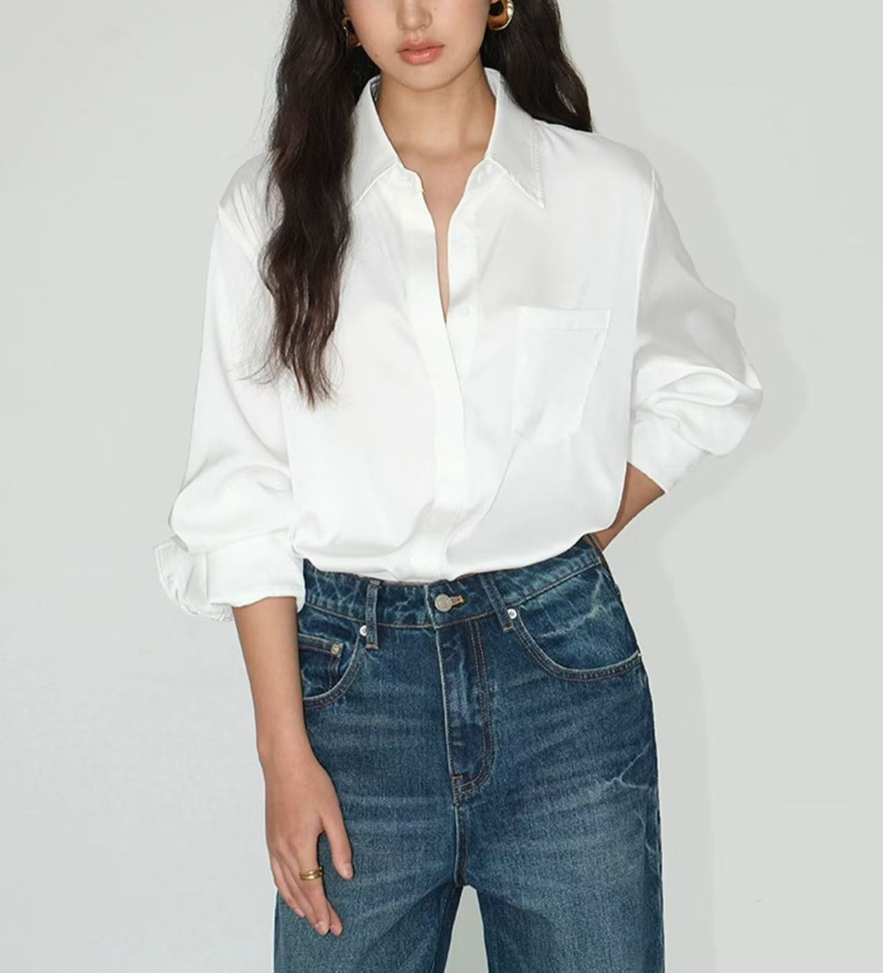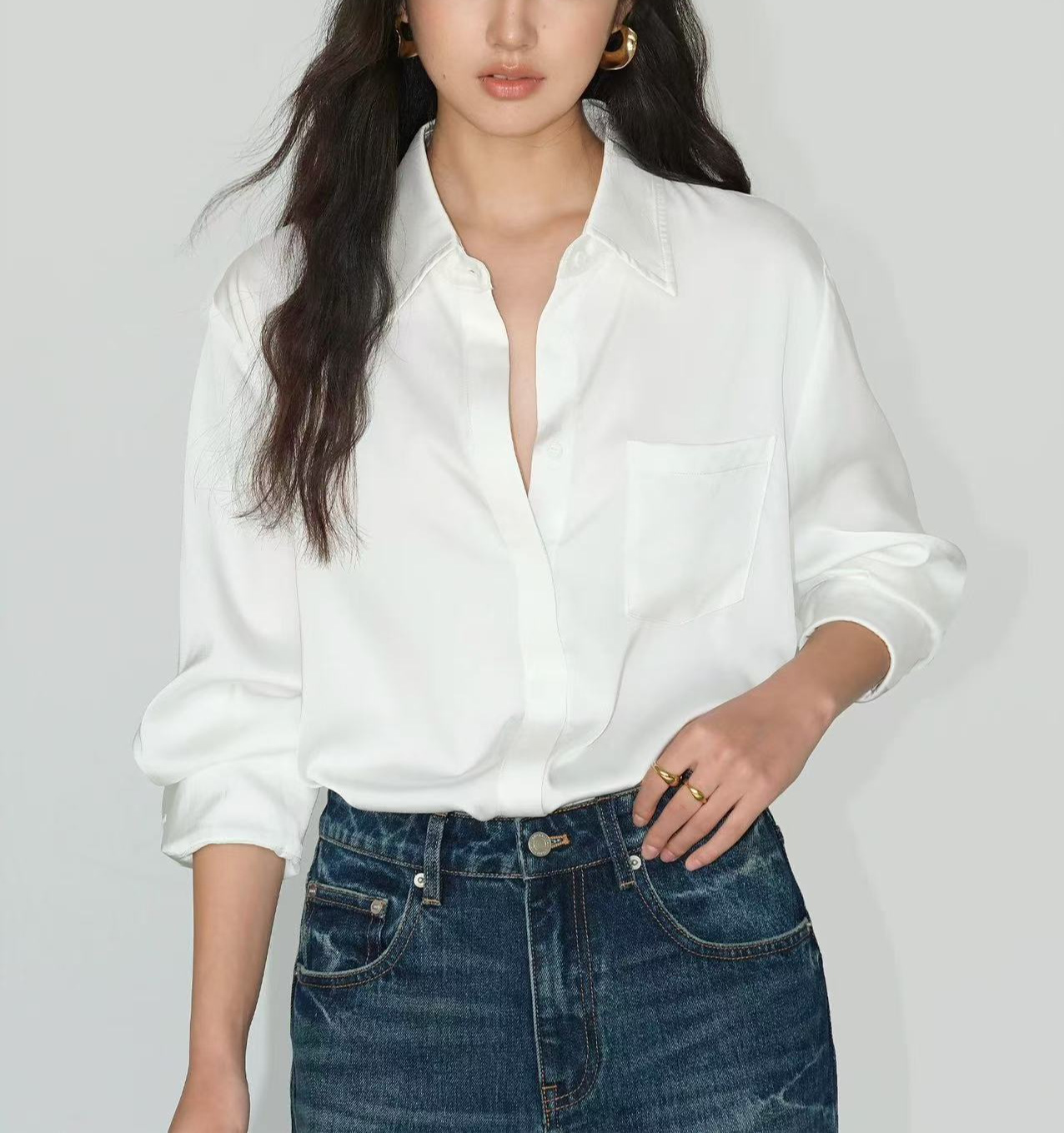 고급스러운 새틴 긴팔 셔츠 여성용 2026년 초봄 신상 루즈핏 우아한 디자인 셔츠 유니크한 상의스토어 가기