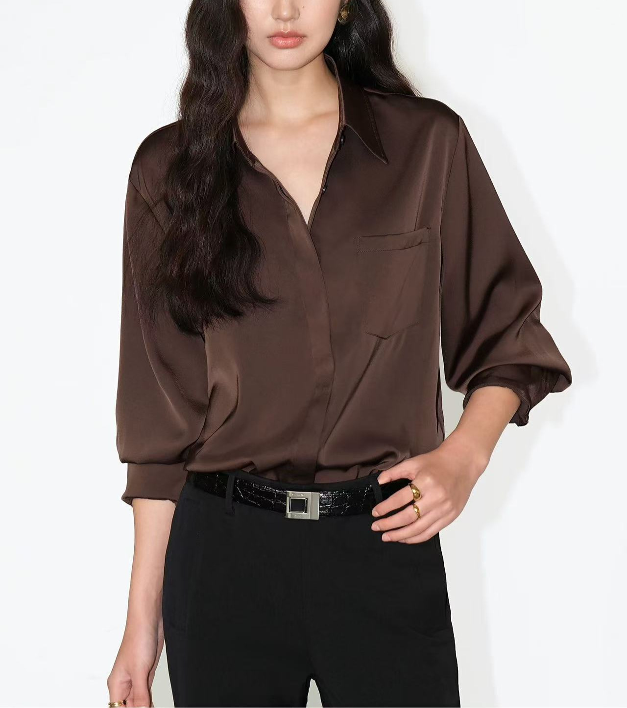 고급스러운 새틴 긴팔 셔츠 여성용 2026년 초봄 신상 루즈핏 우아한 디자인 셔츠 유니크한 상의