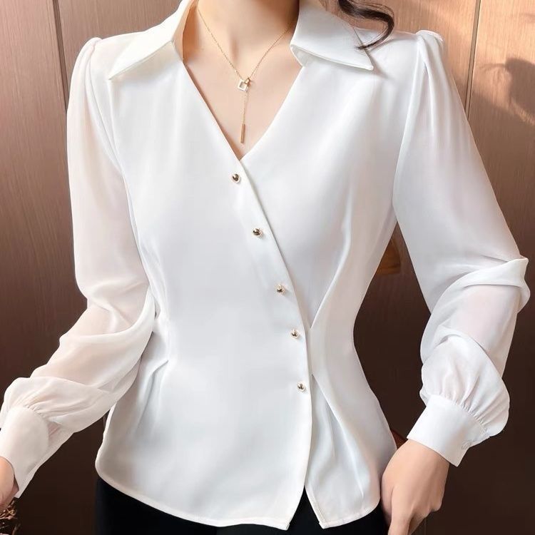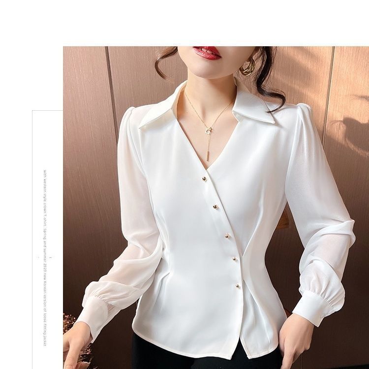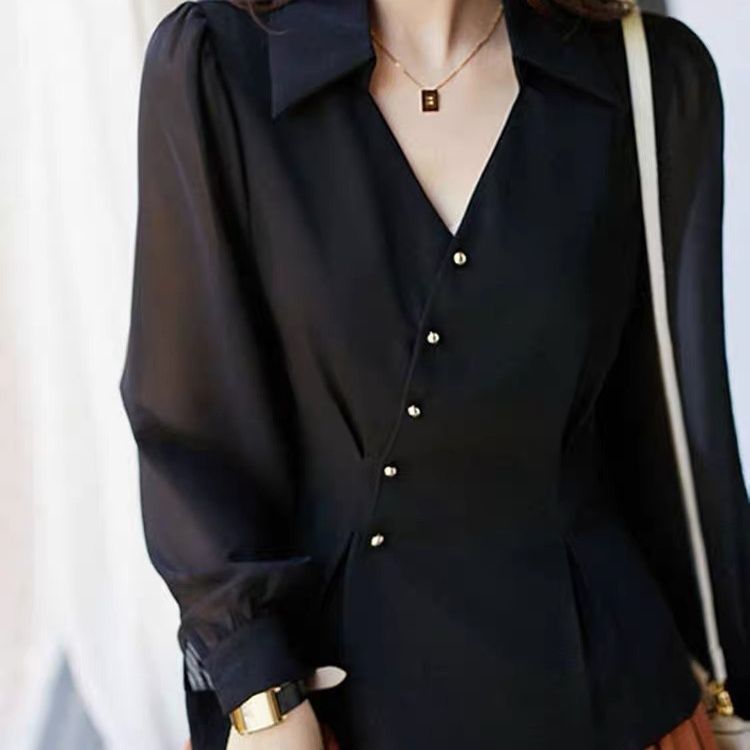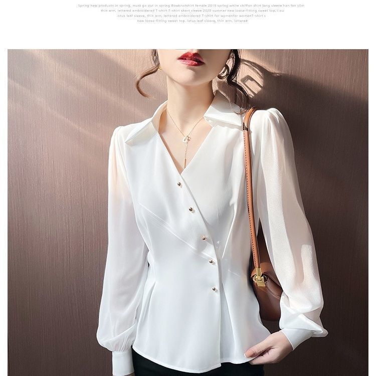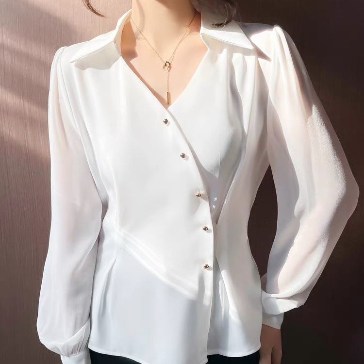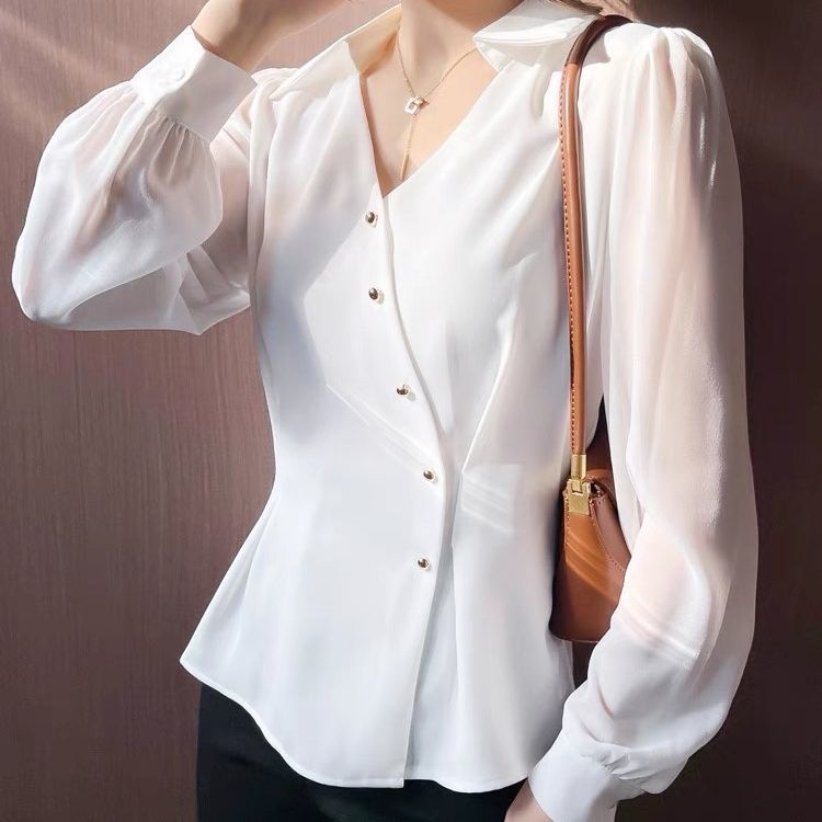 프랑스 스타일 불규칙한 V 넥 타이트 허리 셔츠 여성을위한 2025 봄 새로운 도착 아름다운 서양 스타일 작은 셔츠 세련된 우아한 탑