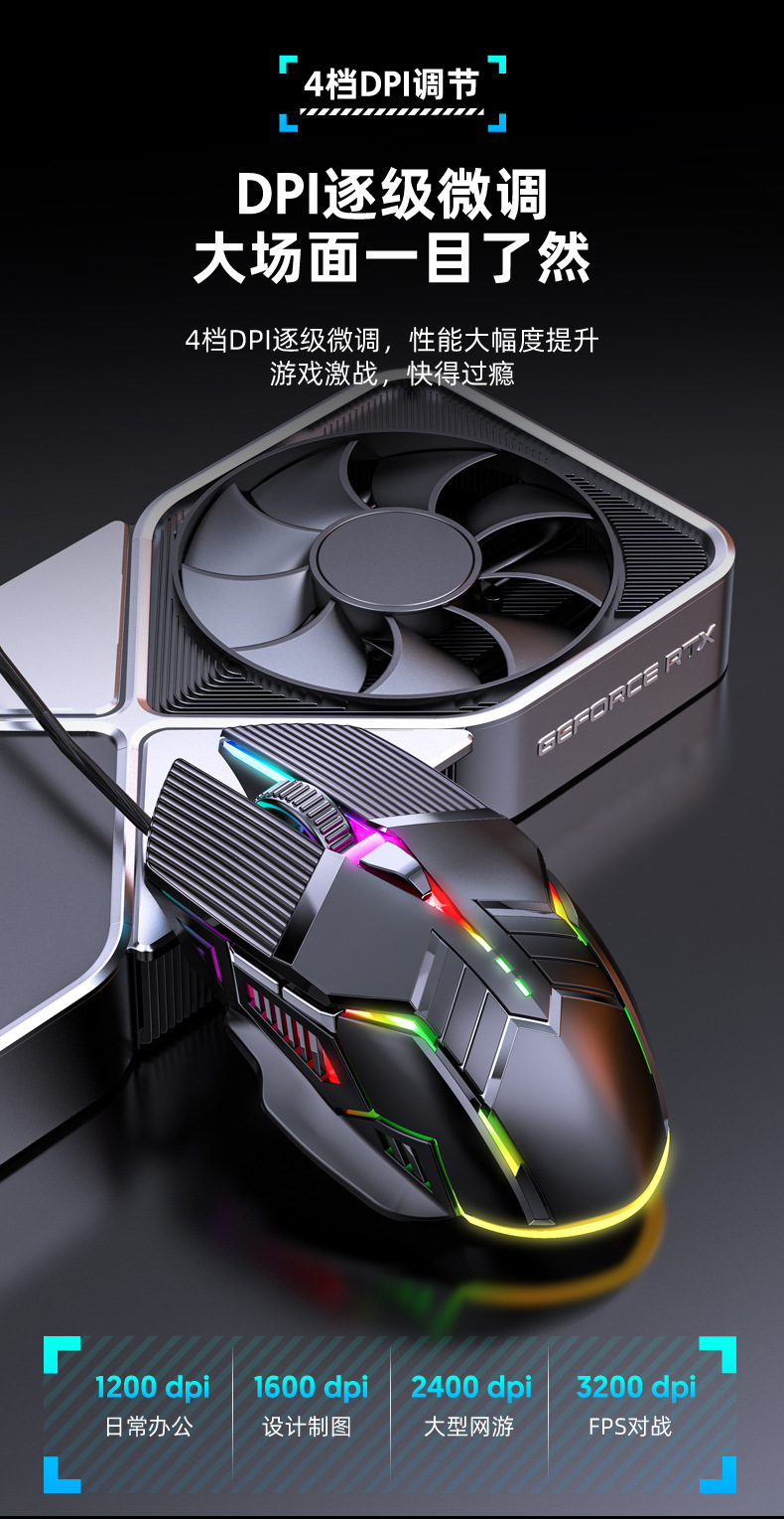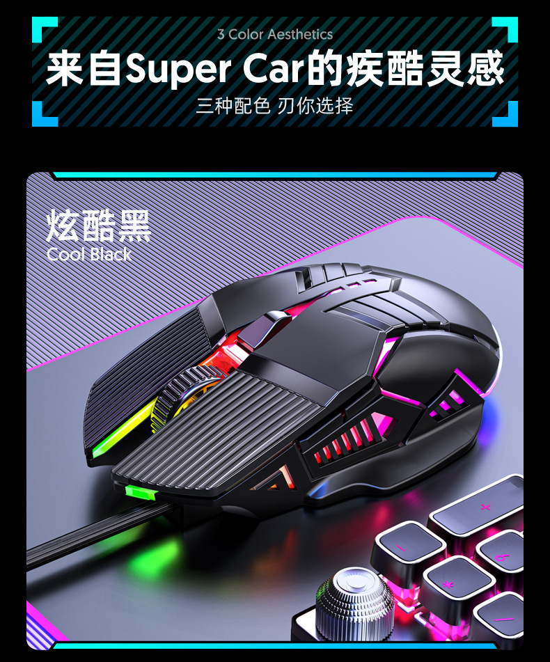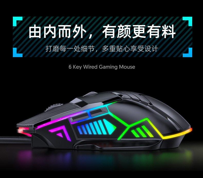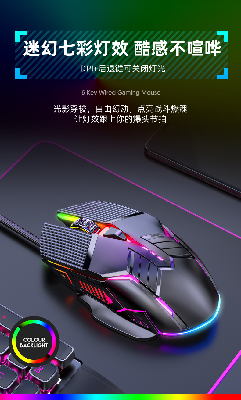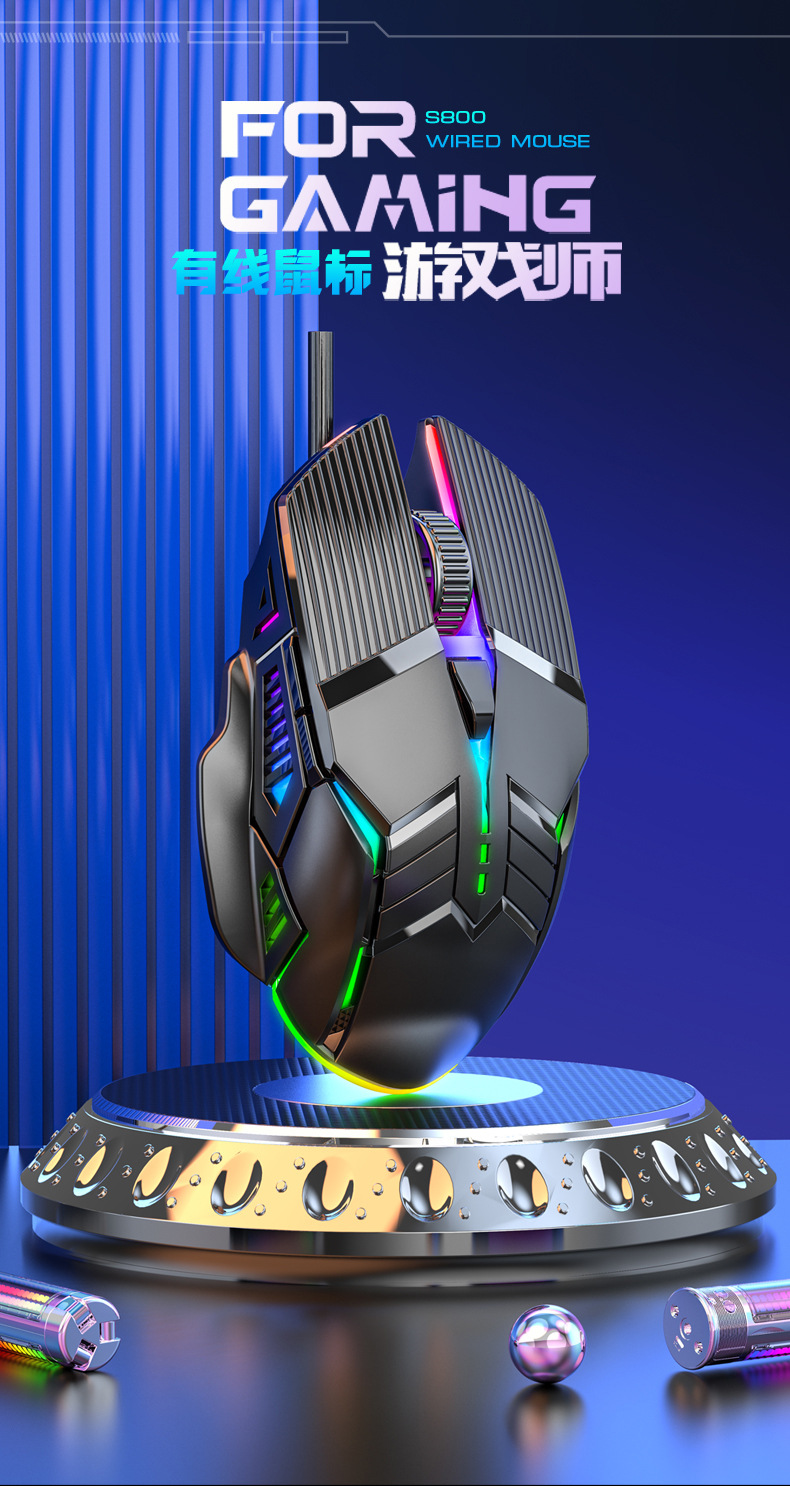 새로운 S800 유선 마우스 USB 발광 7색 조명 효과 6키 게임 마우스 가정 및 사무실용