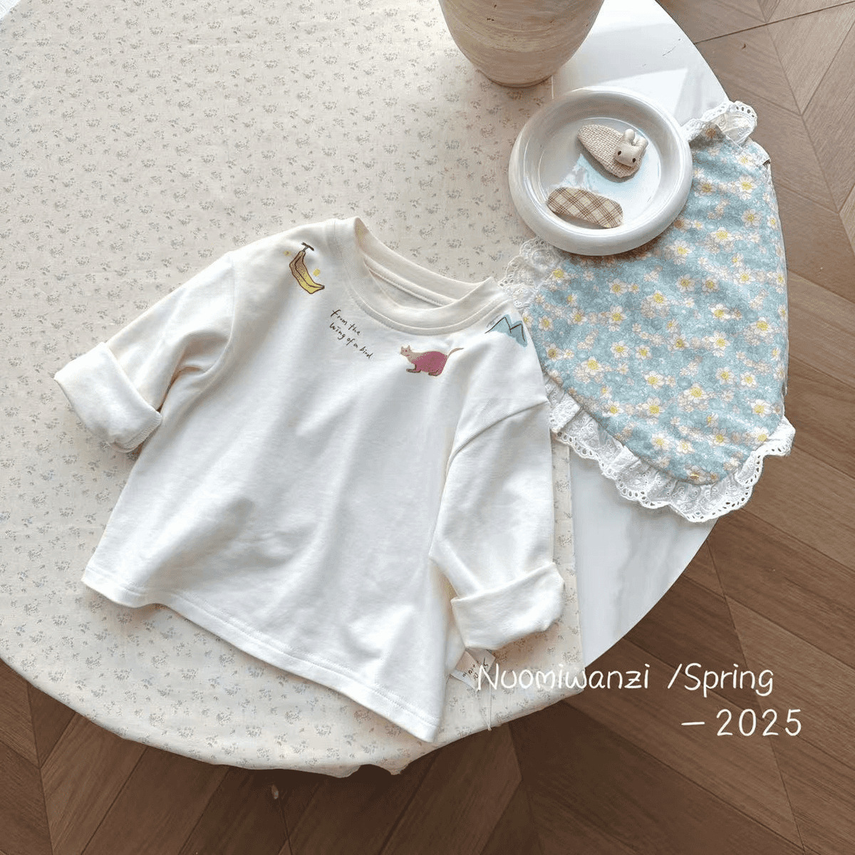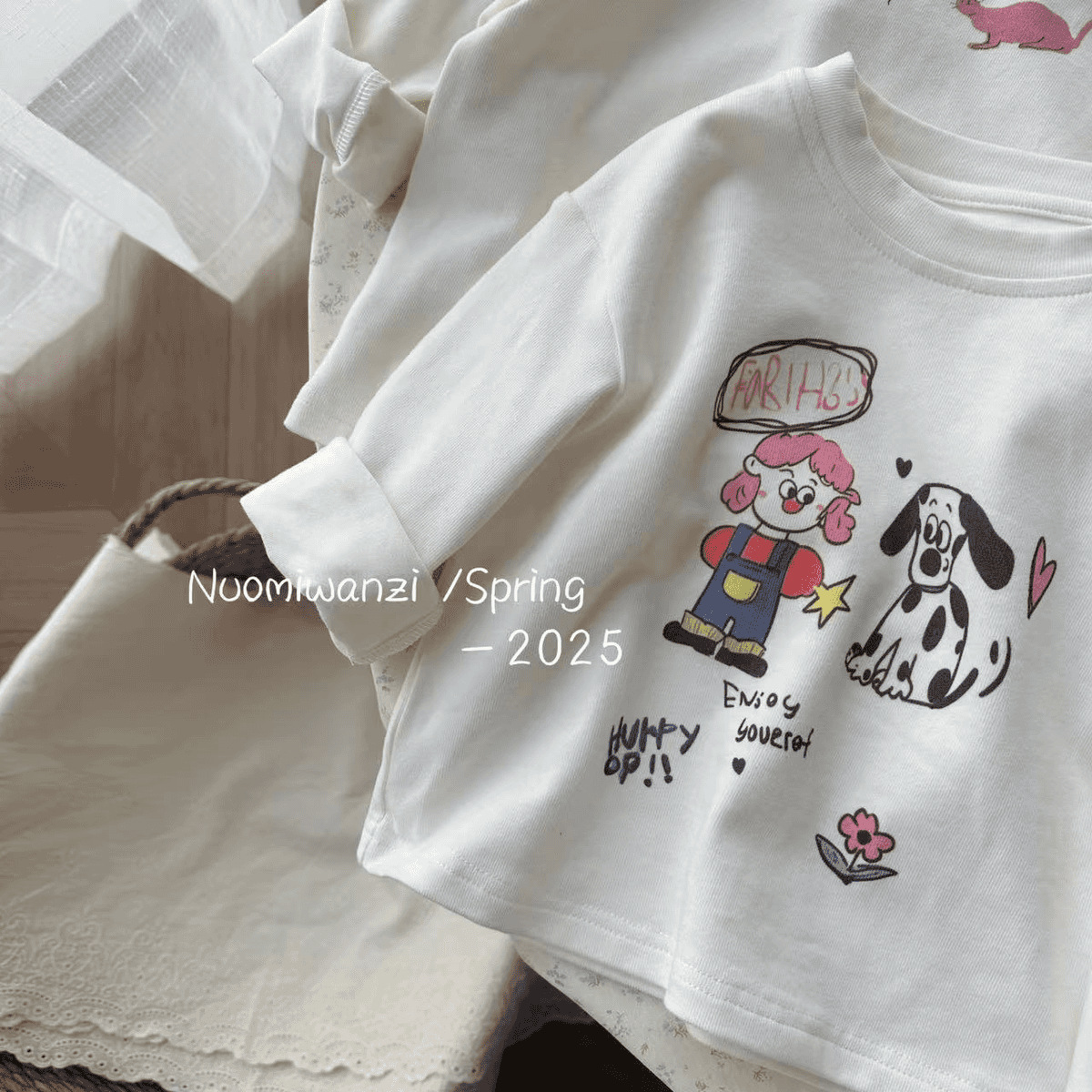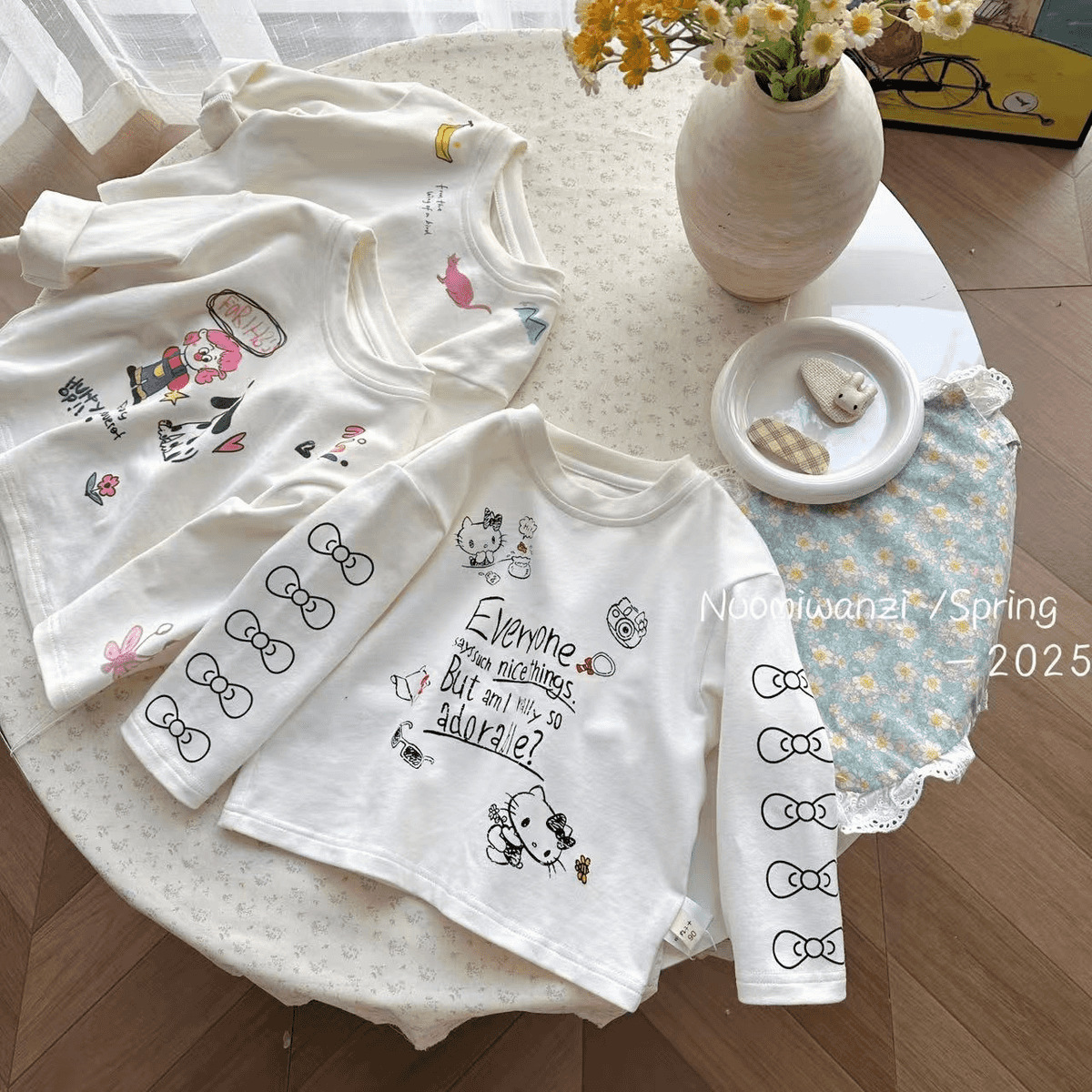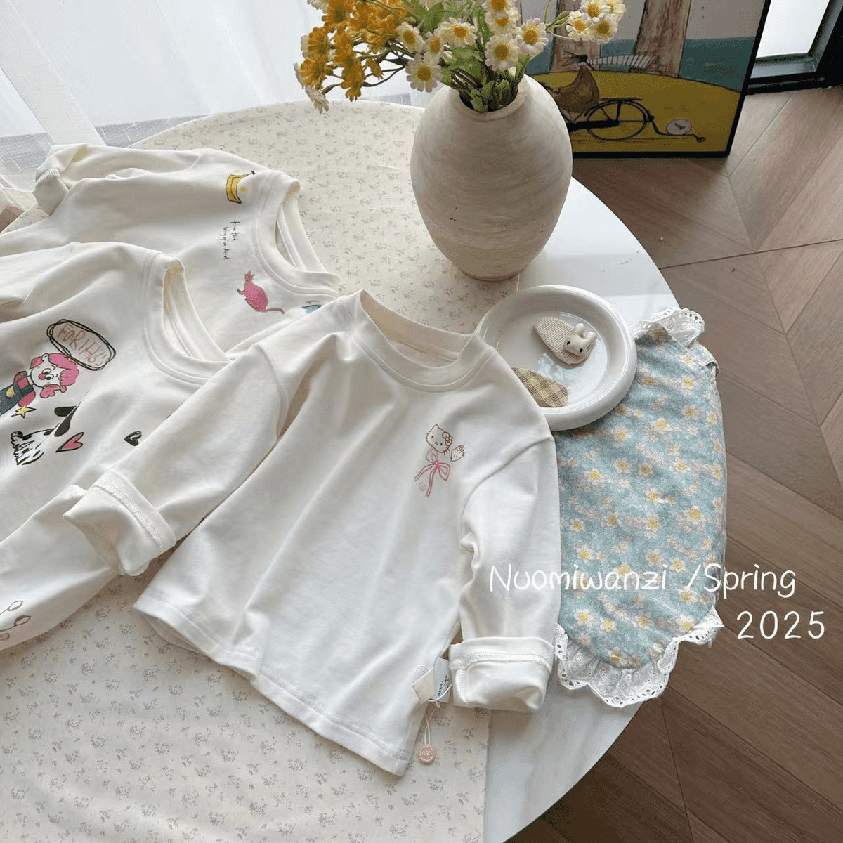 어린이 2025 봄 어린이 한국 스타일 인쇄 만화 코튼 라운드 넥 티셔츠 여성의 귀여운 봄과 가을 긴 소매스토어 가기
