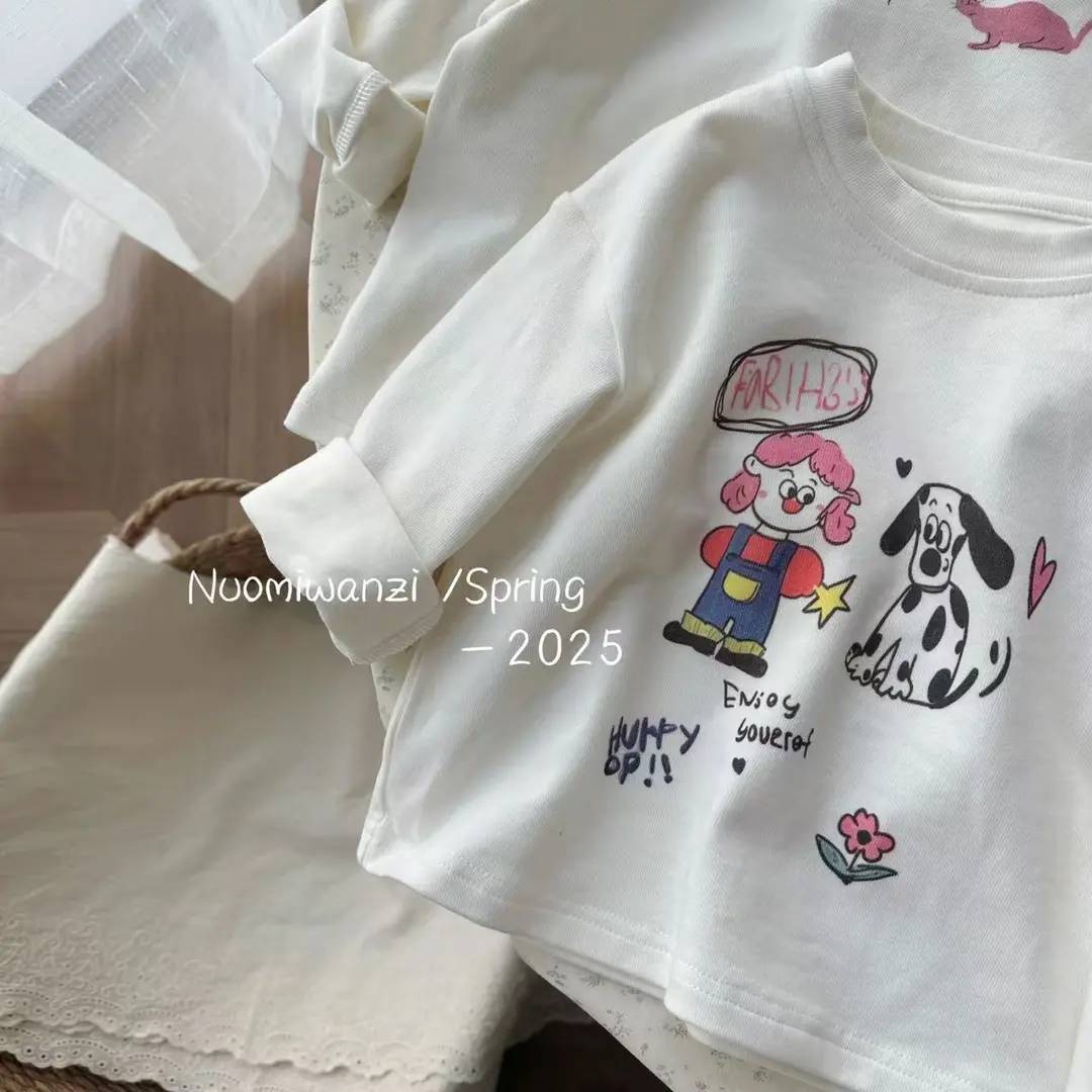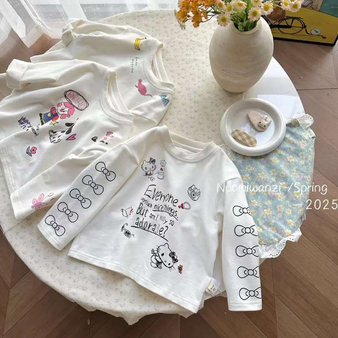 어린이 2025 봄 어린이 한국 스타일 인쇄 만화 코튼 라운드 넥 티셔츠 여성의 귀여운 봄과 가을 긴 소매