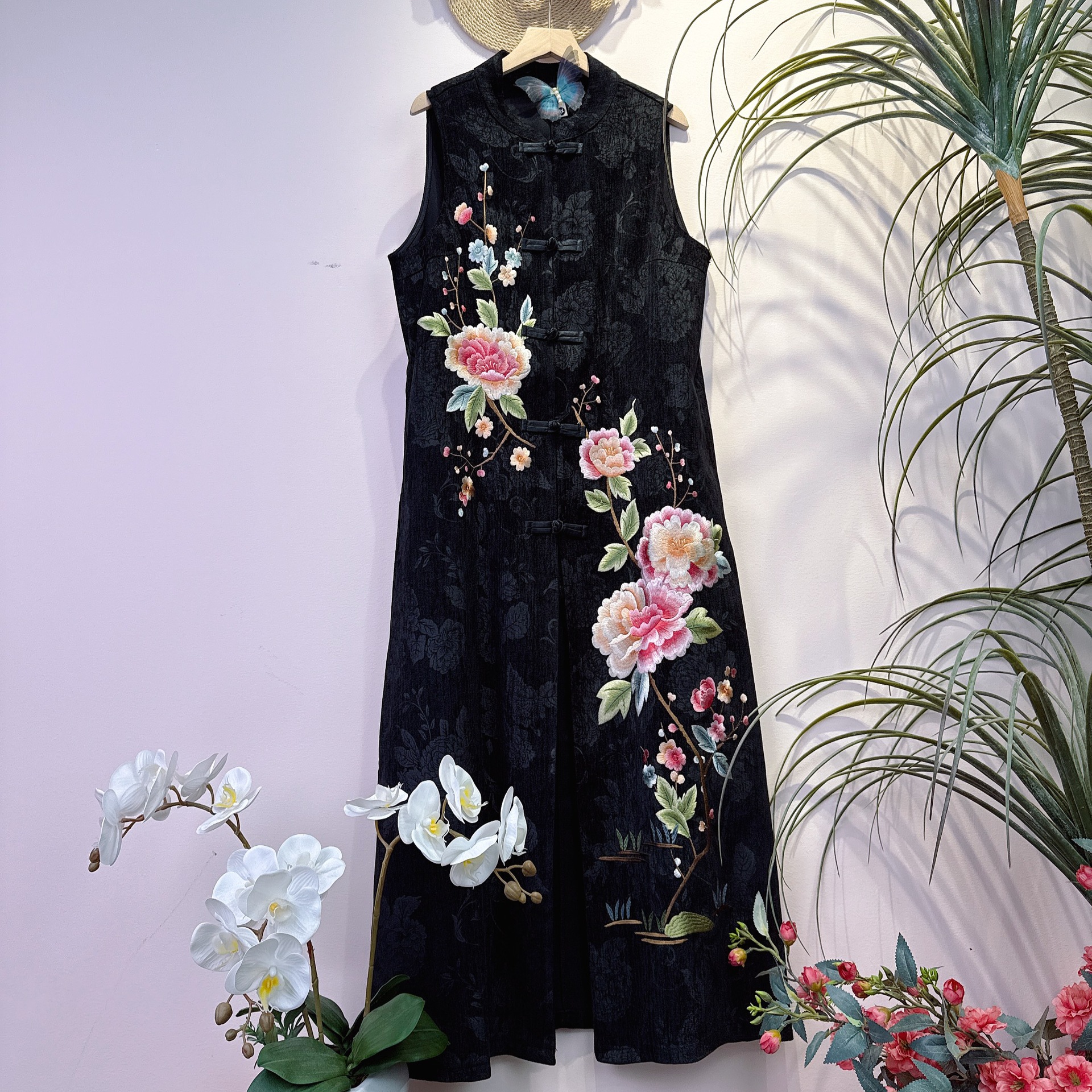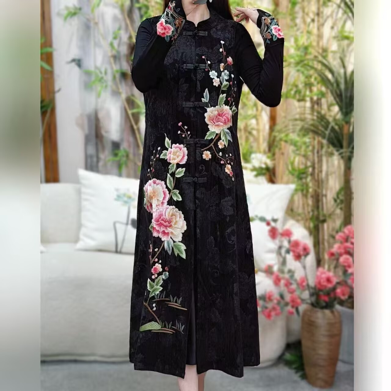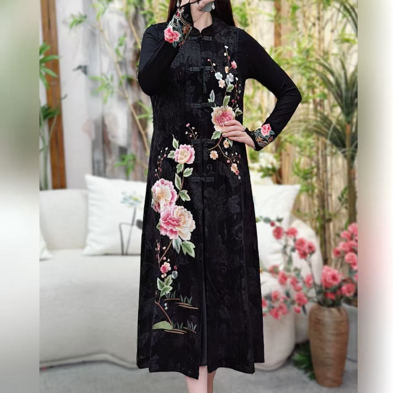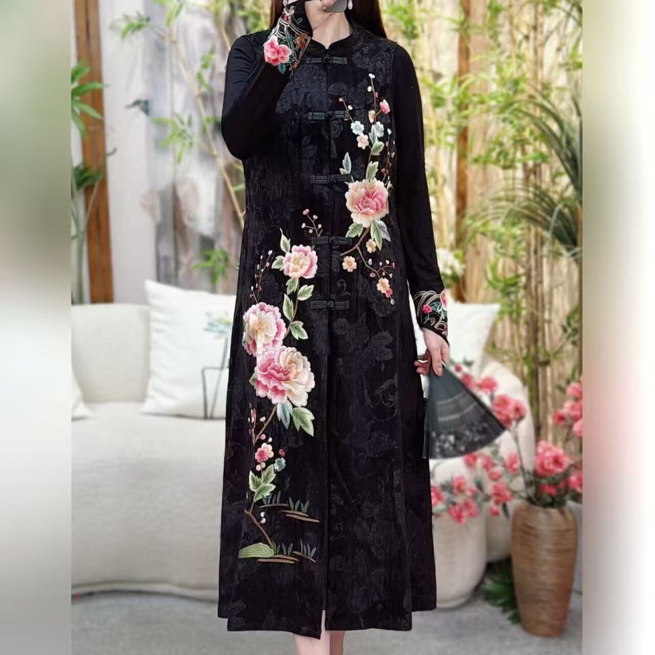 중국 스타일 여성 긴 조끼 가을 새로운 어머니의 코트 민족 스타일 카디건 모란 자수 조끼스토어 가기