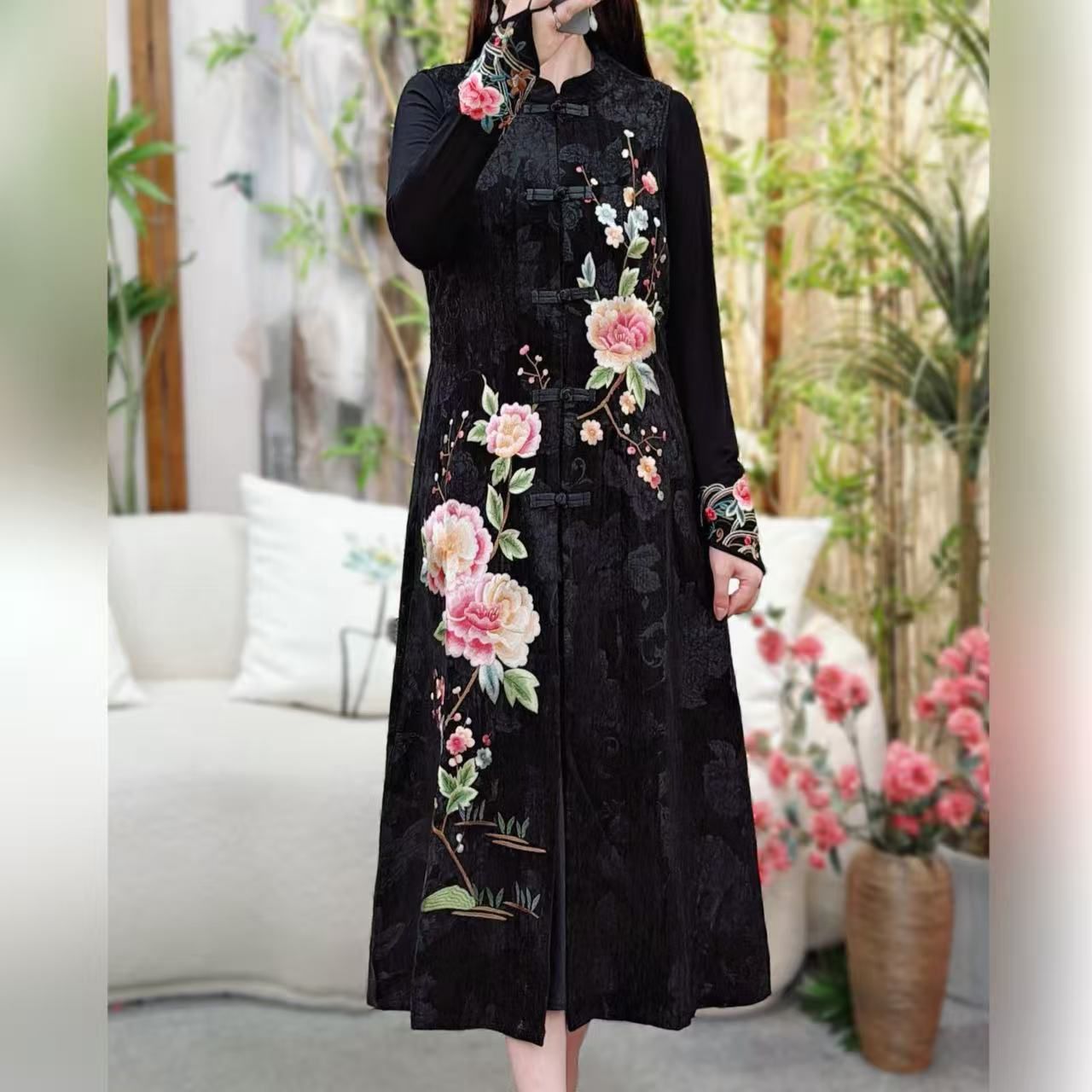 중국 스타일 여성 긴 조끼 가을 새로운 어머니의 코트 민족 스타일 카디건 모란 자수 조끼