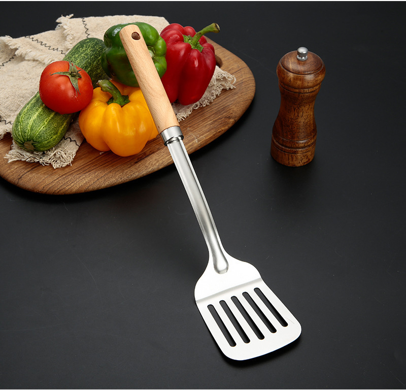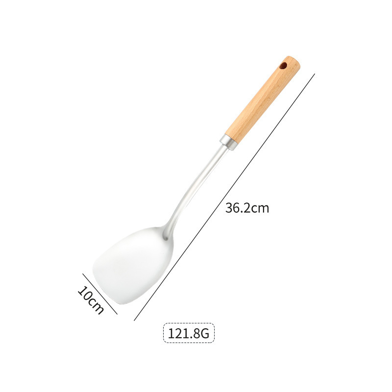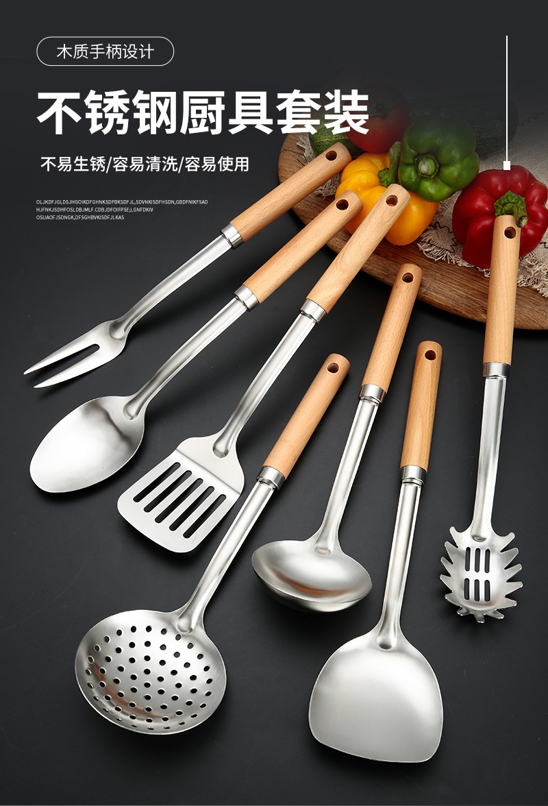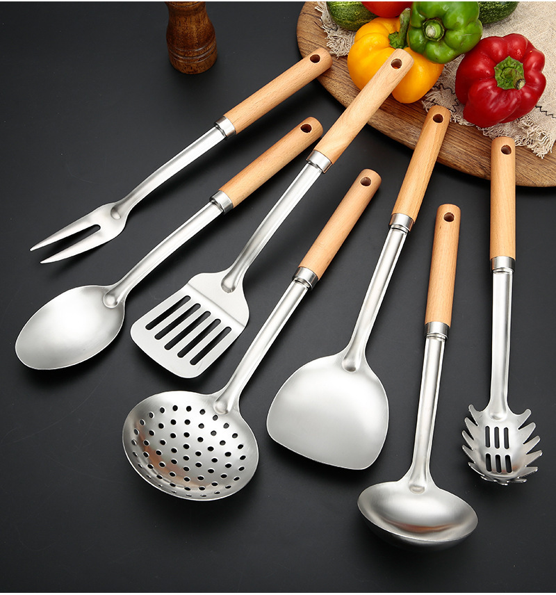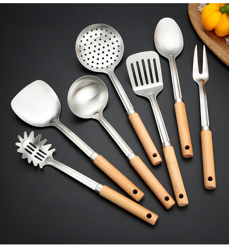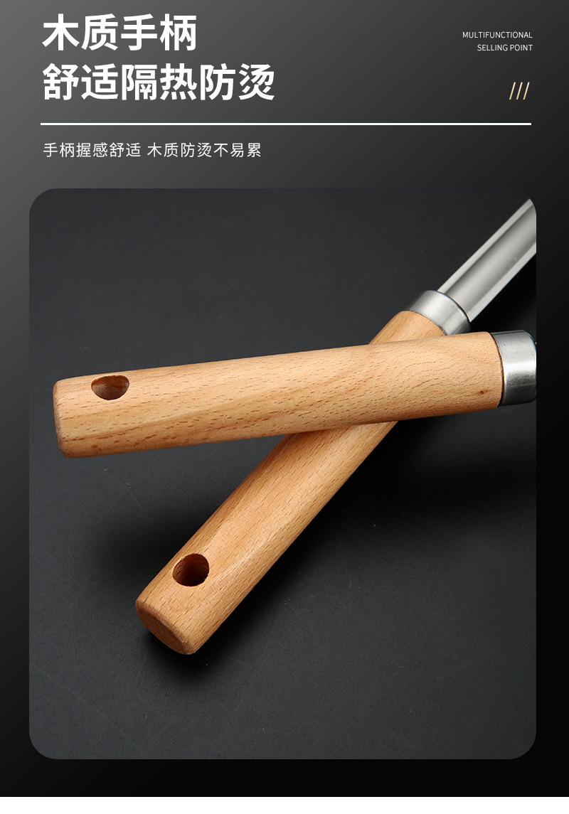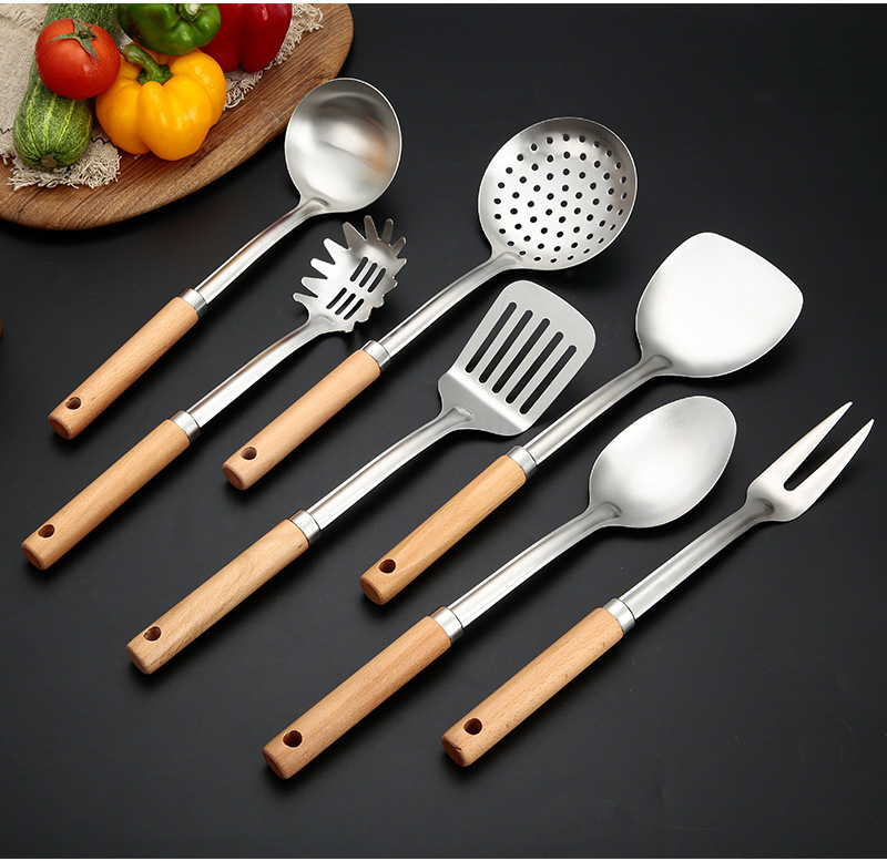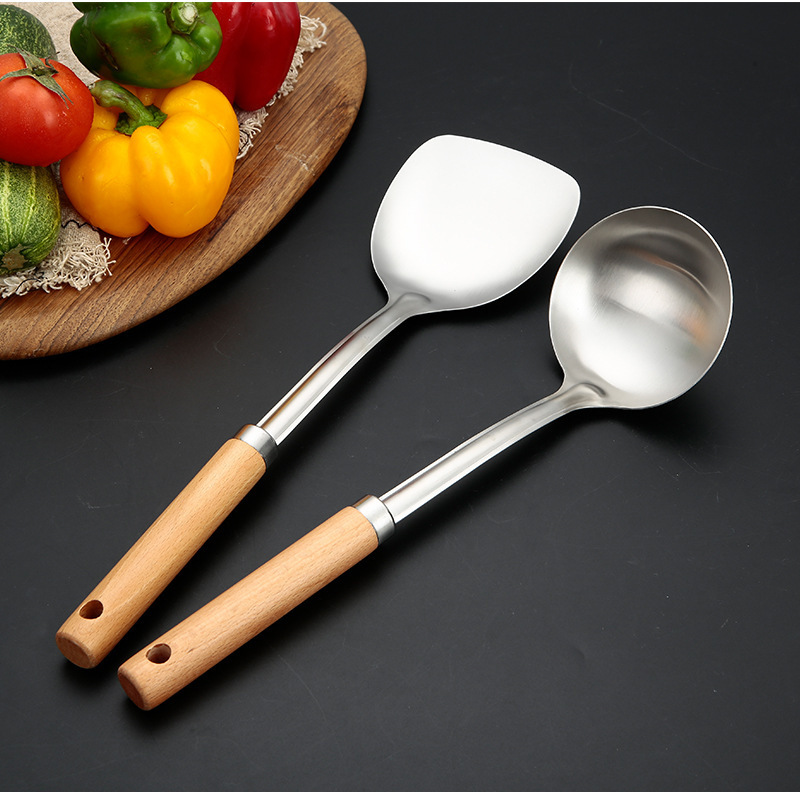 두꺼운 스테인레스 스틸 주걱 세트 나무 손잡이 주걱 가정용 주방 요리 도구 요리 주걱 수프 스푼 드레인 프라이팬 주걱스토어 가기