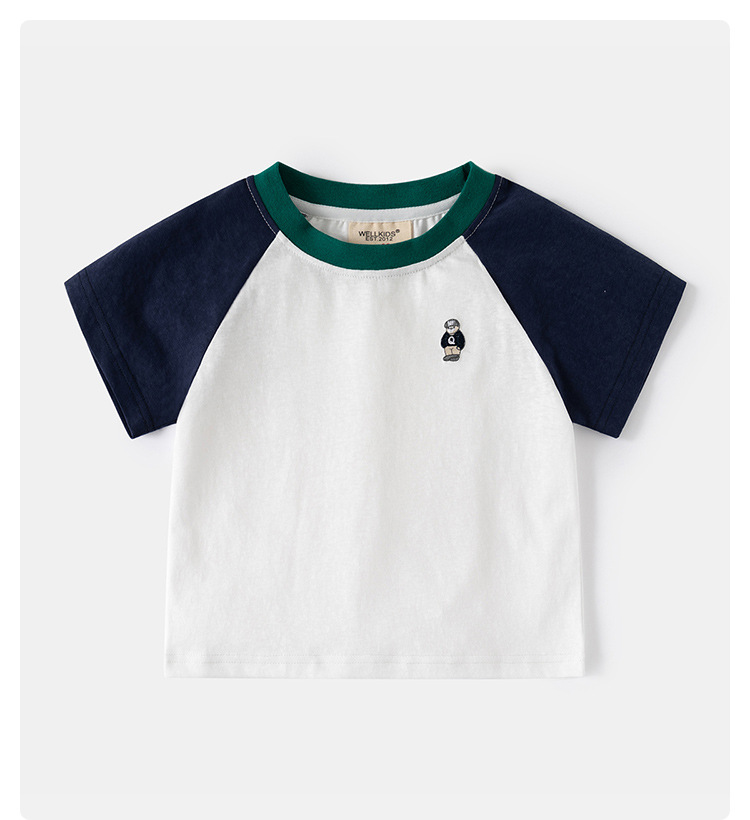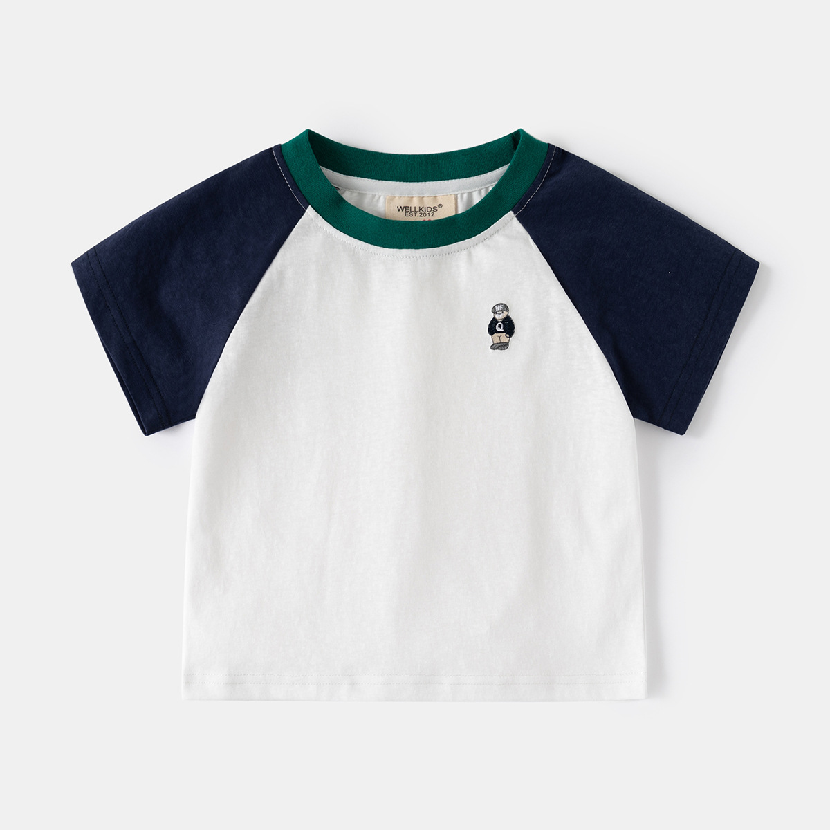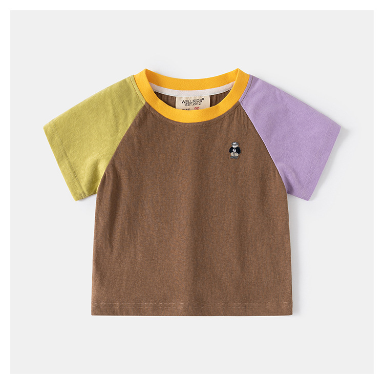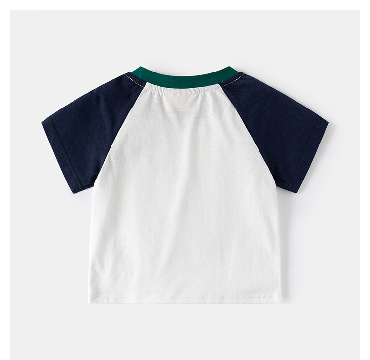 2025 새로운 어린이 반팔 티셔츠 여름 소년 반팔 탑 베이비 대비 색 패치 워크 슬리브 바닥 셔츠 유행 도매스토어 가기
