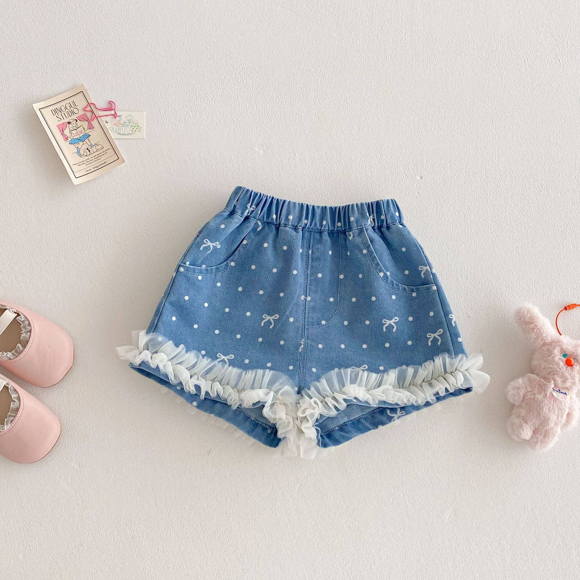 여아 한국 스타일 반바지 2026년 신상 여름 여아용 세련된 리본 청바지 아동용 물방울 무늬 바지 트렌디