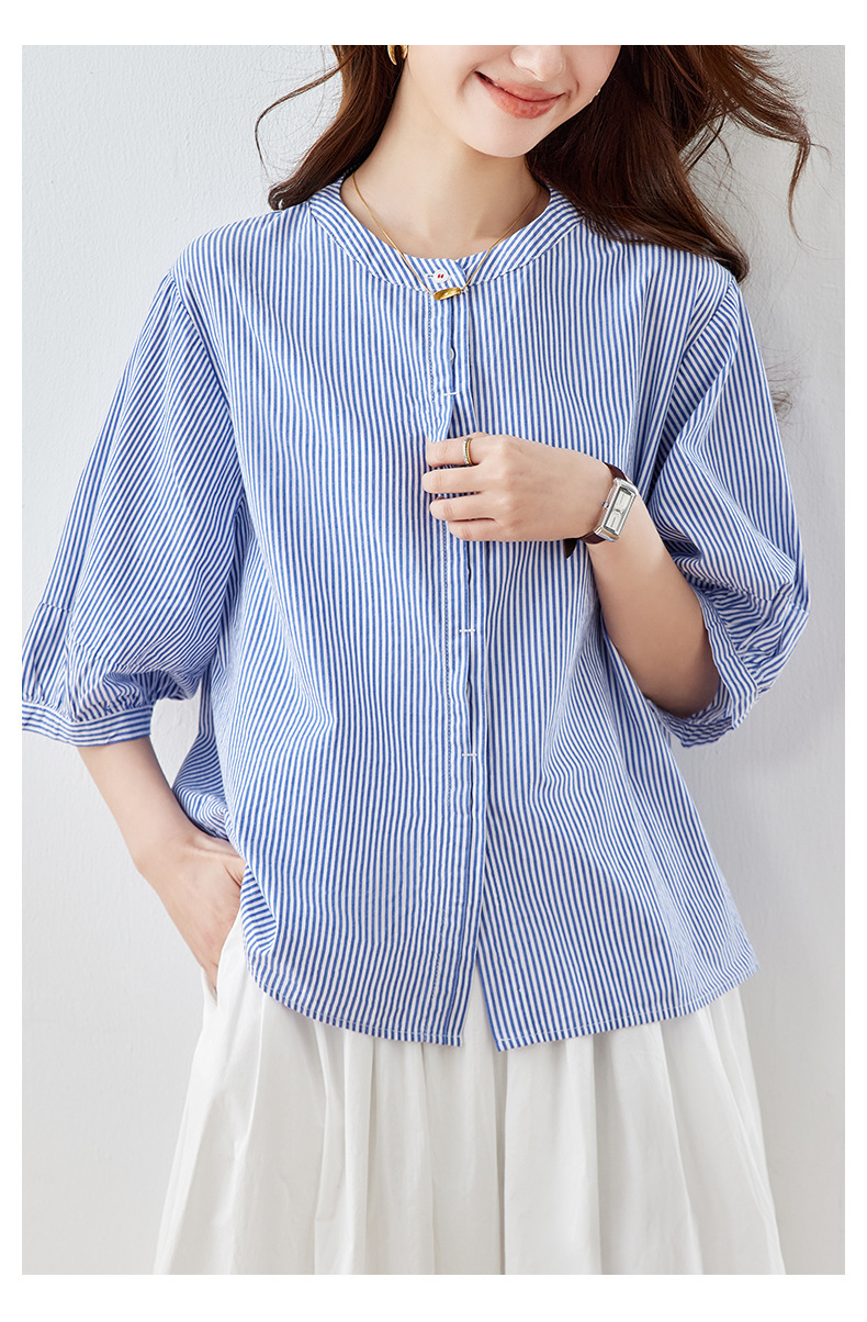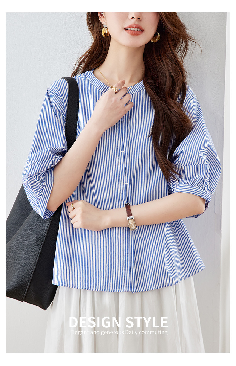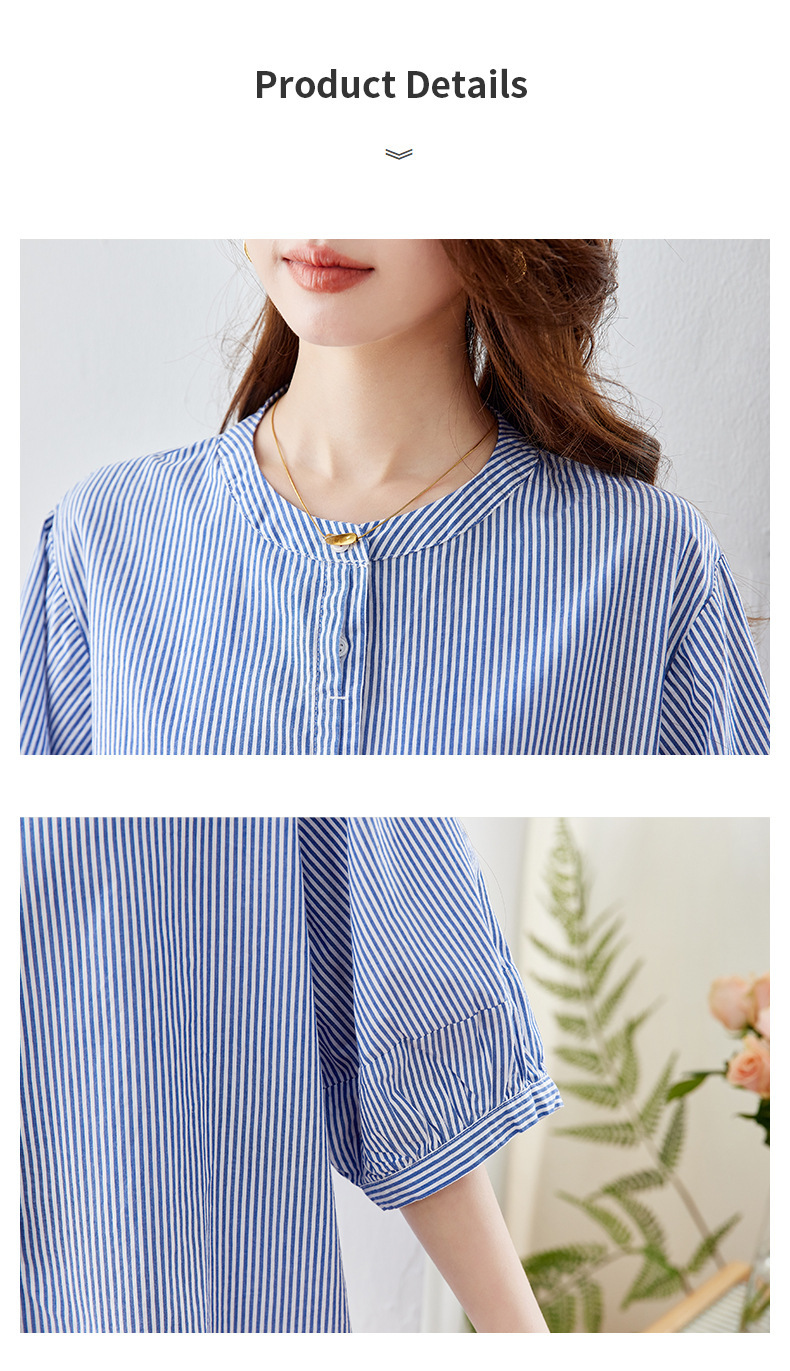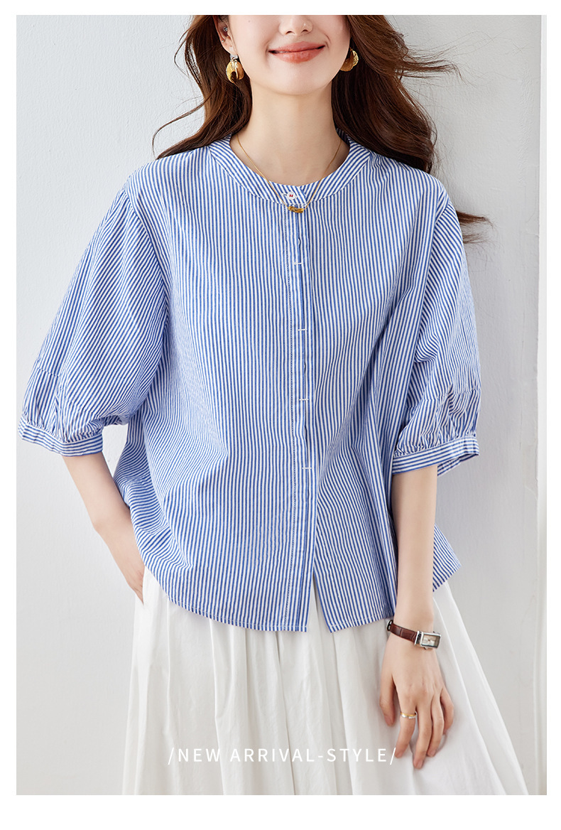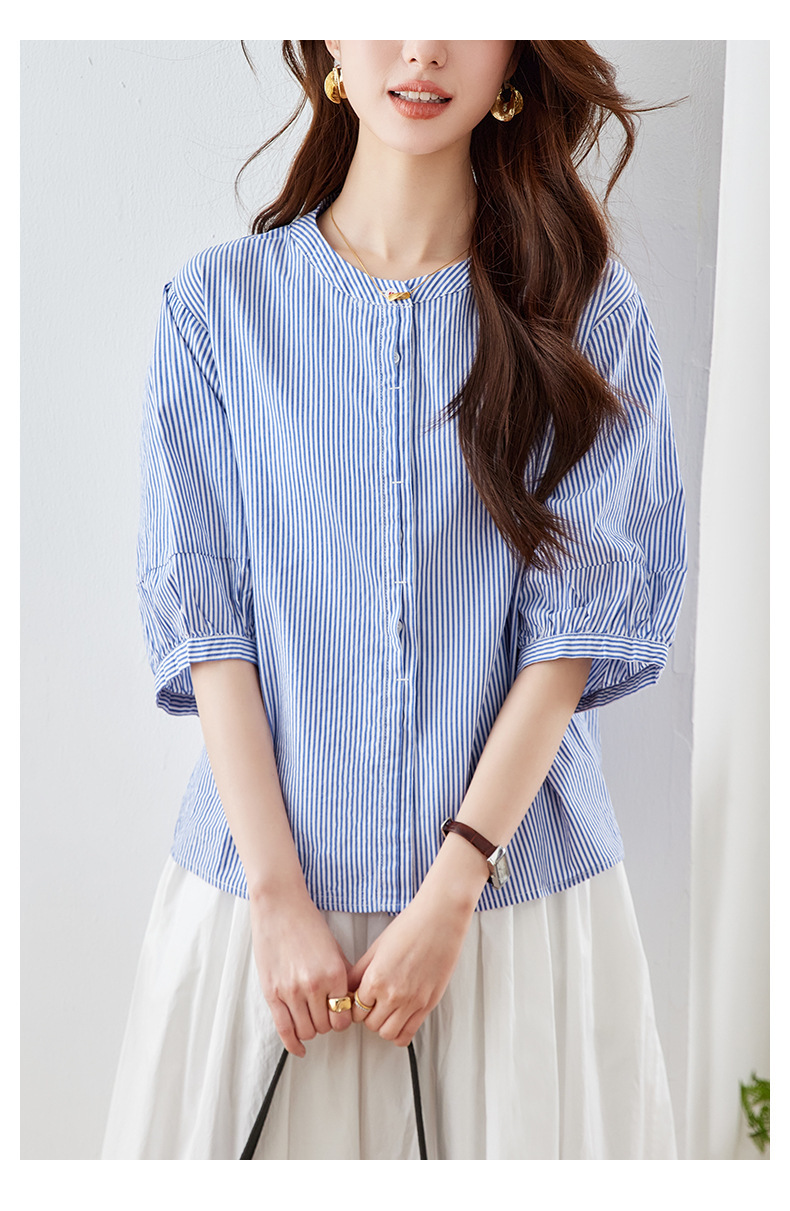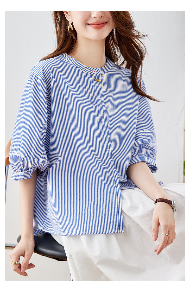 2025 년 여름 뉴 코튼 루즈 캐주얼 반팔 셔츠 여자 블루 스트라이프 라운드 넥 탑 통기성 올 매치 셔츠