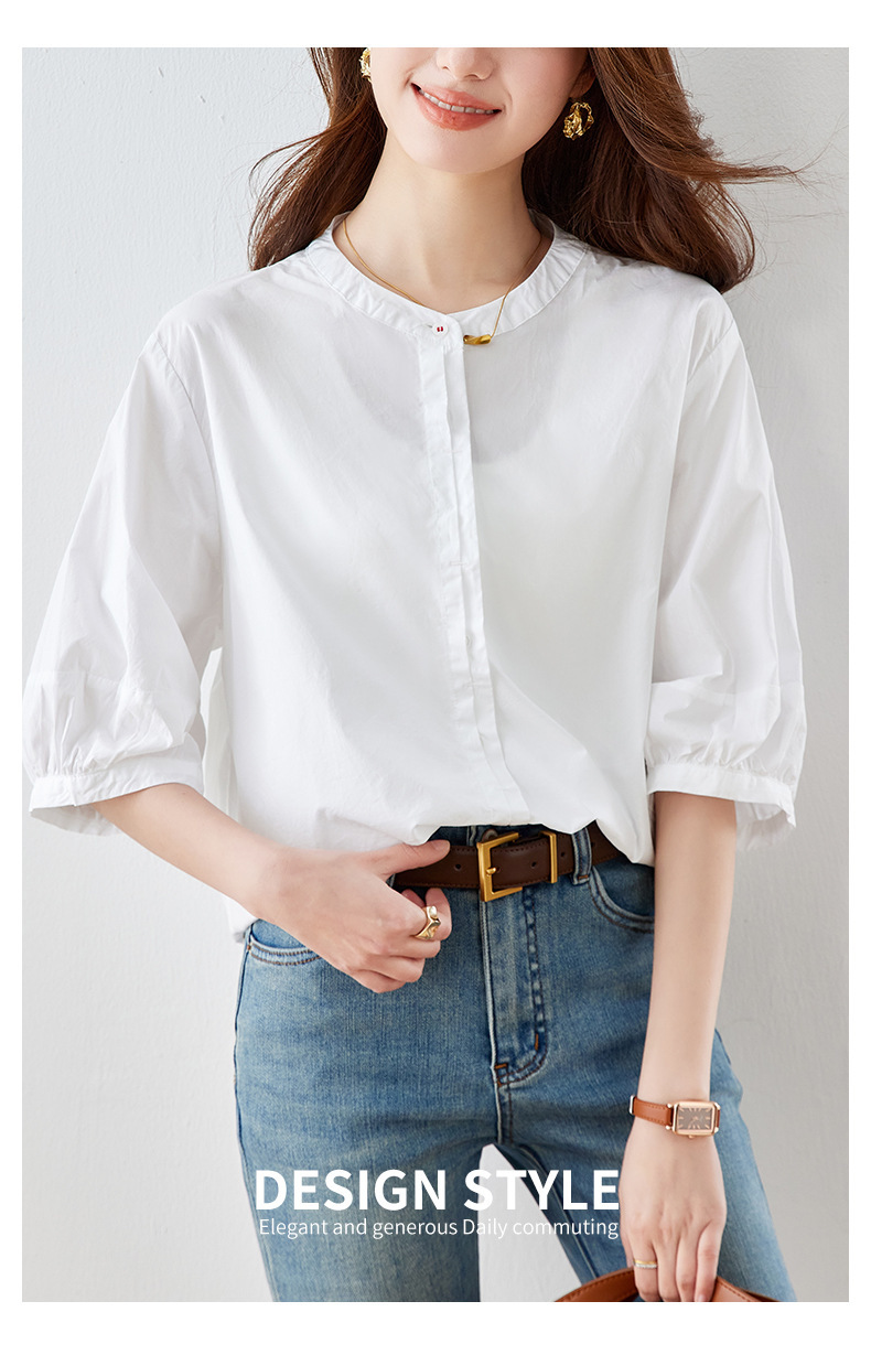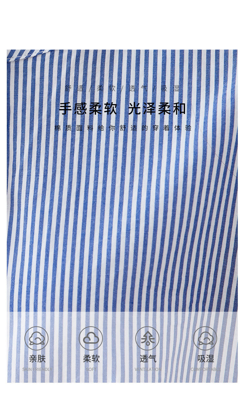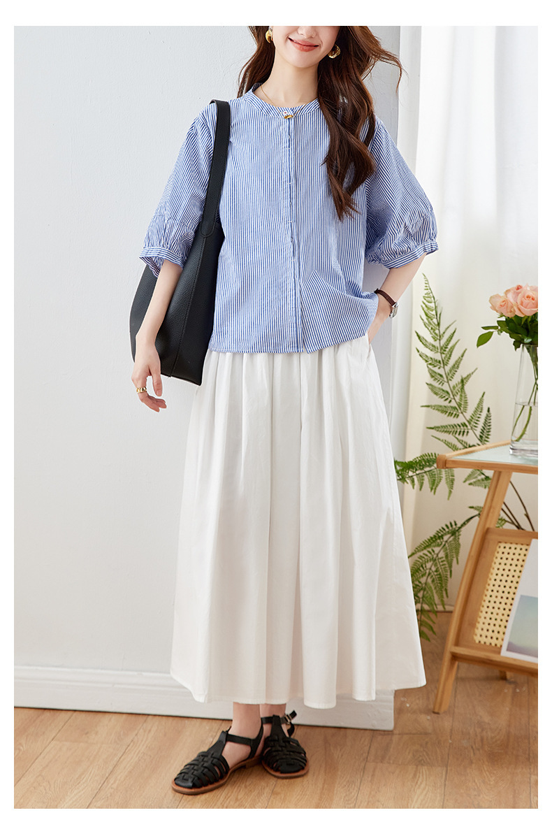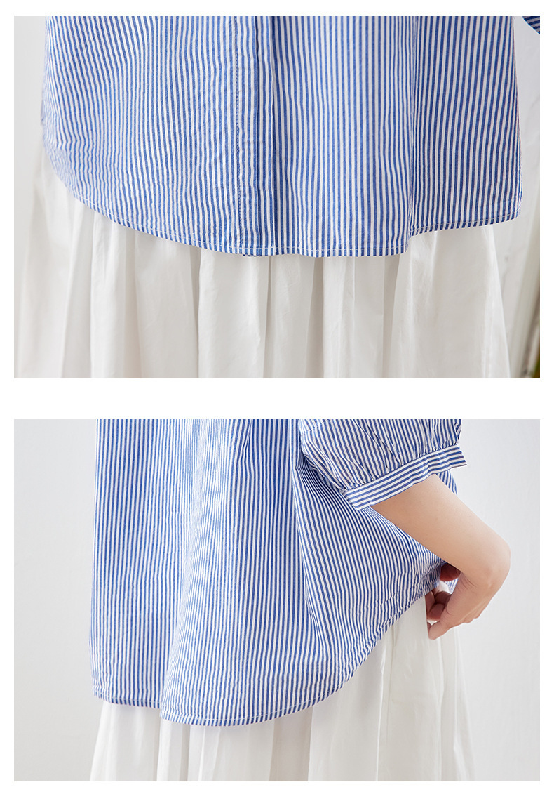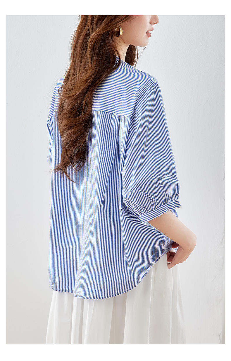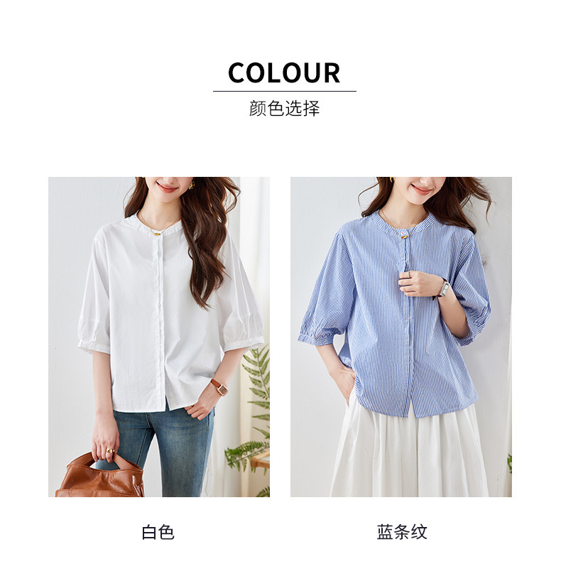 2025 년 여름 뉴 코튼 루즈 캐주얼 반팔 셔츠 여자 블루 스트라이프 라운드 넥 탑 통기성 올 매치 셔츠