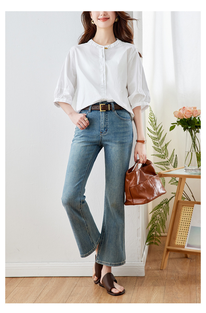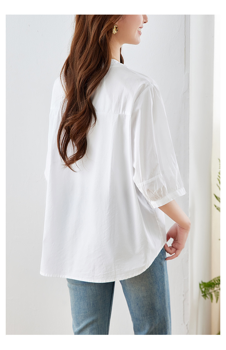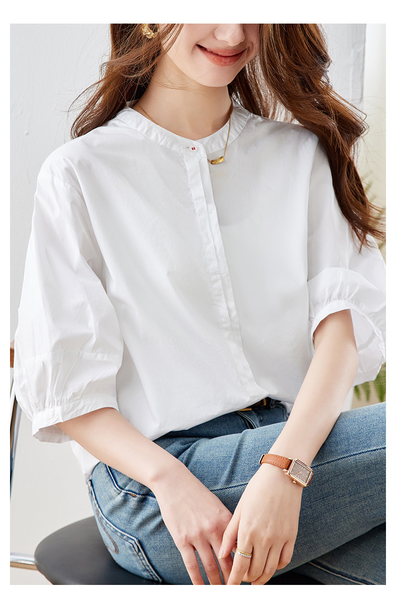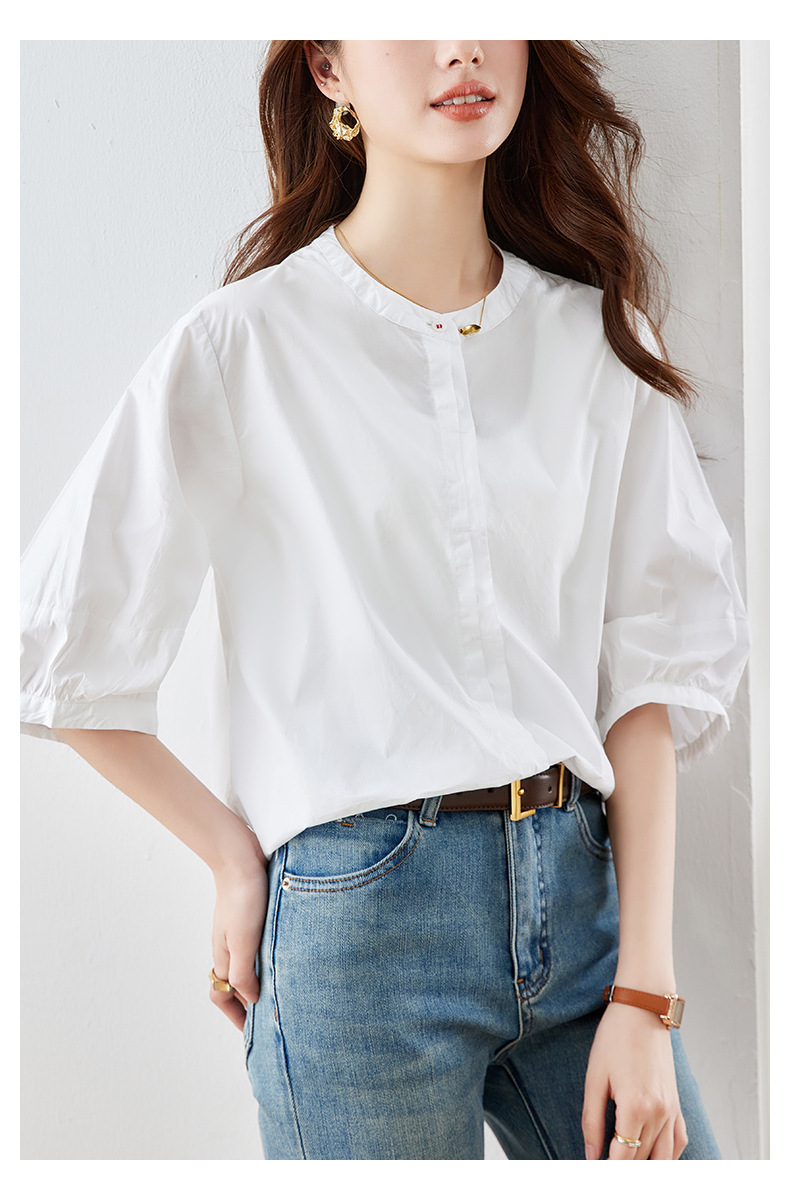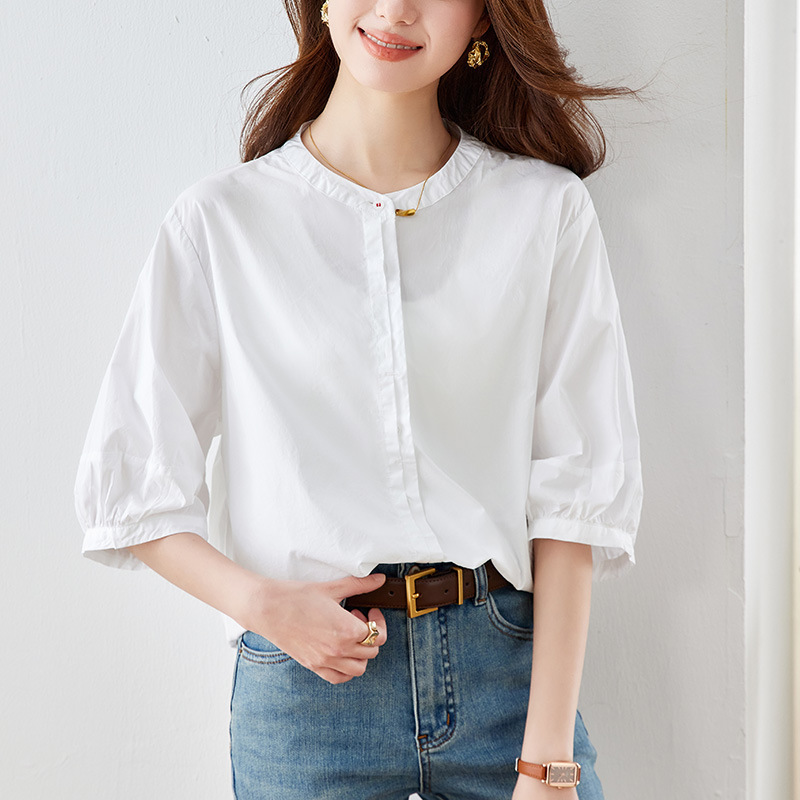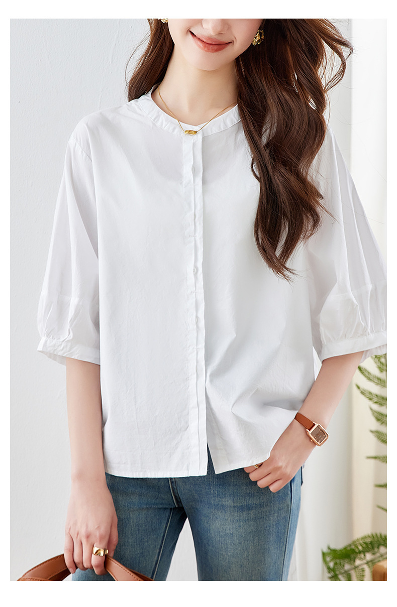 2025 년 여름 뉴 코튼 루즈 캐주얼 반팔 셔츠 여자 블루 스트라이프 라운드 넥 탑 통기성 올 매치 셔츠