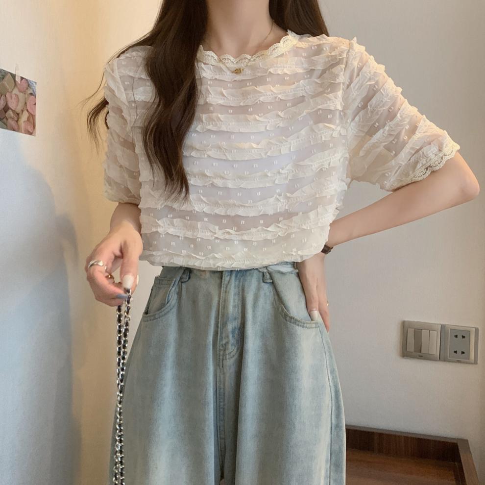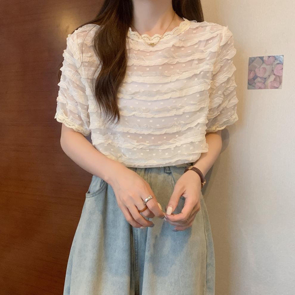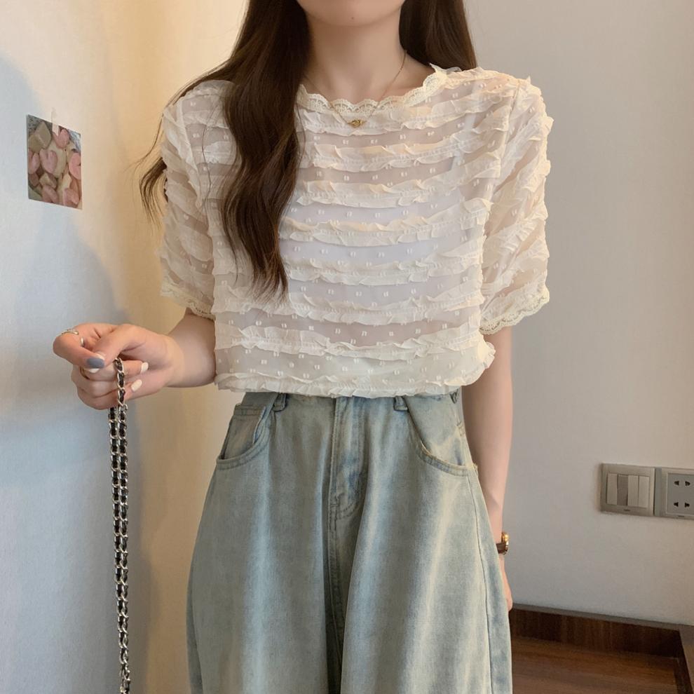 플러스 사이즈 여성 의류, 슈퍼 요정, 달콤한 레이스, 쉬폰, 시크한 퍼프 슬리브, 패셔너블한 셔츠의 실제 사진스토어 가기