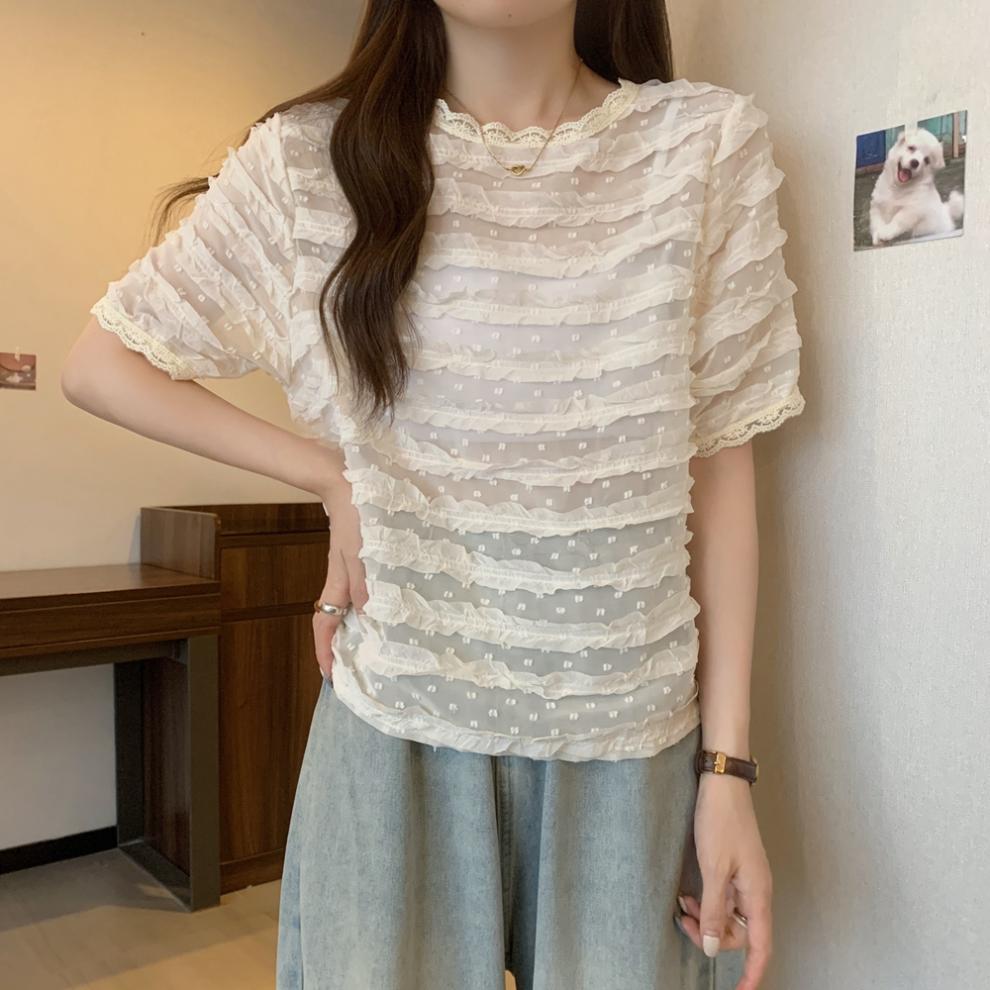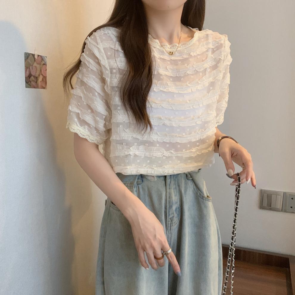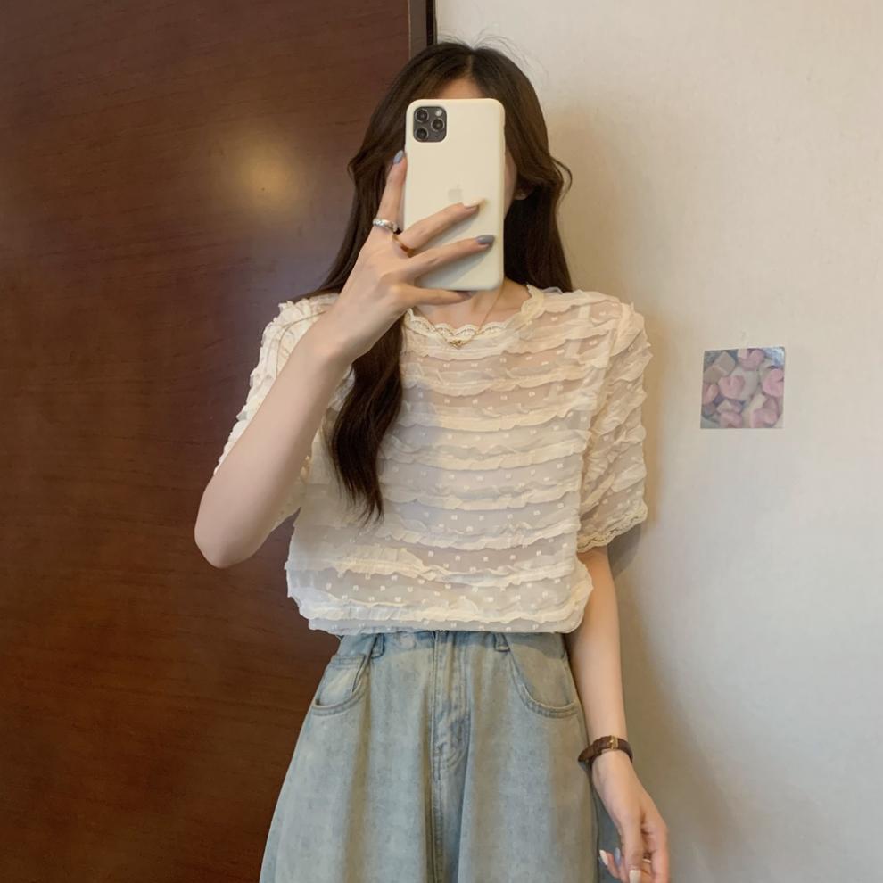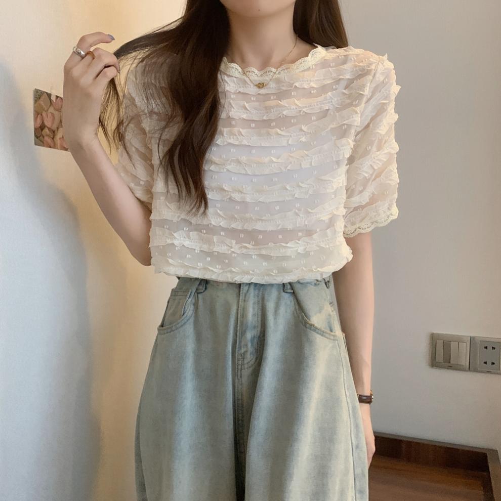 플러스 사이즈 여성 의류, 슈퍼 요정, 달콤한 레이스, 쉬폰, 시크한 퍼프 슬리브, 패셔너블한 셔츠의 실제 사진스토어 가기