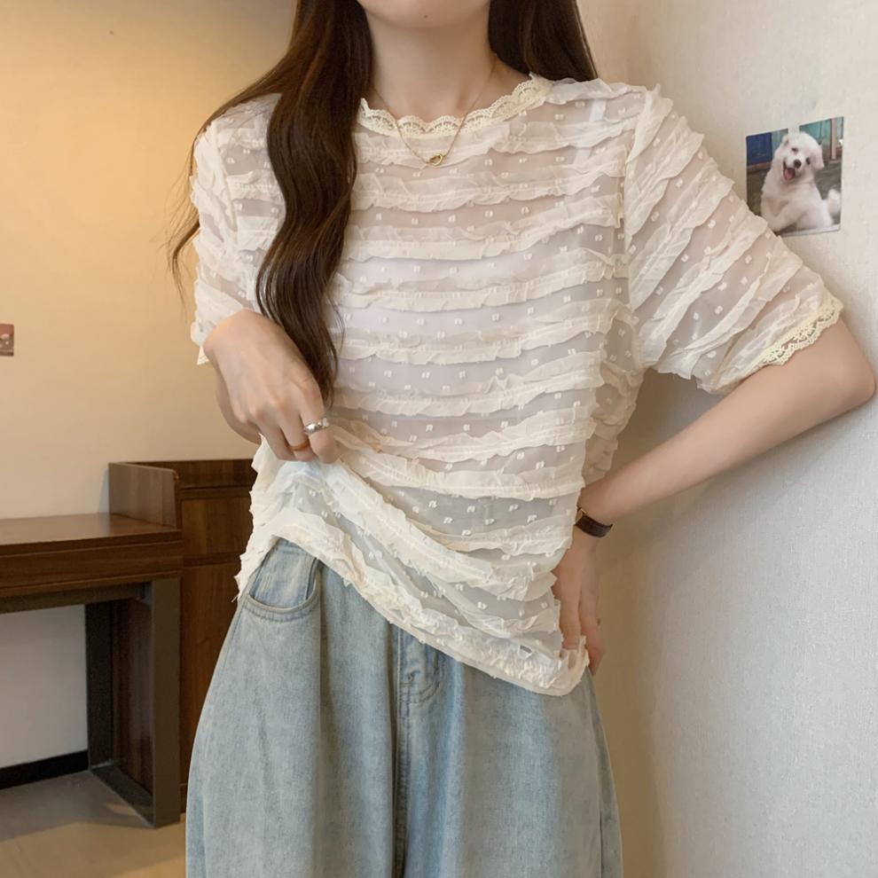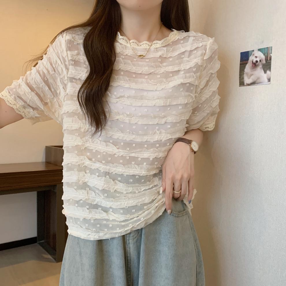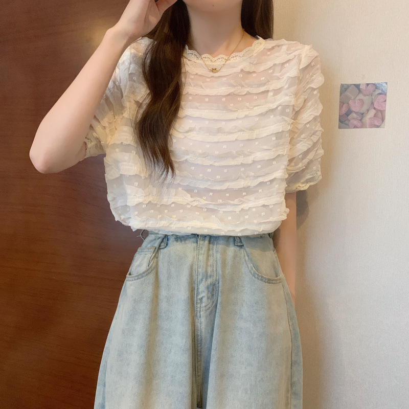플러스 사이즈 여성 의류, 슈퍼 요정, 달콤한 레이스, 쉬폰, 시크한 퍼프 슬리브, 패셔너블한 셔츠의 실제 사진