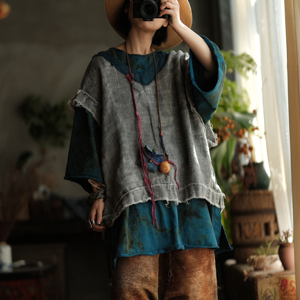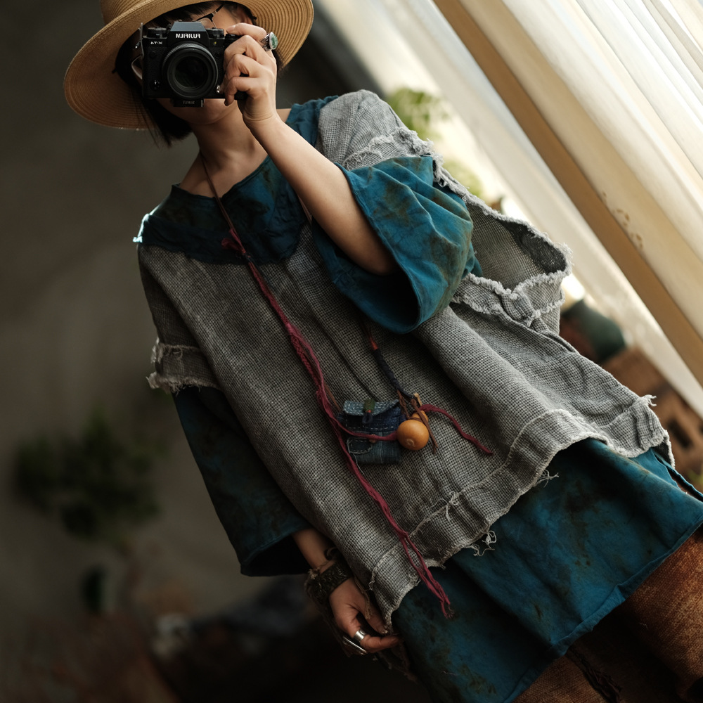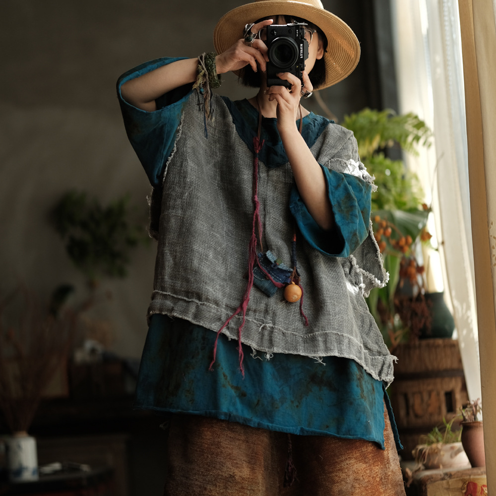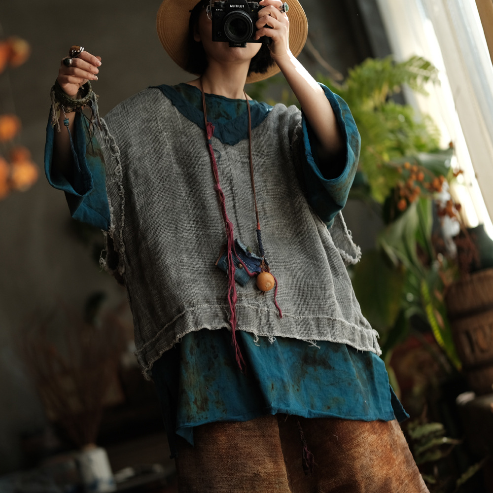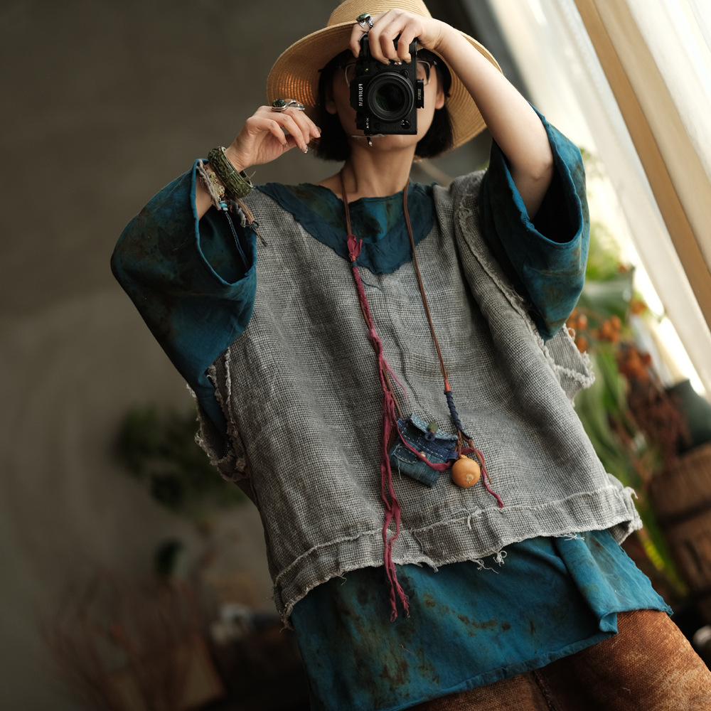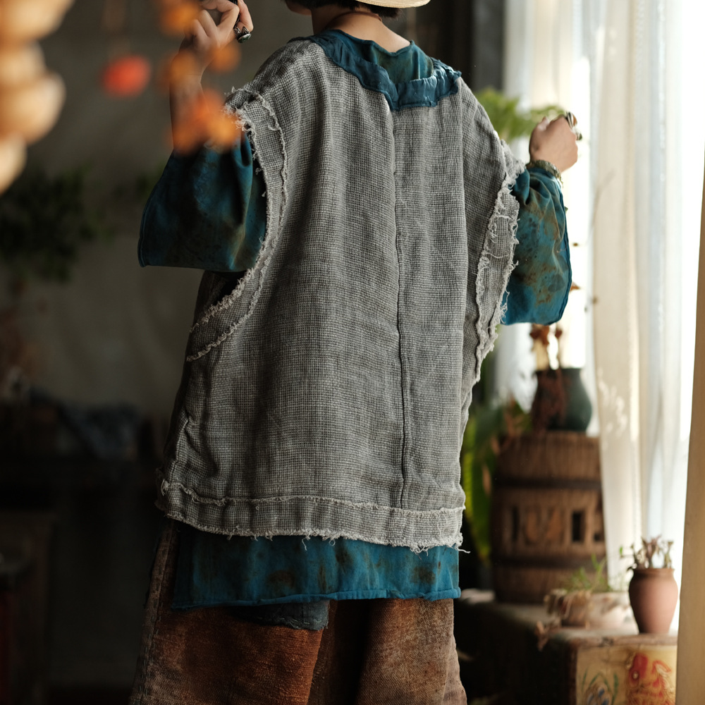 샤오니우 셔우(小泥姑娘) 오리지널 여성복 레트로 문예 스타일 린넨 라운드넥 롤업 밑단 조끼 2353 그레이스토어 가기