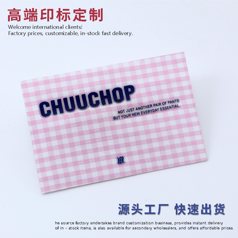 분홍색과 흰색 체크무늬 의류용 고밀도 인쇄 라벨, 아동복 및 여성복 칼라 라벨, 두꺼운 버전, 실크 인쇄 로고, 상표, 직조 라벨스토어 가기