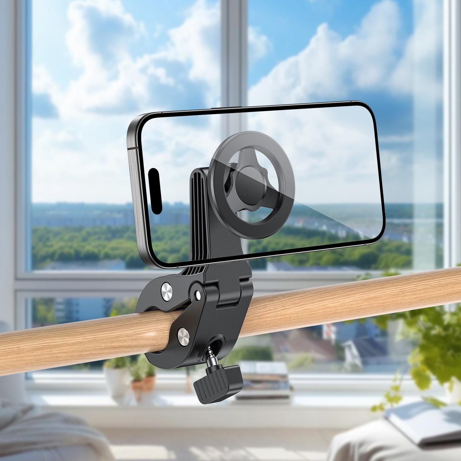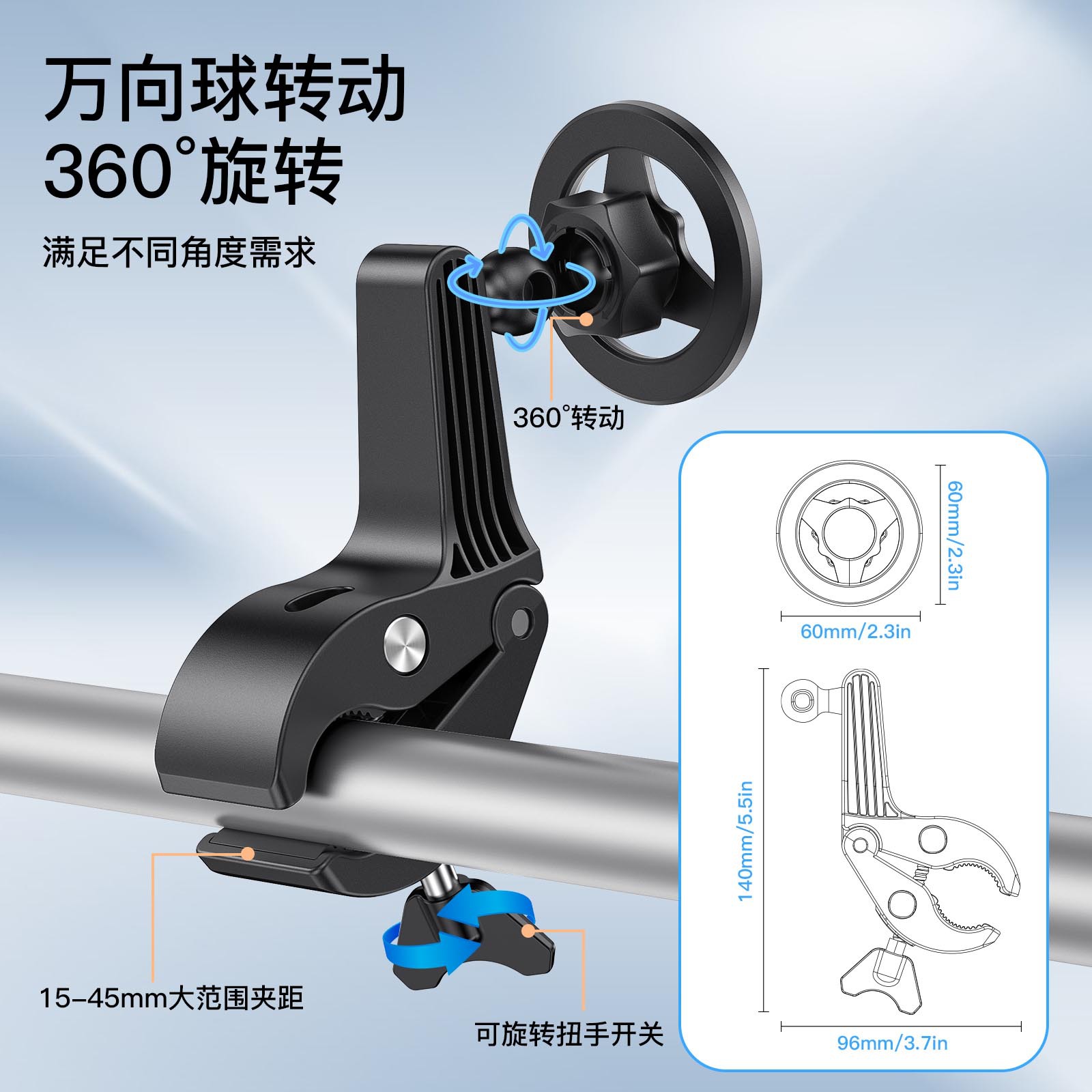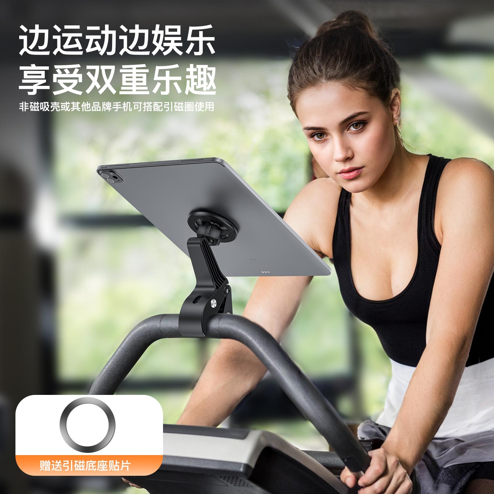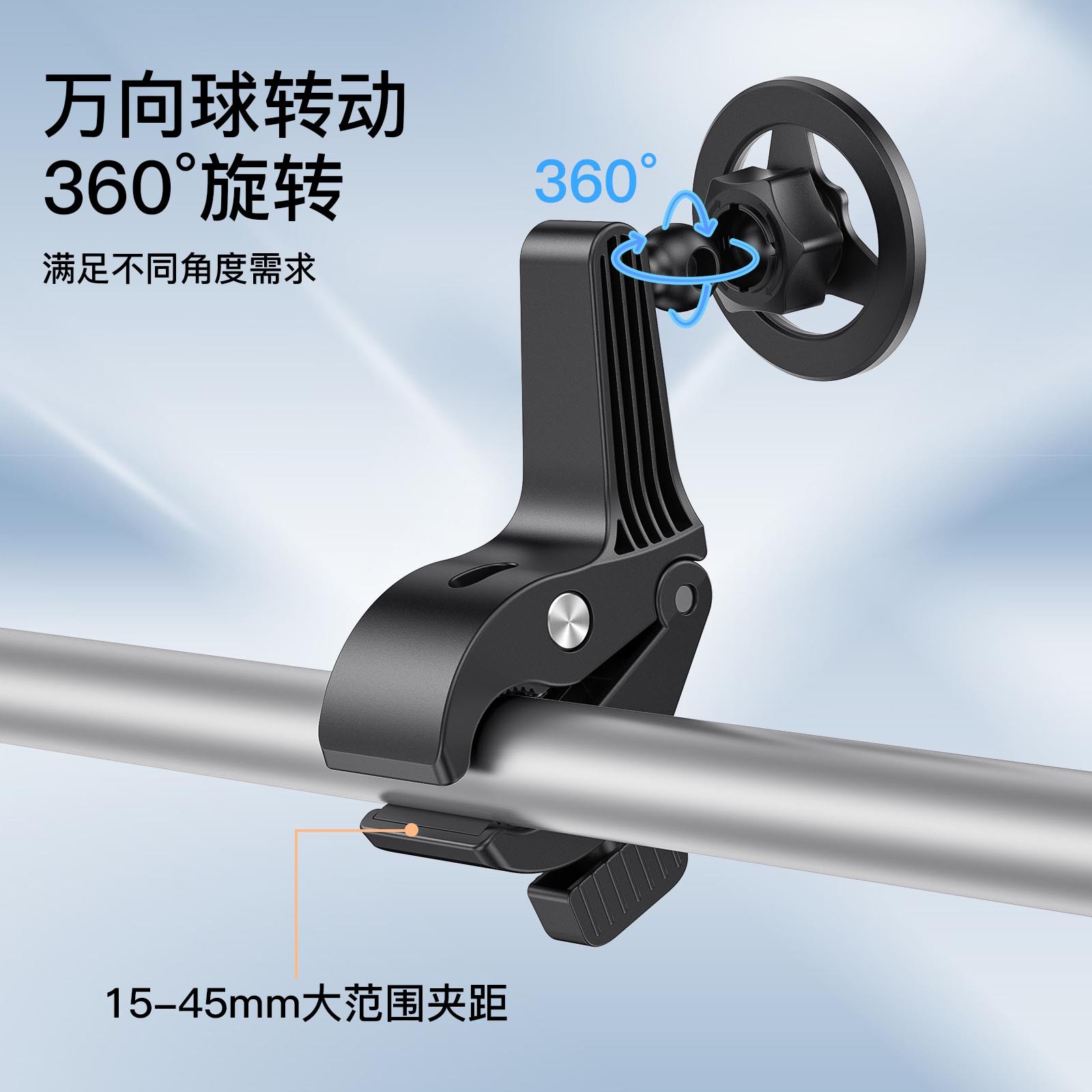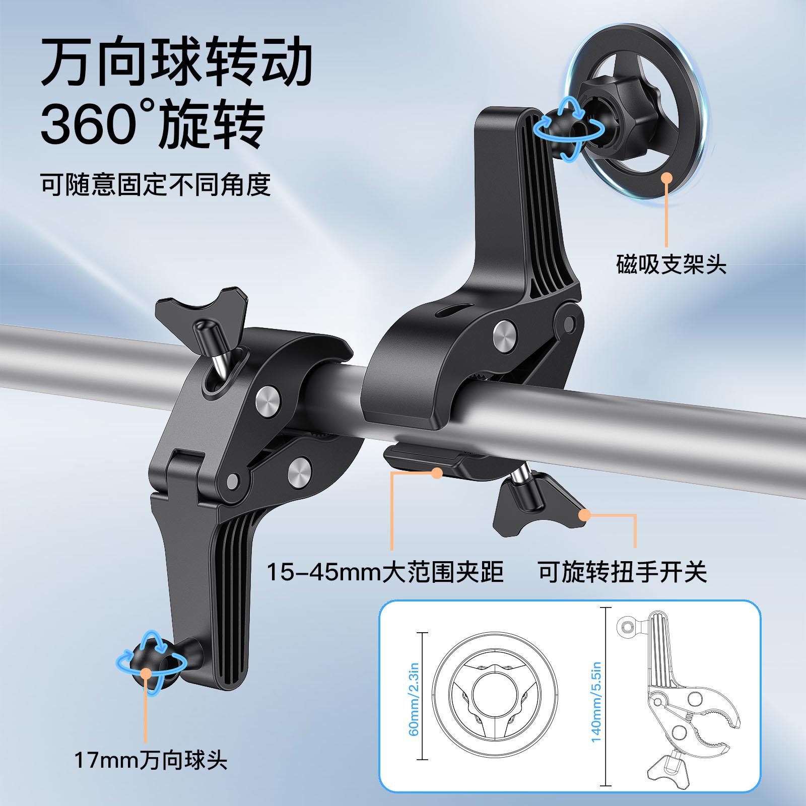 产品特性:适用任何杆形状物,手推车、桌面、工作台直播、录视频、课堂、跑步机、户外等等场景使用,万向调节,强磁铁通用手机、平板。