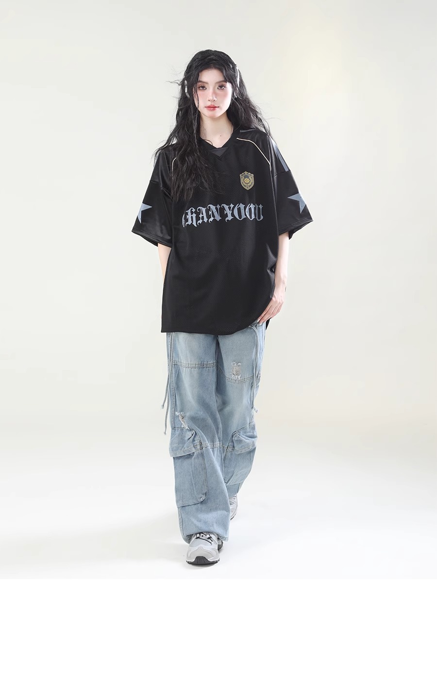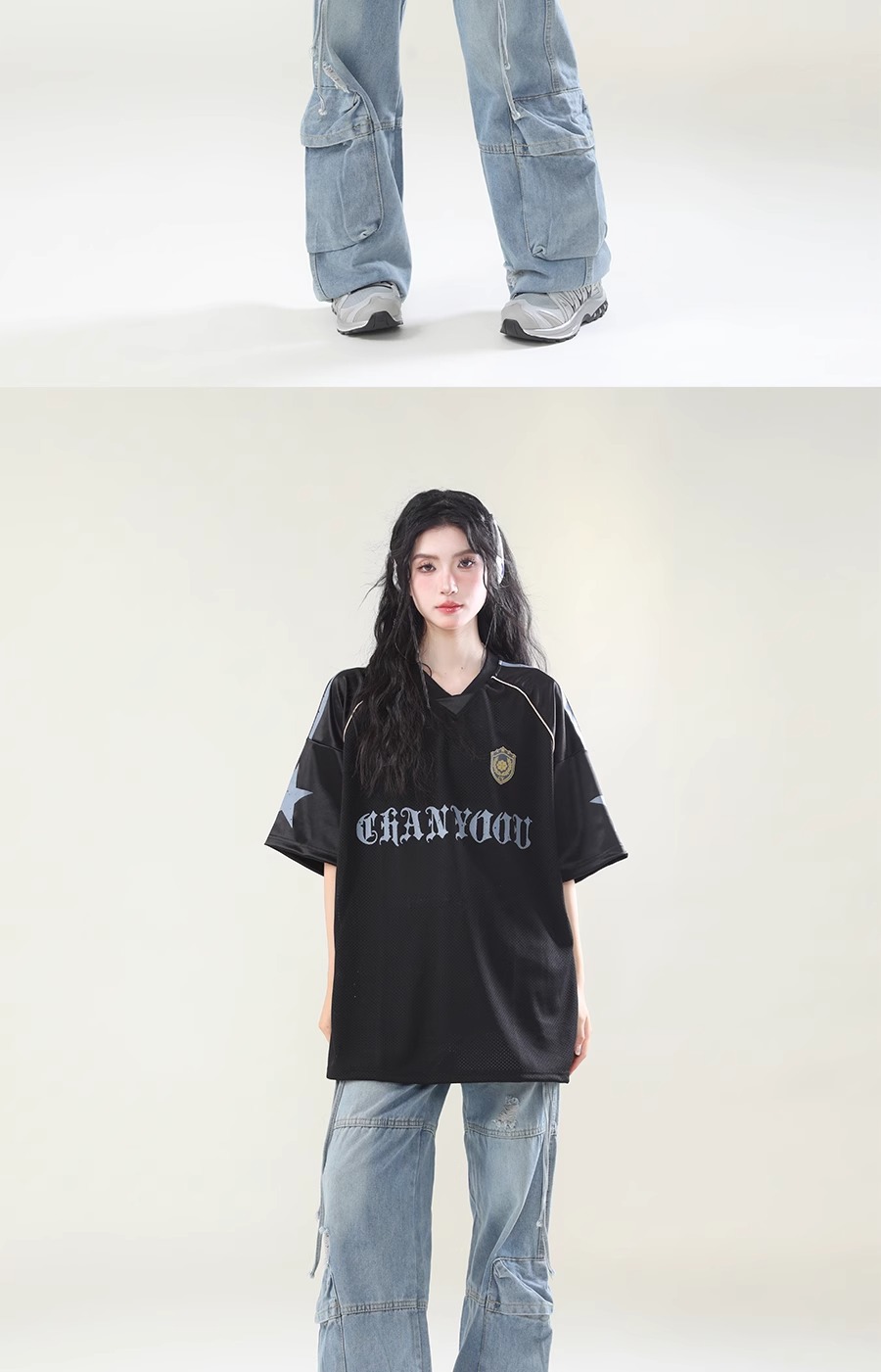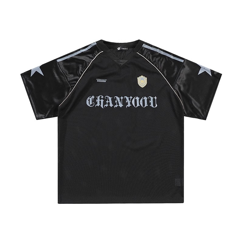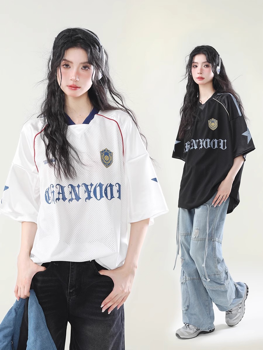 미국 스타일 패션 브랜드 스포츠 할로우 통기성 하이 스트리트 저지 반팔 티셔츠 여성 패션 브랜드 루즈 디자인 센스 탑 인 패션 패션스토어 가기