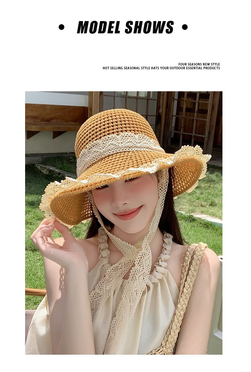 여름 레이스 장식 해변 모자, 넓은 챙 차양 밀짚모자, 통기성 밀짚 얼굴 가리개 자외선 차단 모자 (성인용)스토어 가기