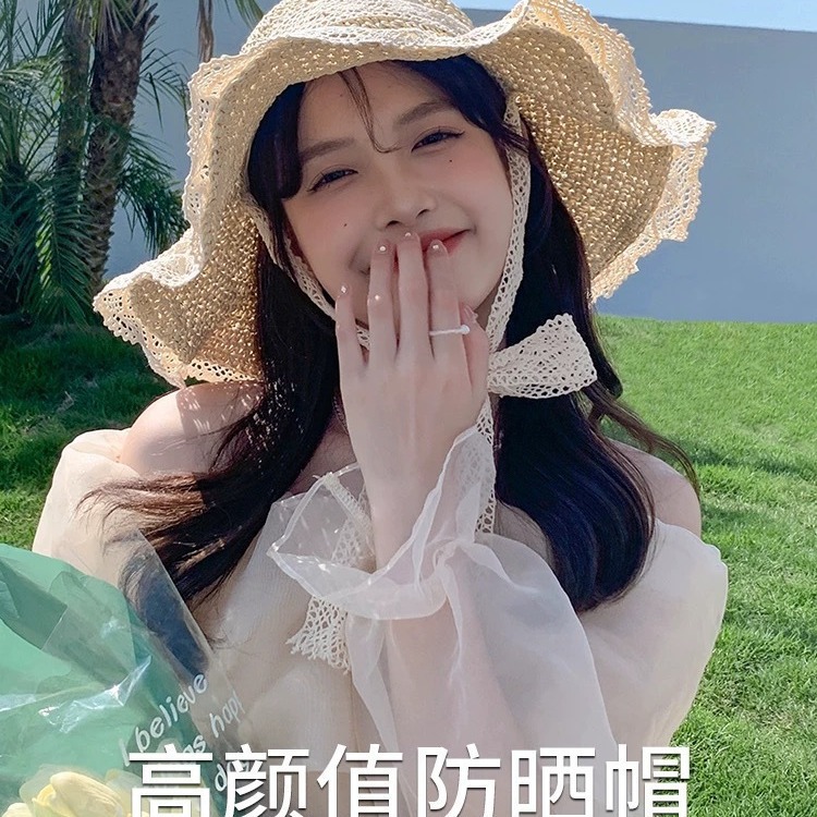 여름 레이스 장식 해변 모자, 넓은 챙 차양 밀짚모자, 통기성 밀짚 얼굴 가리개 자외선 차단 모자 (성인용)