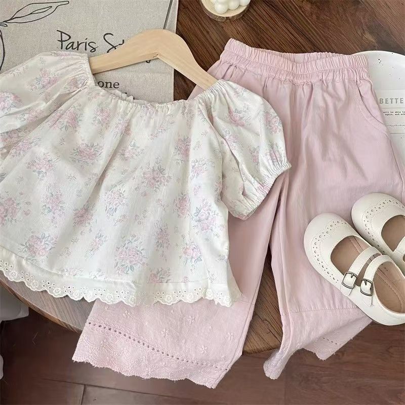 여름 세트 모리 소녀의 아기 핑크 레이스 스트레이트 팬츠 플로럴 탑 한국식 어린이 투피스 세트