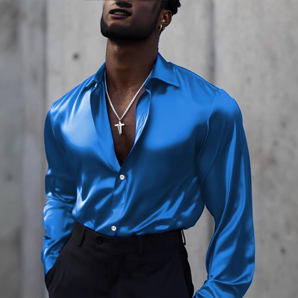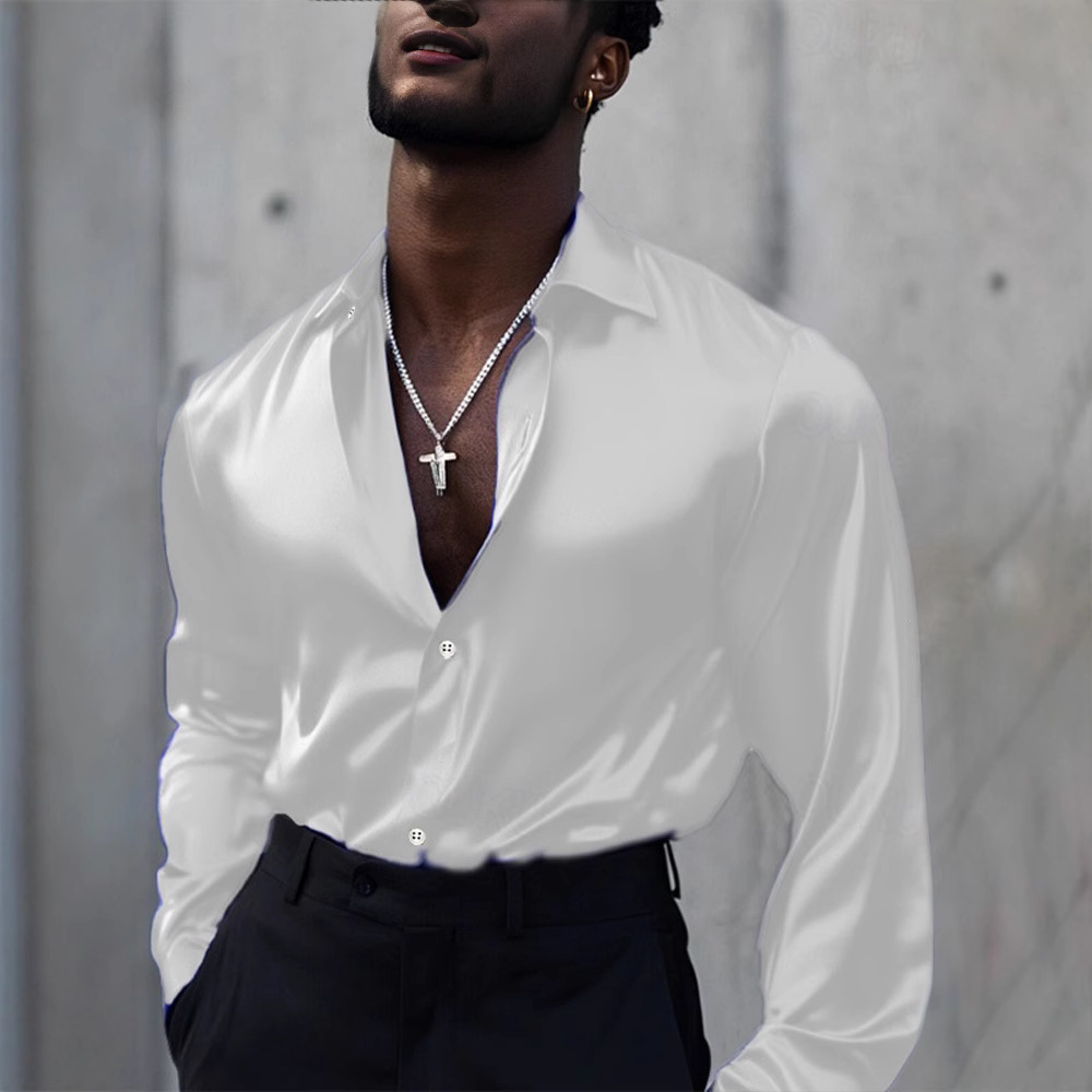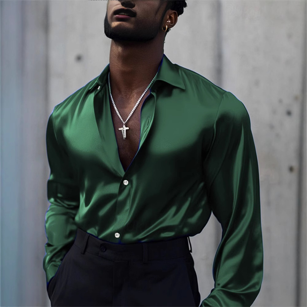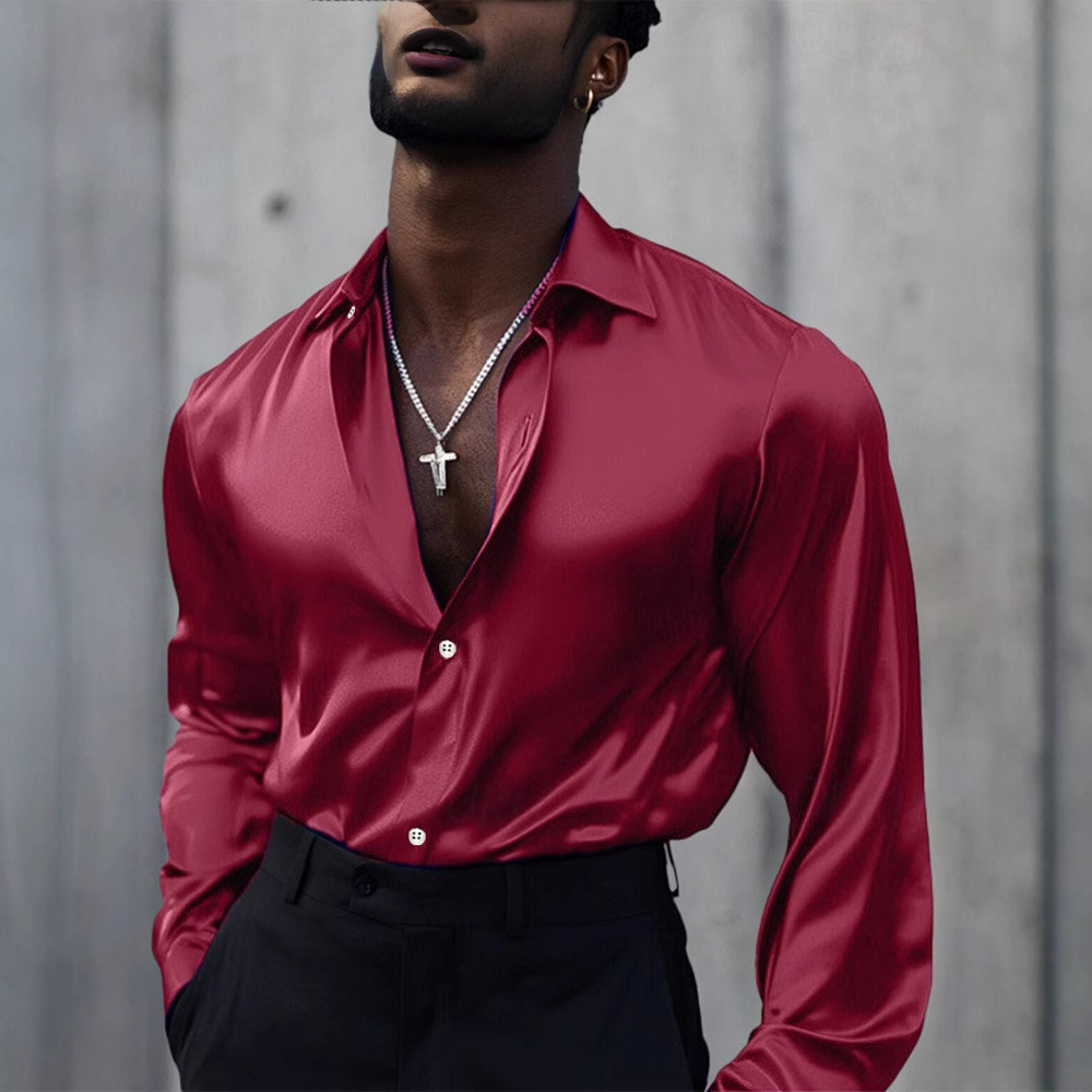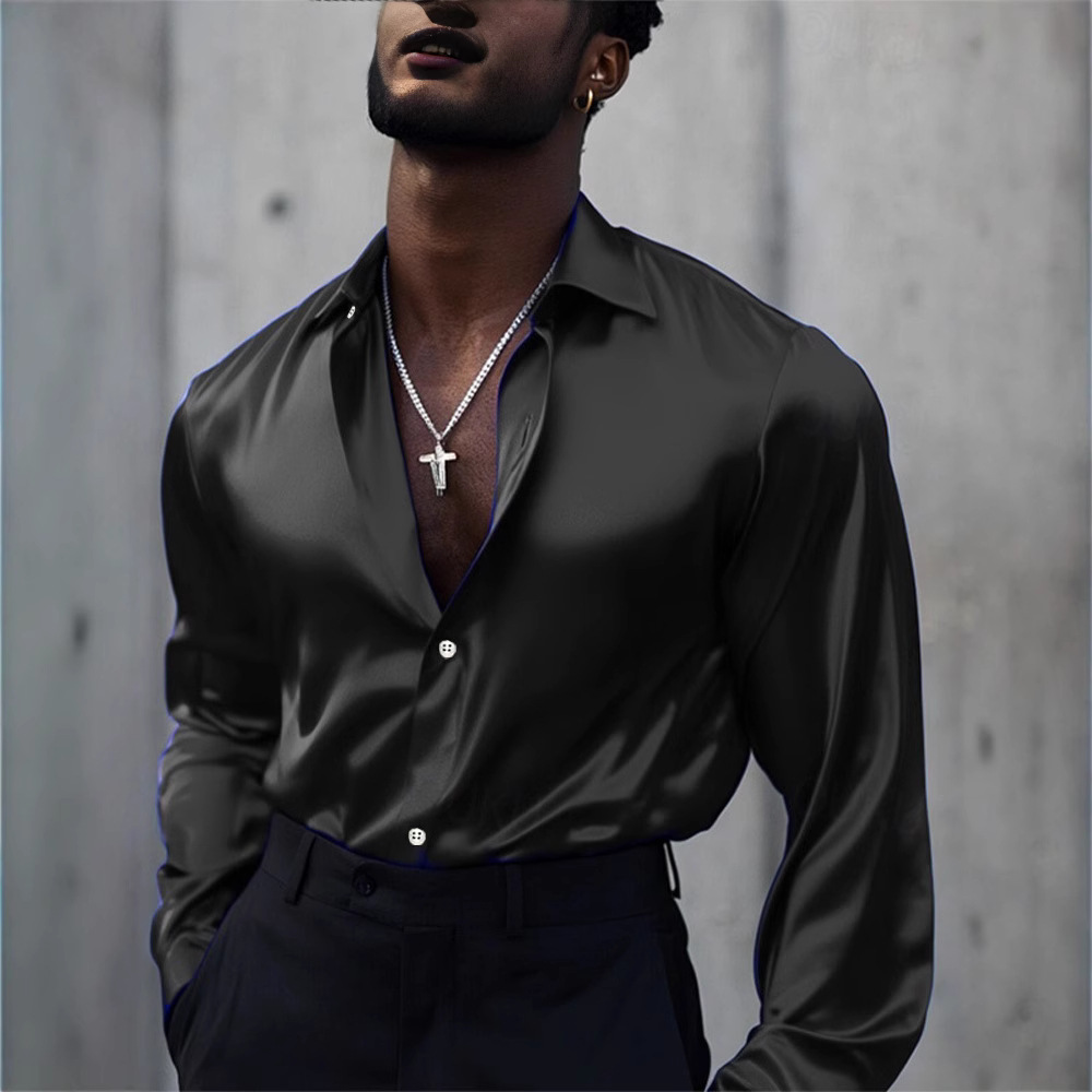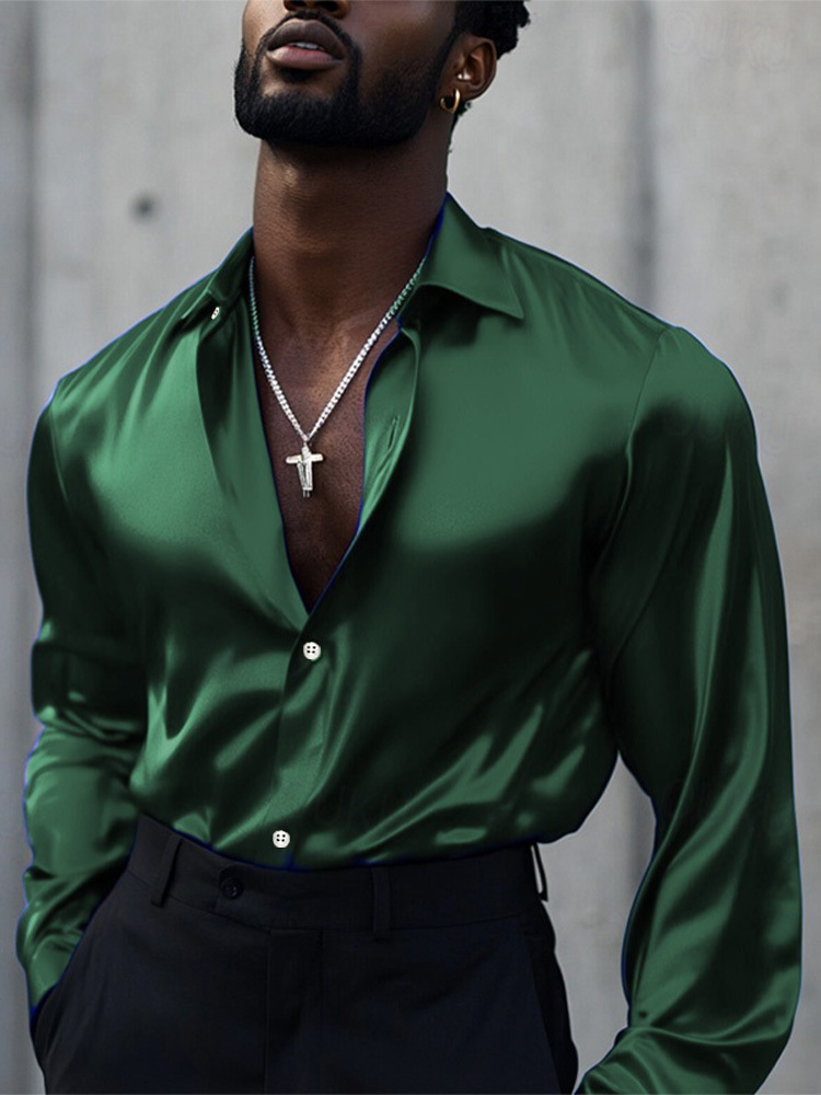 아마존 봄과 가을 새로운 유럽과 미국 남성의 단색 긴 소매 셔츠 홈 캐주얼 실키 패션 셔츠 국경 남성