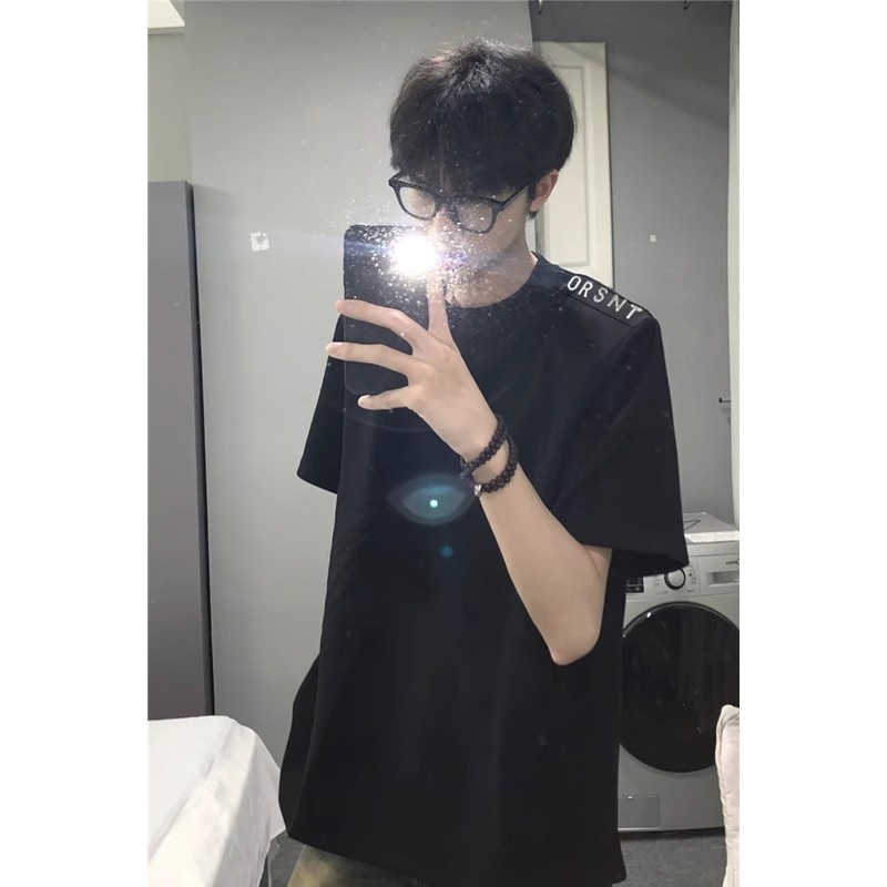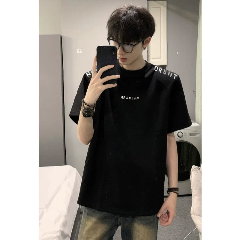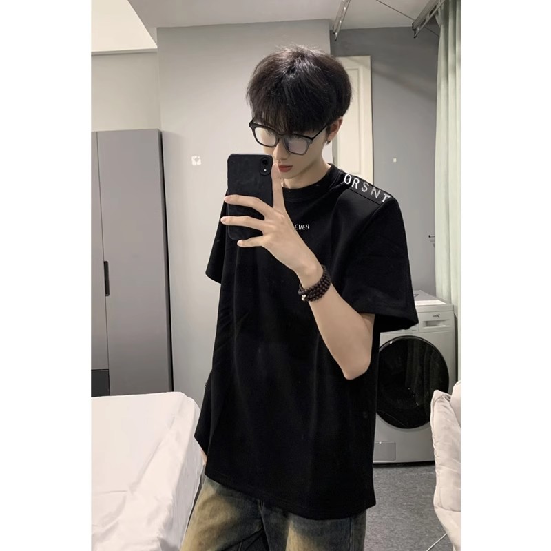 디자인 센스 패드 어깨 반팔 티셔츠 남성용 느슨한 무거운 편지 인쇄 탑 여름 트렌디 브랜드 통일부 반팔 티셔츠스토어 가기