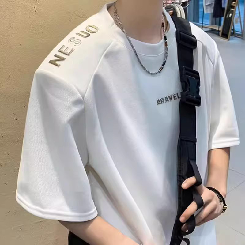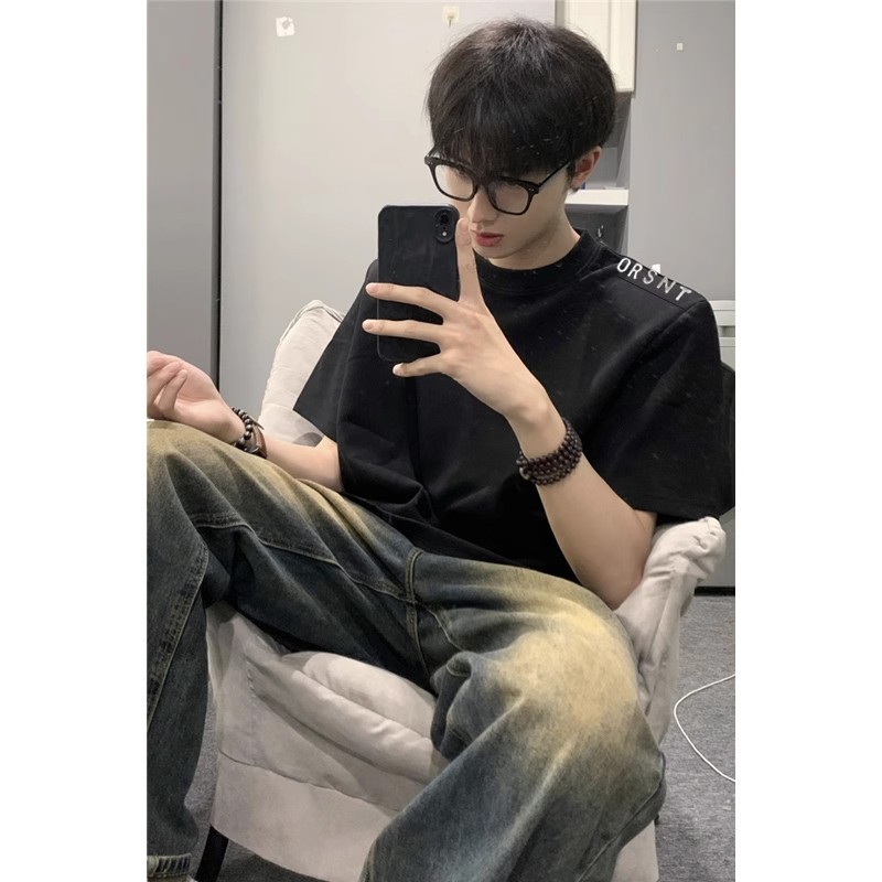 디자인 센스 패드 어깨 반팔 티셔츠 남성용 느슨한 무거운 편지 인쇄 탑 여름 트렌디 브랜드 통일부 반팔 티셔츠