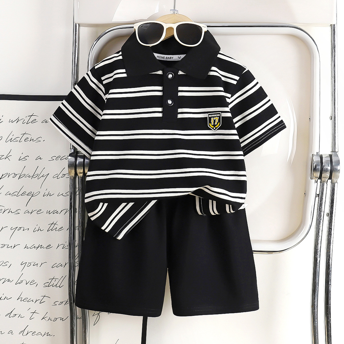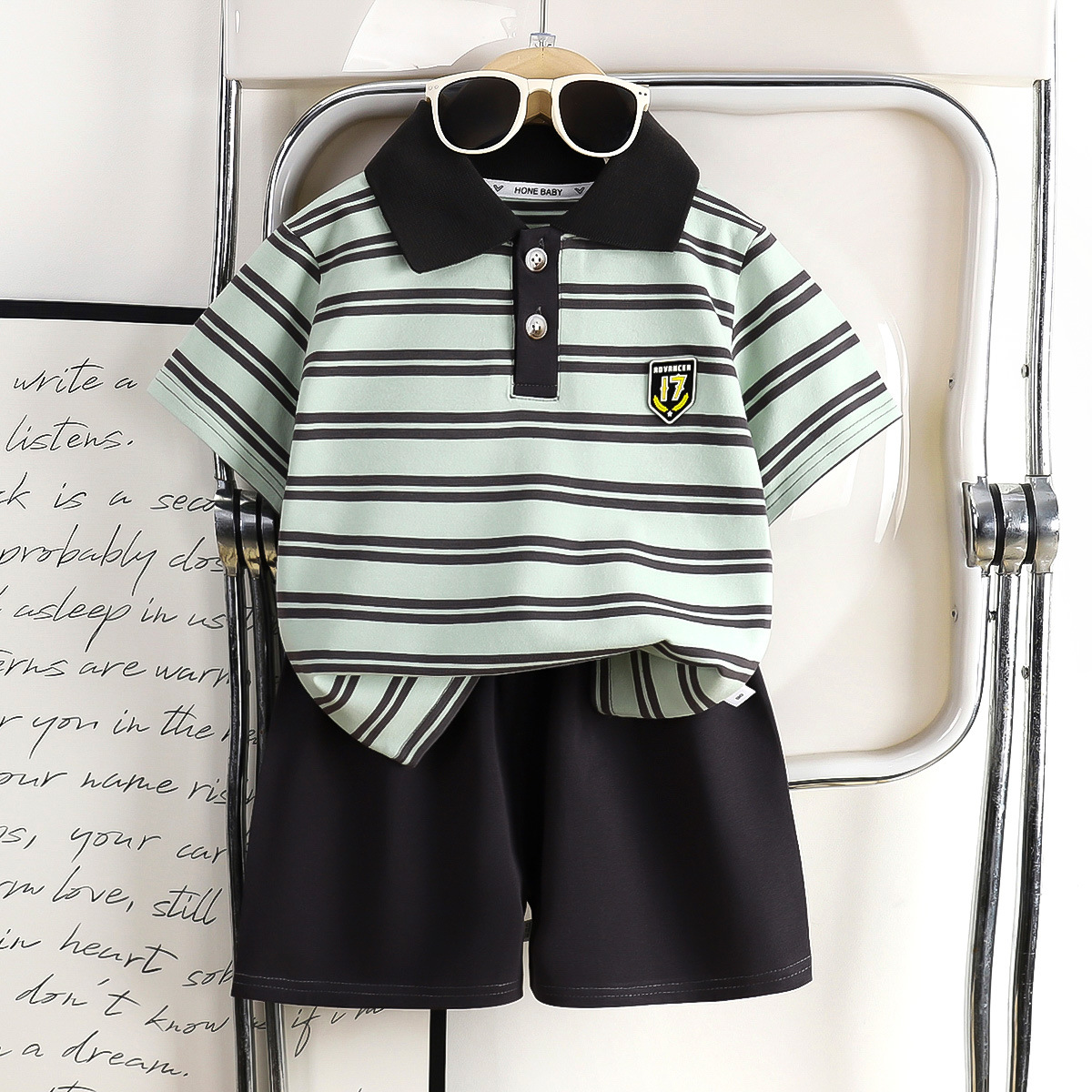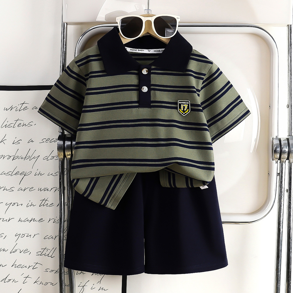 여름 새 소년 옷깃 줄무늬 짧은 소매 세트 소년 아기 캐주얼 스포츠 반바지 투피스 아동복 도매