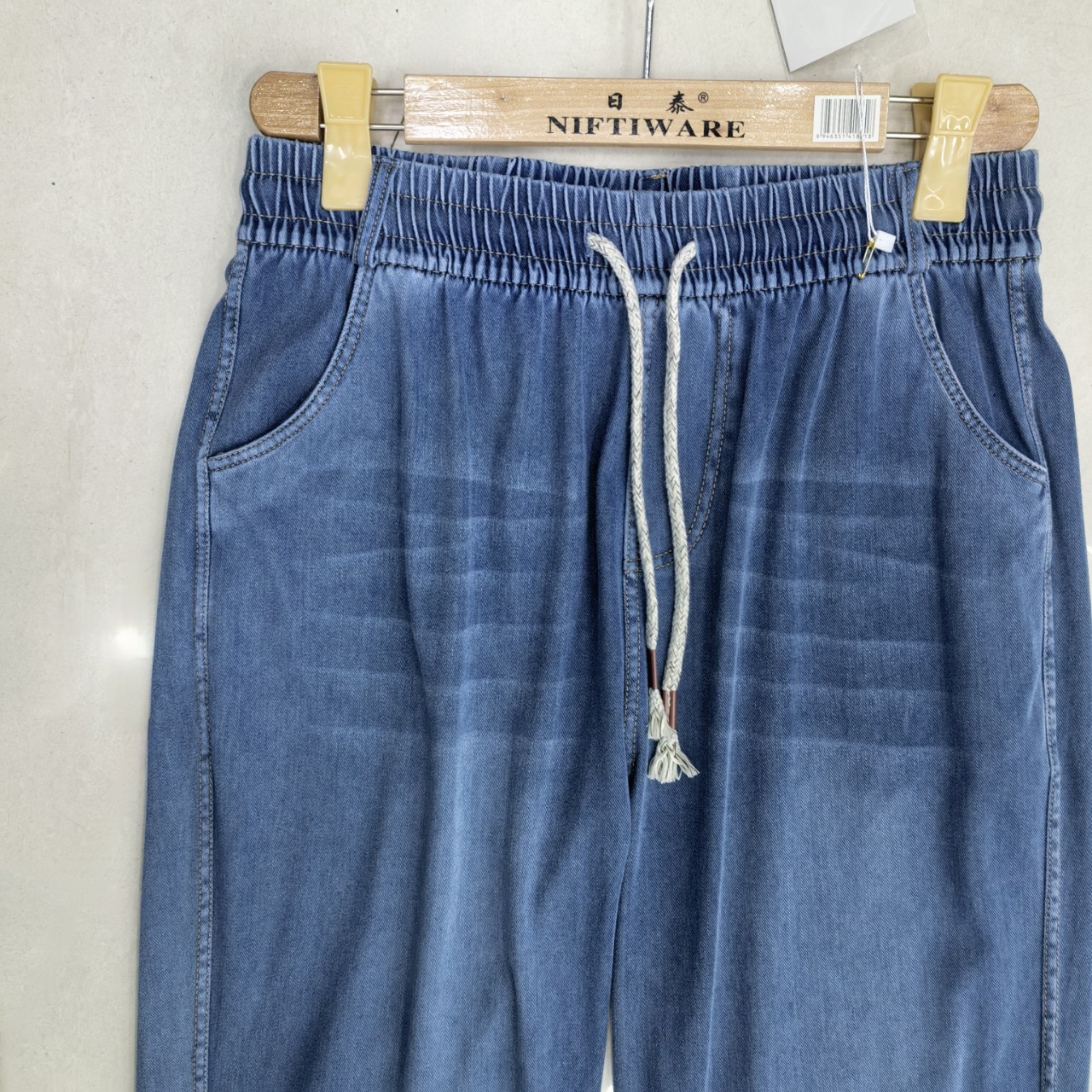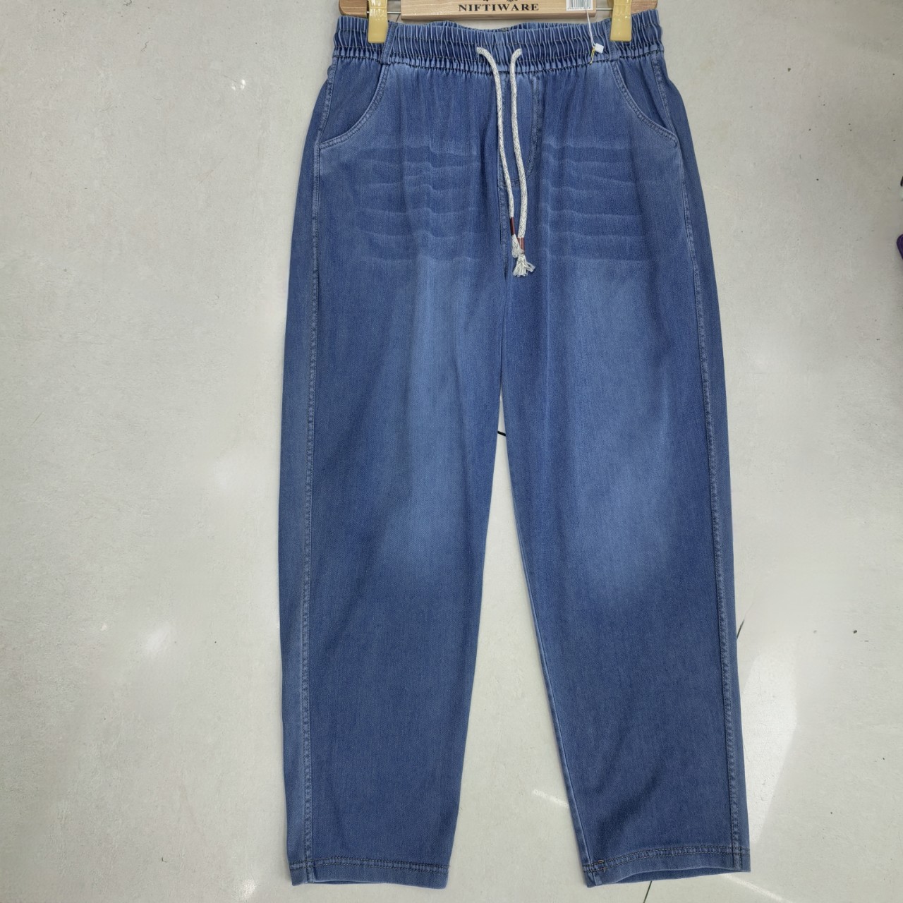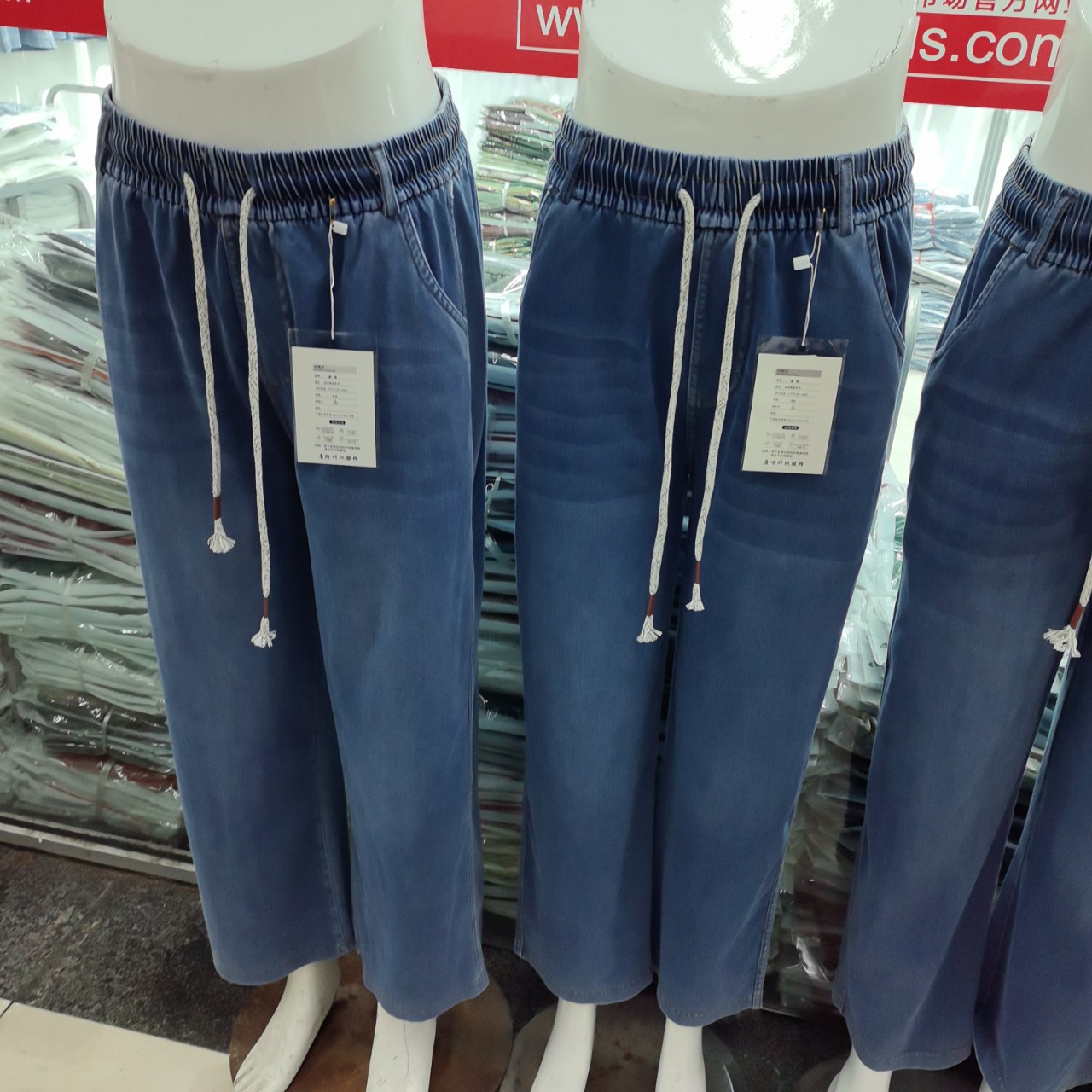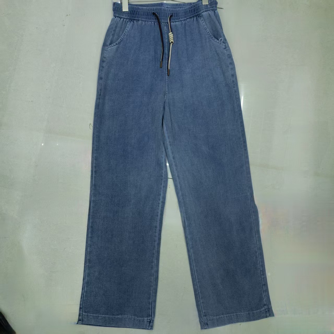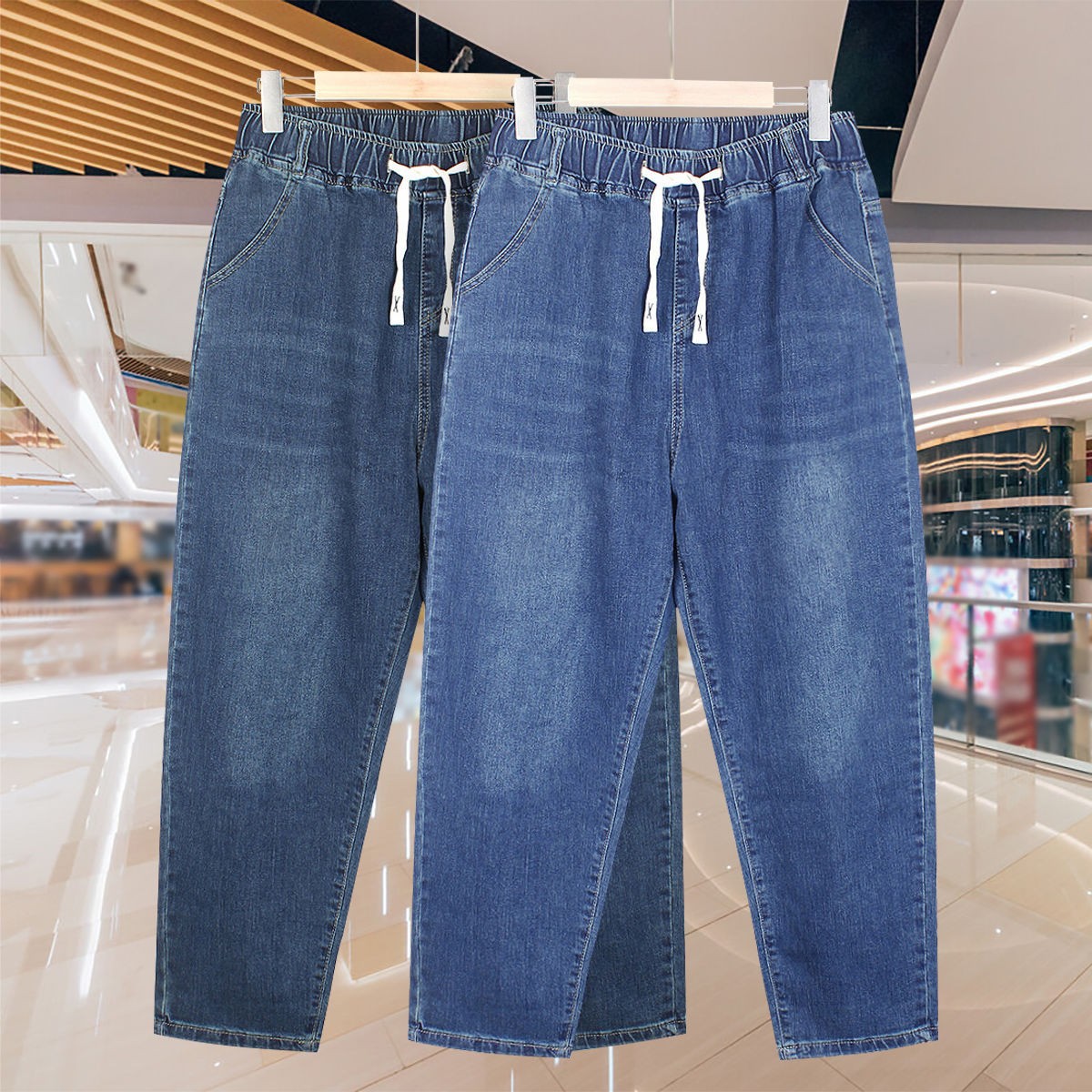 2025 여름 새로운 스트레치 탄성 허리 청바지 여성의 높은 허리 느슨한 스트레치 플러스 사이즈 스트레이트 바지스토어 가기
