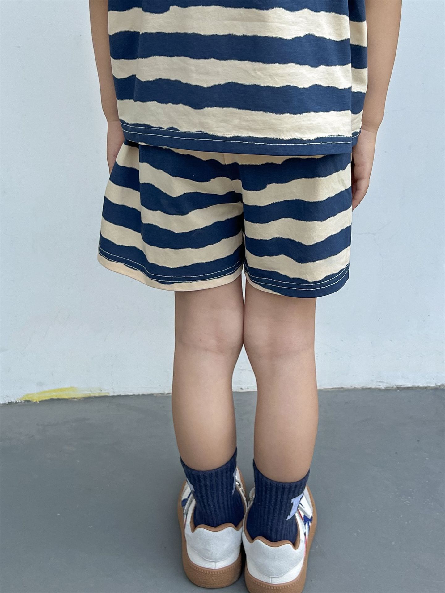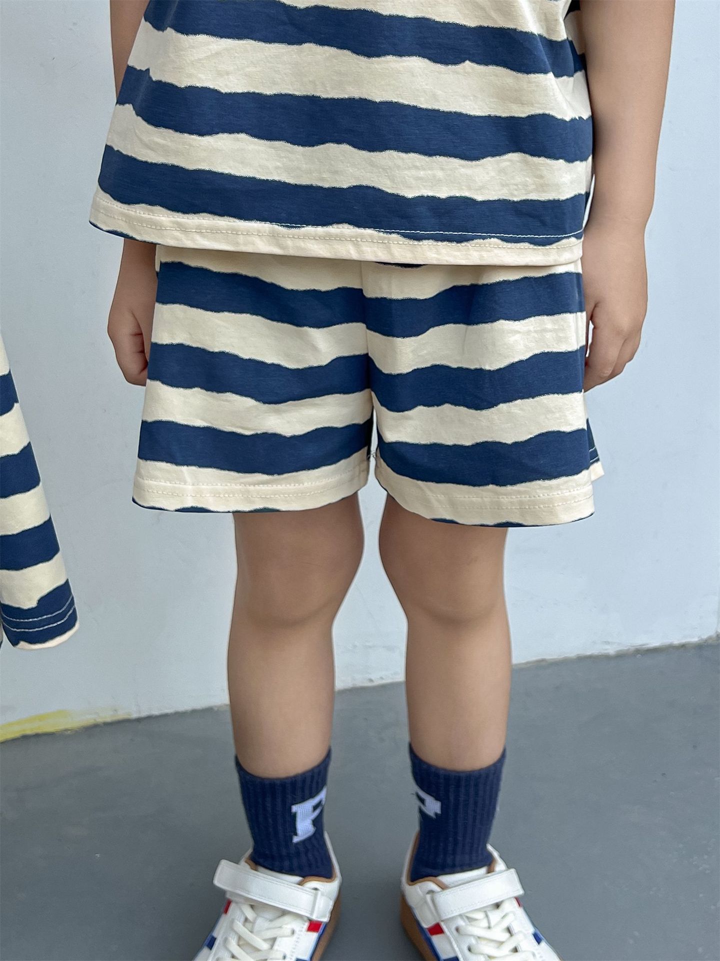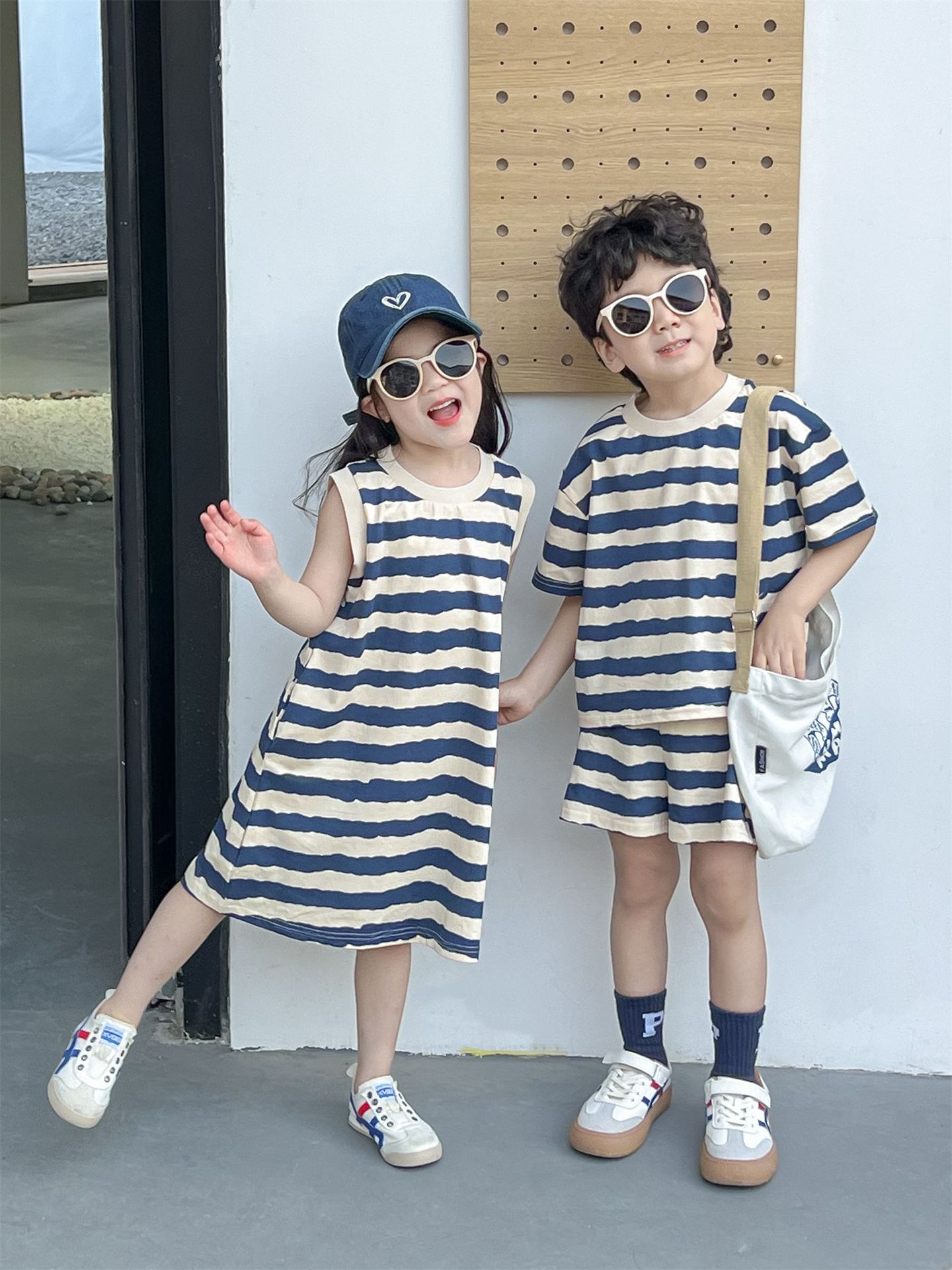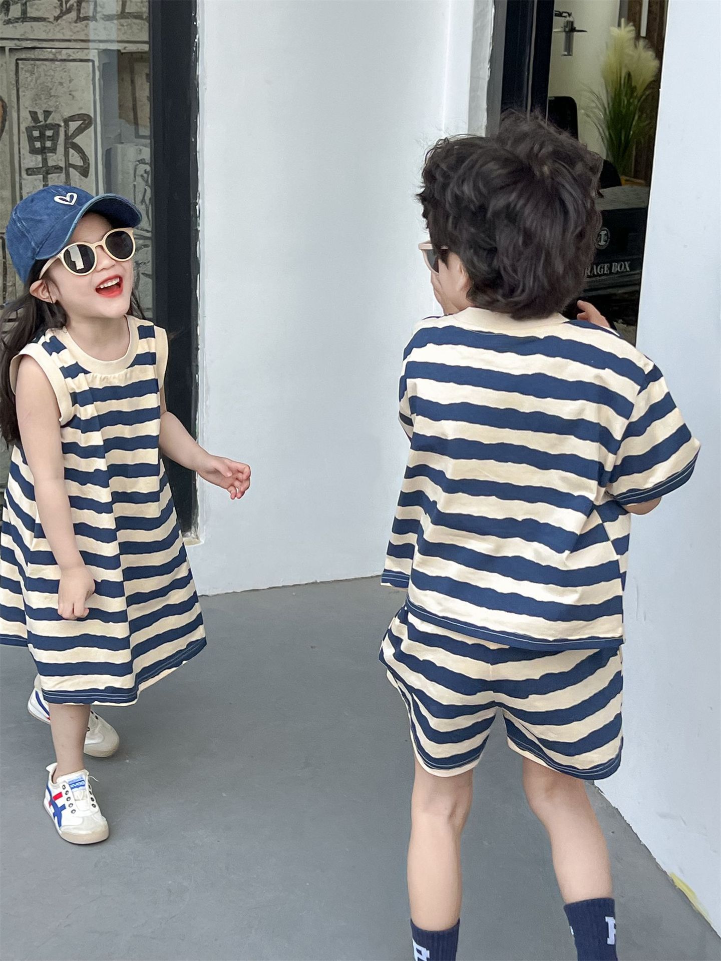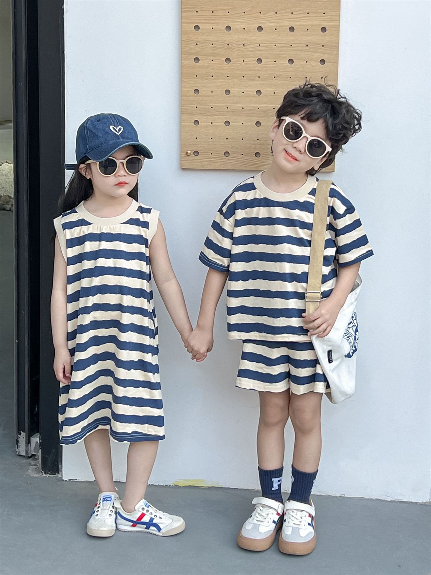 2025 년 여름 새로운 한국 여자 줄무늬 민소매 원피스 서양식 소년 짧은 소매 투피스 세트