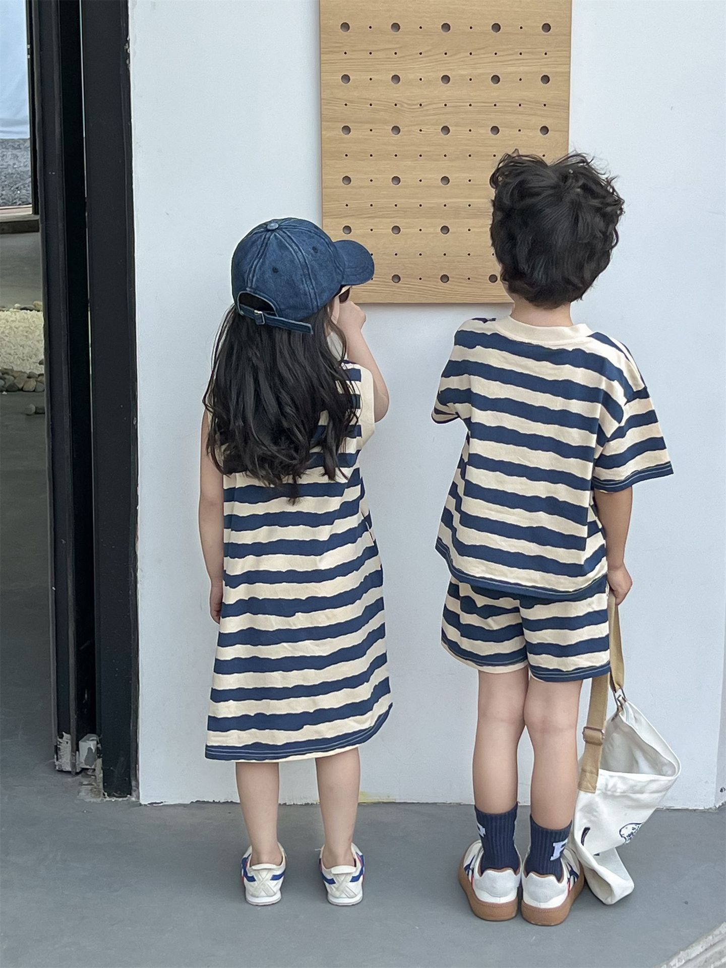 2025 년 여름 새로운 한국 여자 줄무늬 민소매 원피스 서양식 소년 짧은 소매 투피스 세트스토어 가기