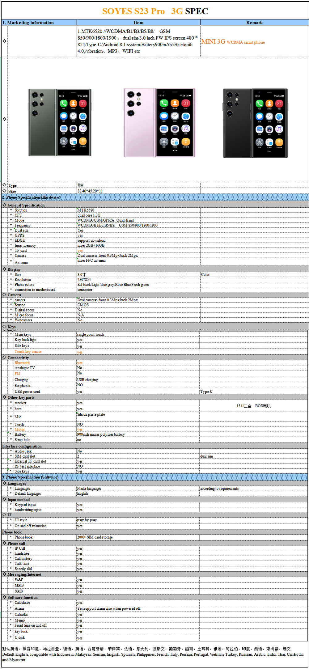 SOYES Suo Ye S23pro 국경 미니 전화 듀얼 카드 쿼드 코어 구글 3G 안드로이드 스마트 소형 전화스토어 가기