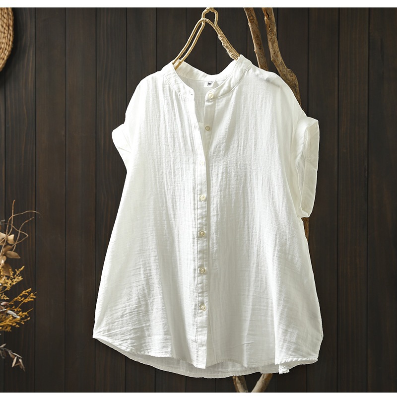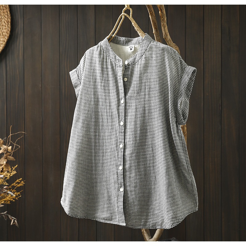 25 일 예술적 여름 새면 및 리넨 스타일 여성용 칼라 루즈 핏 반팔 더블 레이어 코튼 셔츠 민소매 셔츠