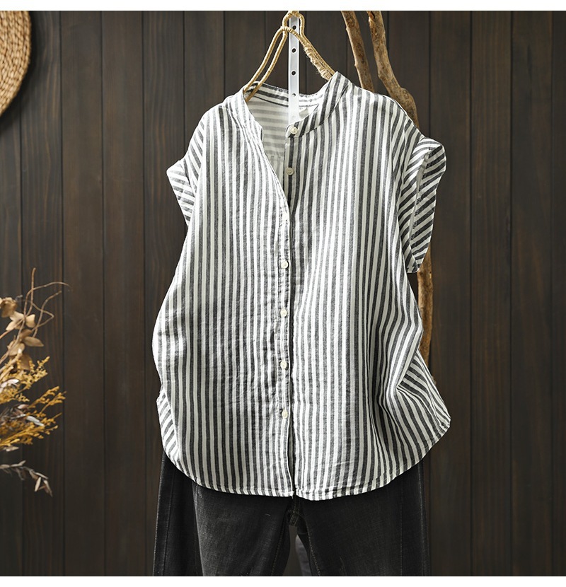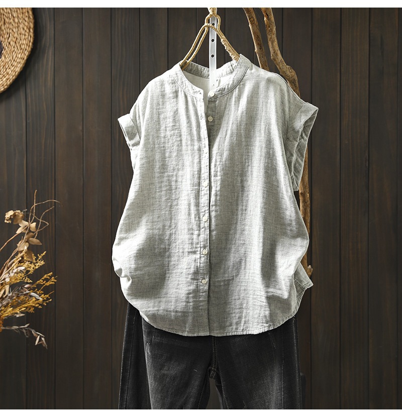 25 일 예술적 여름 새면 및 리넨 스타일 여성용 칼라 루즈 핏 반팔 더블 레이어 코튼 셔츠 민소매 셔츠스토어 가기