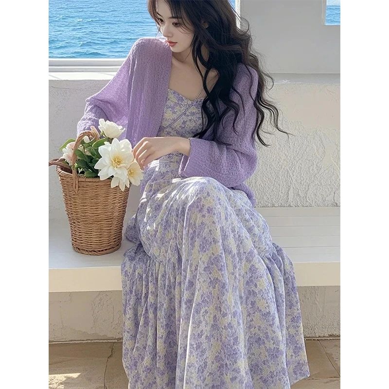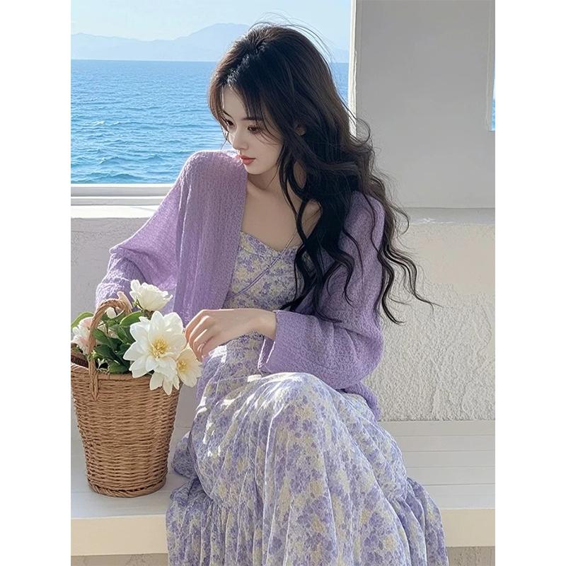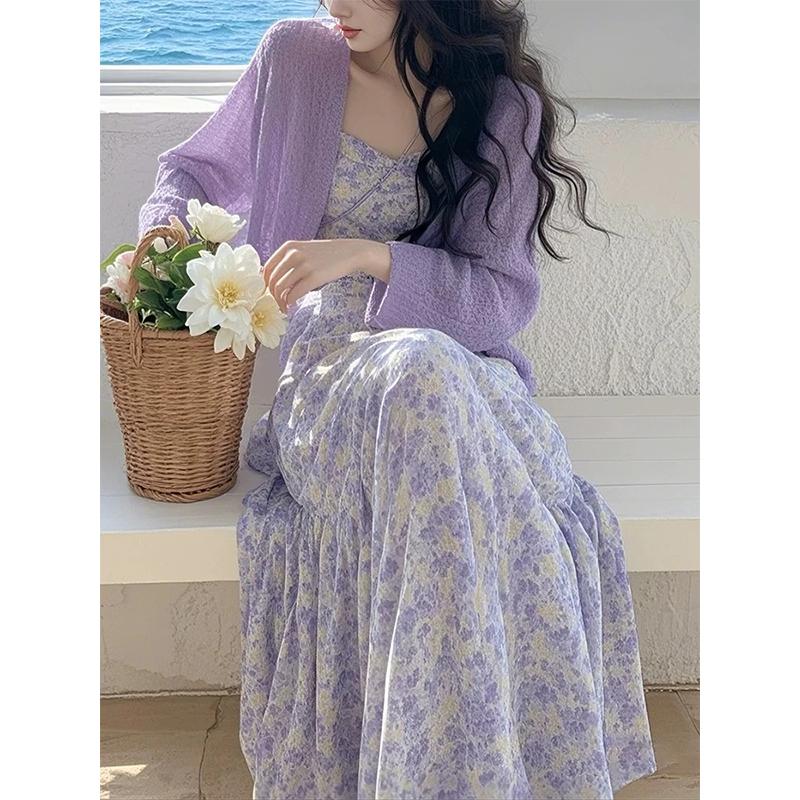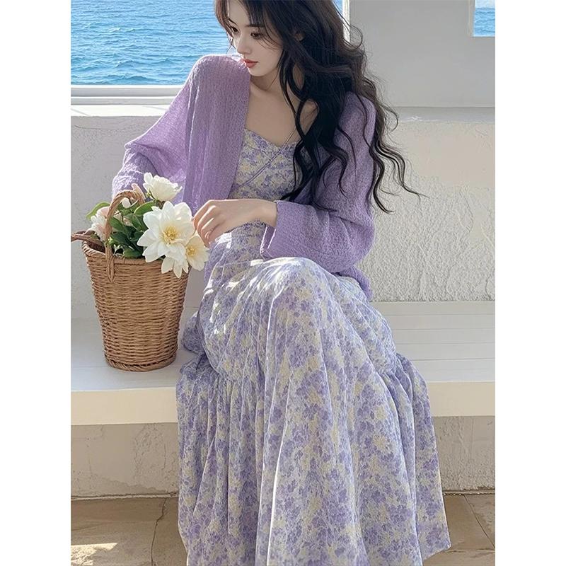 • 보라색 가디건 + 꽃무늬 서스펜더 스커트