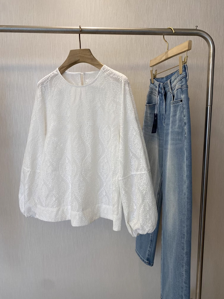 Yuan Yuan의 법률 목록!!! 거대한 추천 ~ 우아한 둥근 목 자수 자카드 랜턴 슬리브 면 셔츠 최고 여성