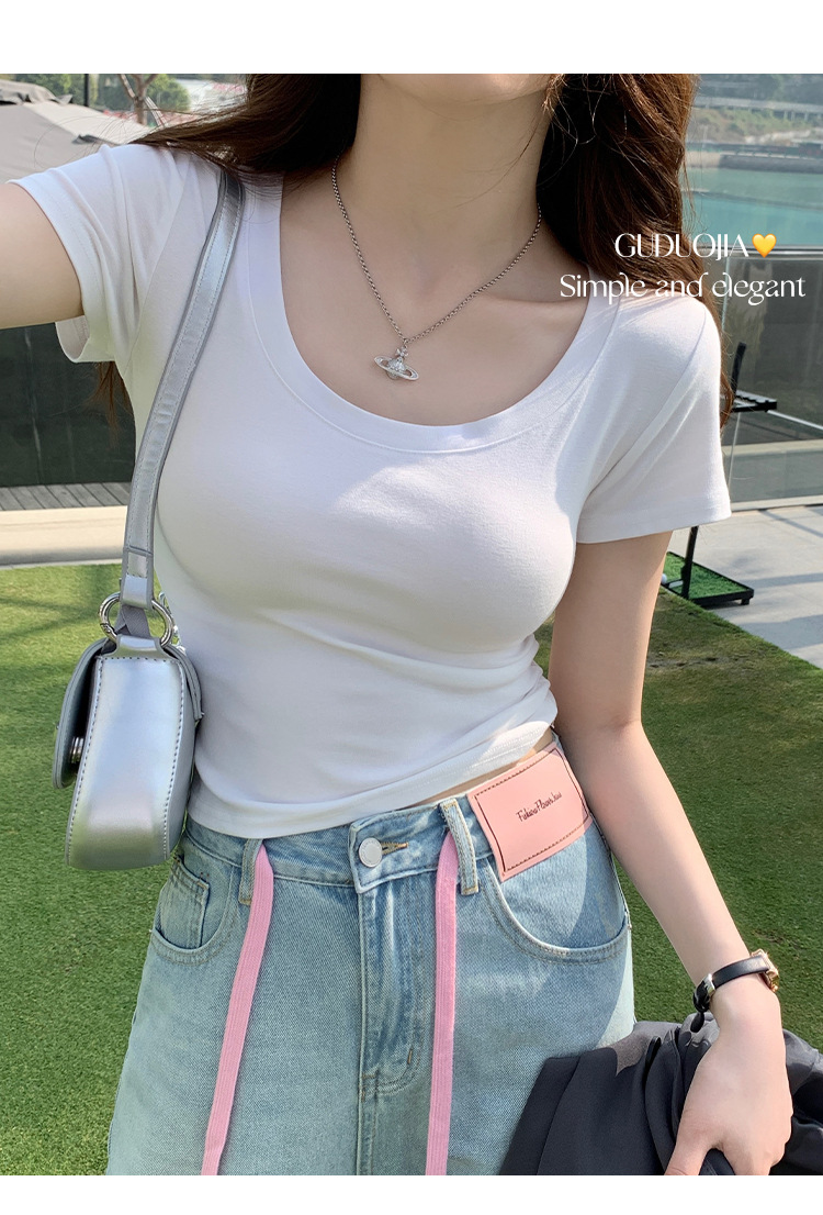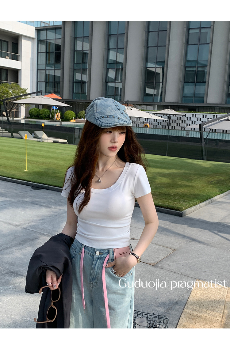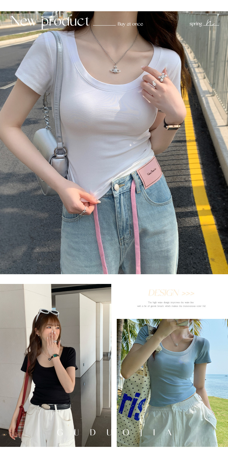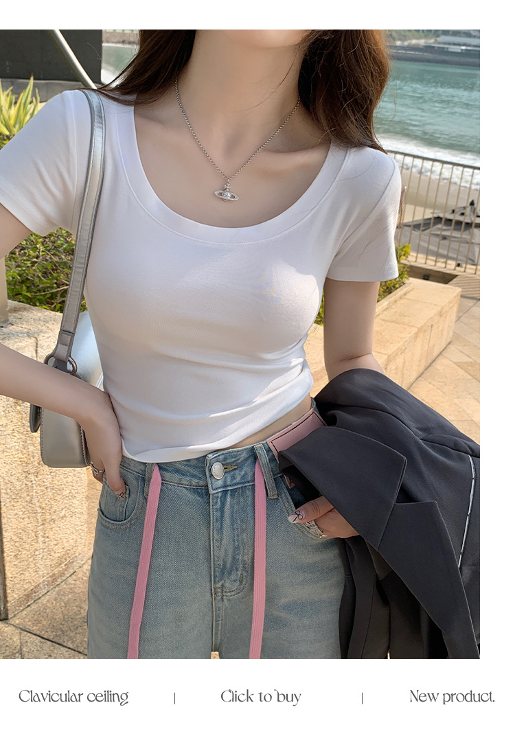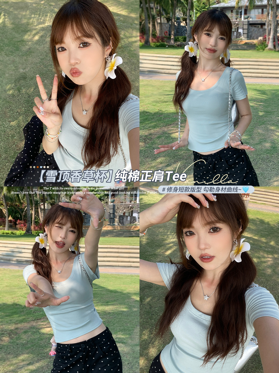 여성 반팔 어깨 티셔츠 여름 2025 뉴 블루 도파민웨어 슬림 핏 U 칼라 화이트 쇼트 탑 트렌디